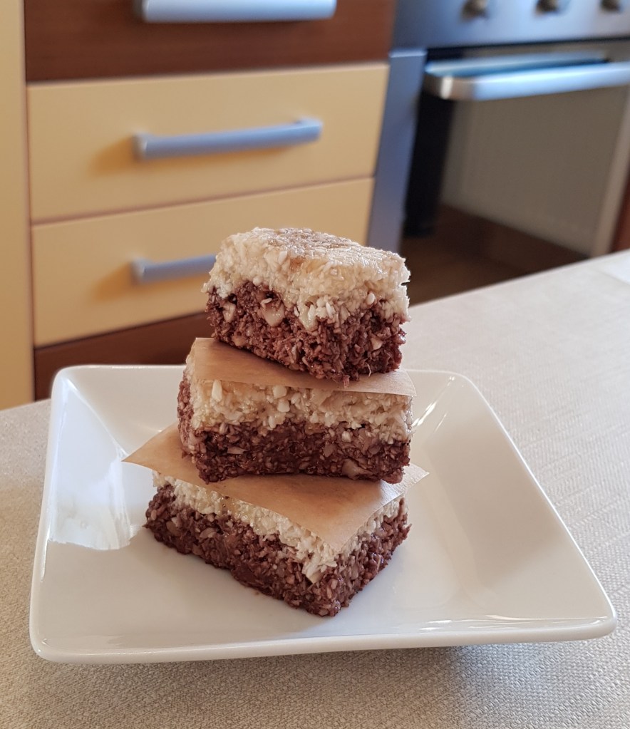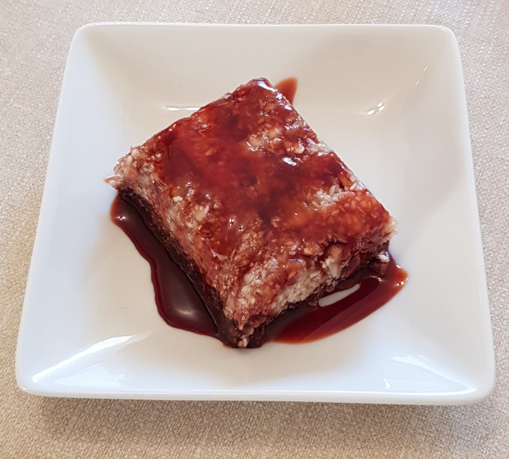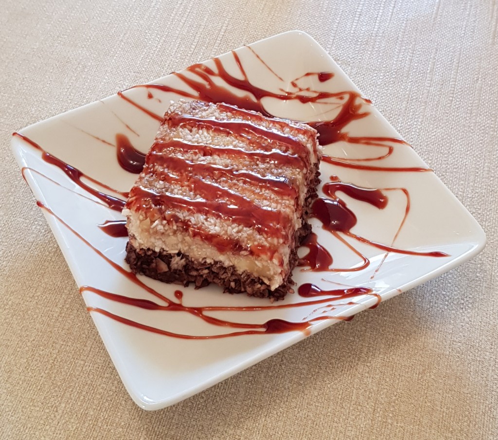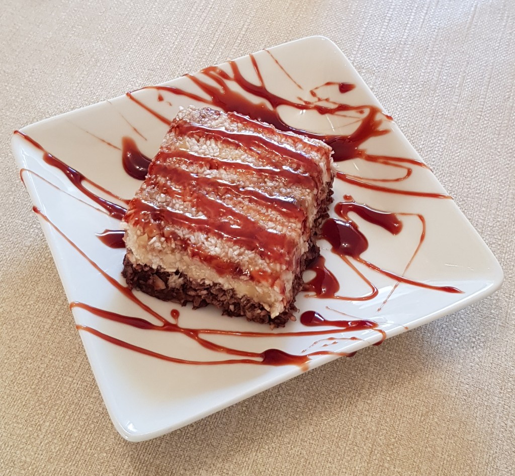 Se acoperă tava cu o folie alimentară și se pune în congelator pentru minim 2 ore. Înainte de feliere se scoate cu 30 de minute din congelator. Se decorează cu fructe proaspete. Eu am ales afinele pentru decor și un sos de curmale bio. Se păstrează până la o lună în congelator, dacă rezistați atât timp. Un desert delicios și sănătos 😋