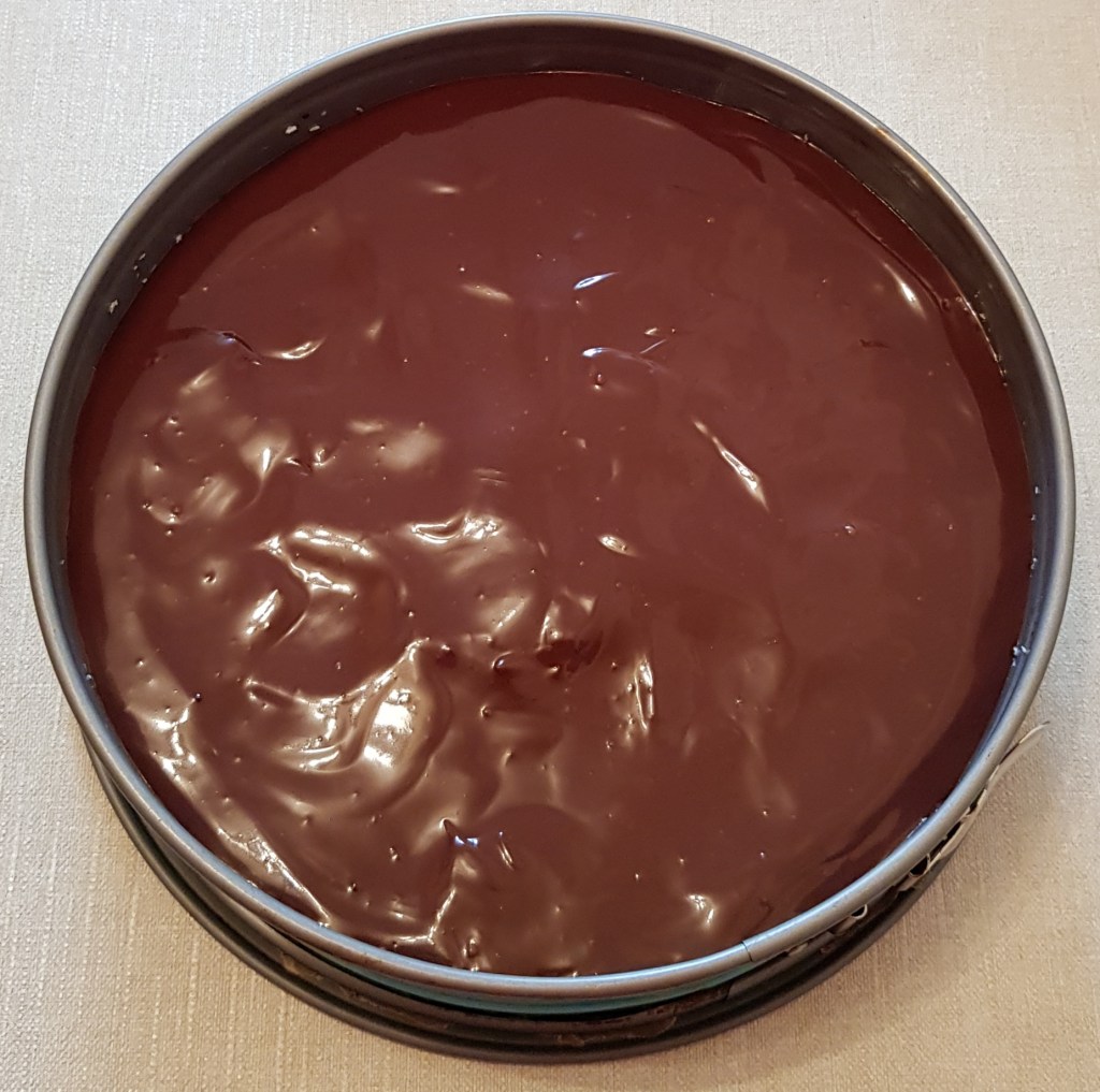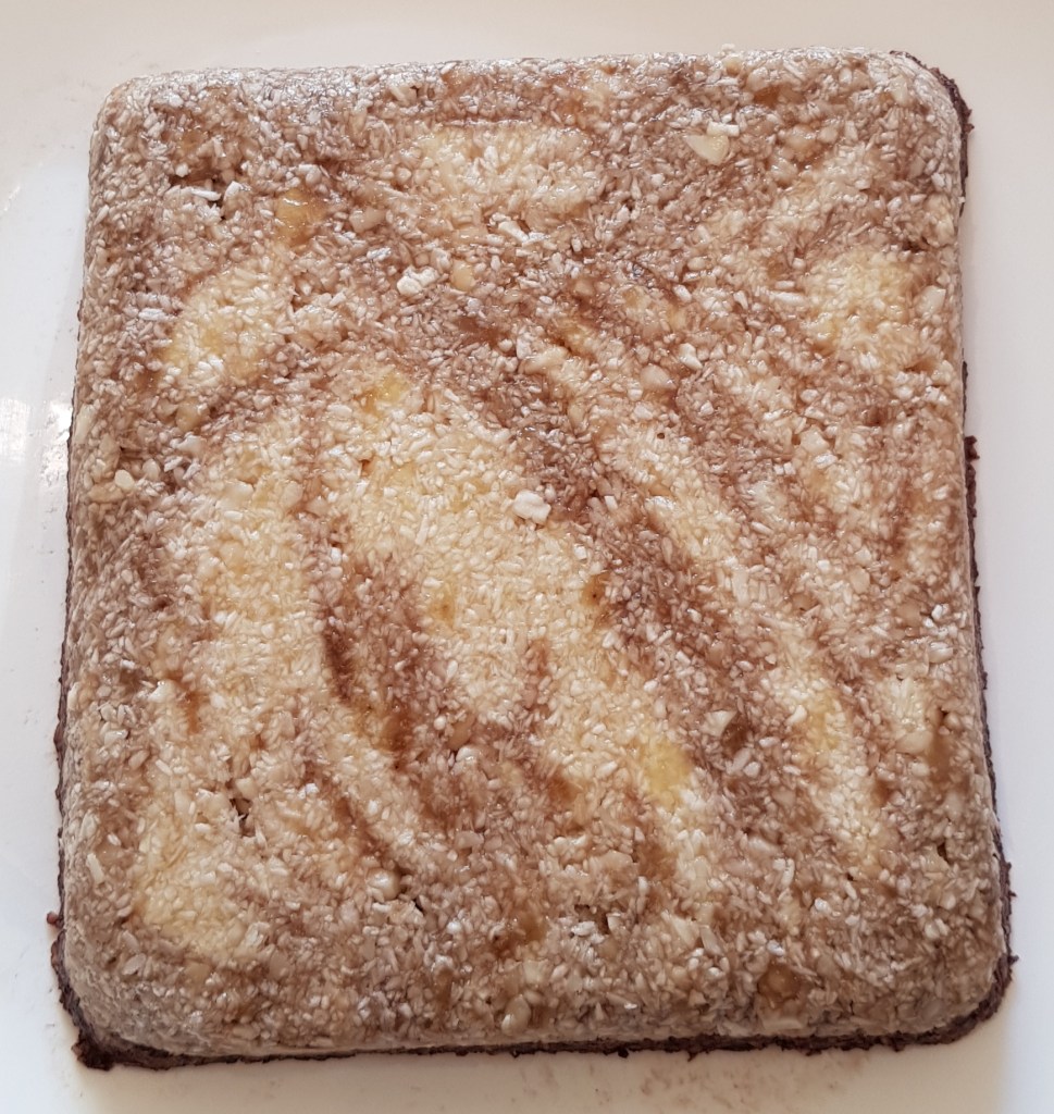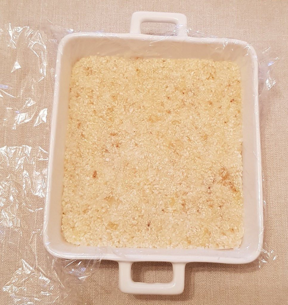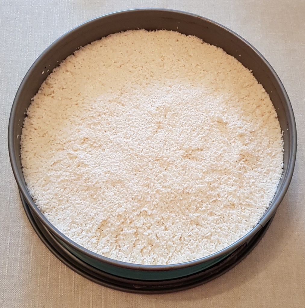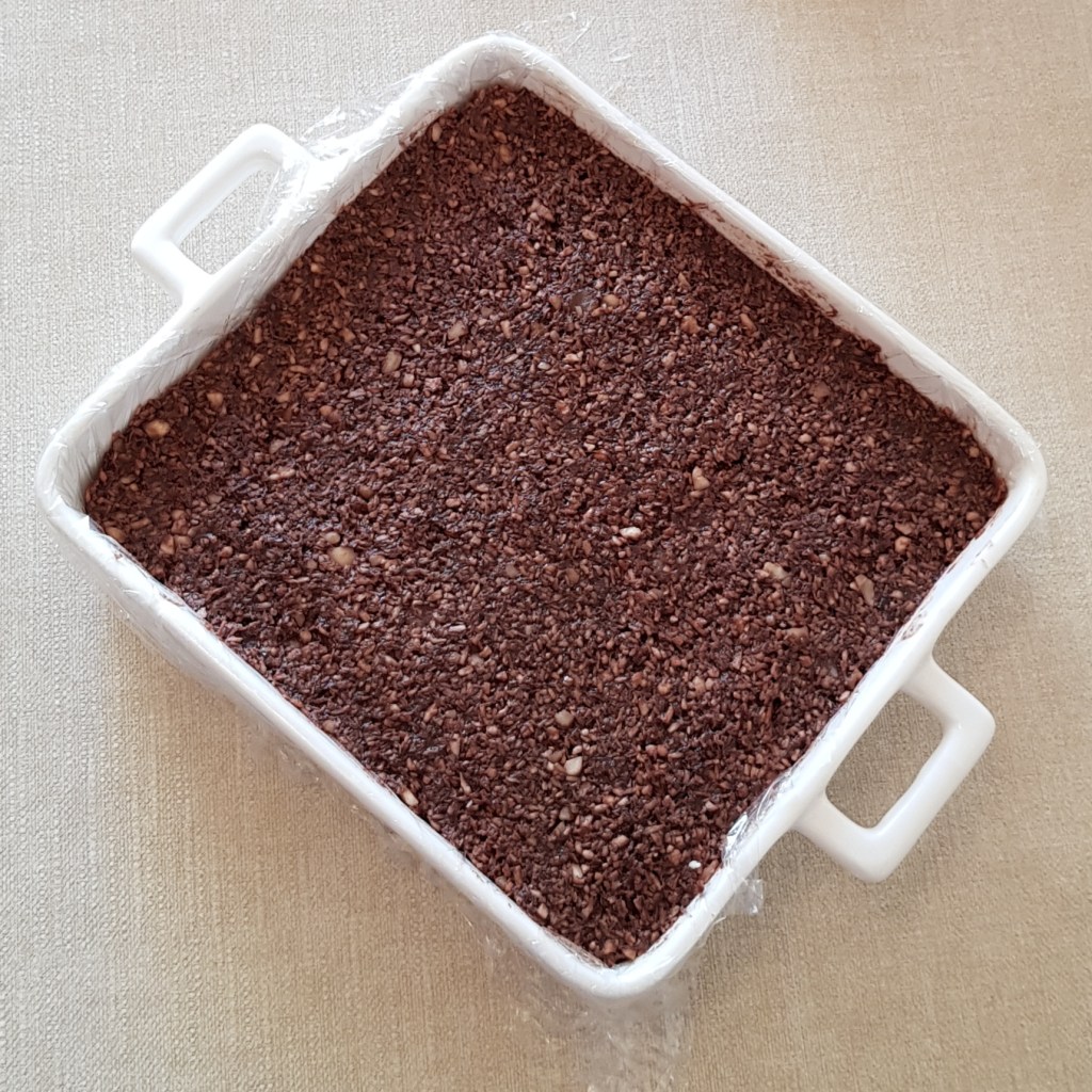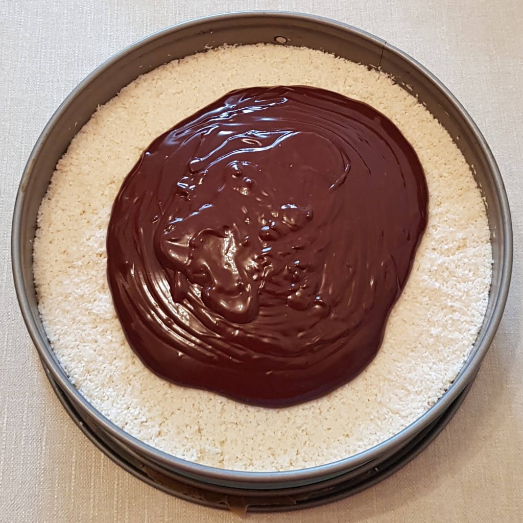 Pentru blat se adaugă în vasul unui robot de bucătărie migdalele, curmalele, fulgii de cocos, cacao, praful de sare. Se mixează până se obține fărâmituri. Apoi se adaugă 2-3 linguri de apă și se mai mixează până se obține un amestec lipicios. Se adaugă aluatul într-o formă cu pereți detașabili. Se presează ușor cu o lingură, apoi se pune tava deoparte până la prepararea cremei.