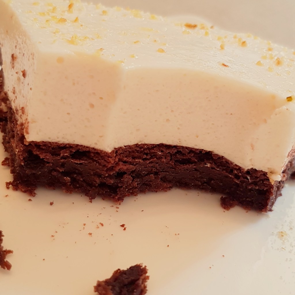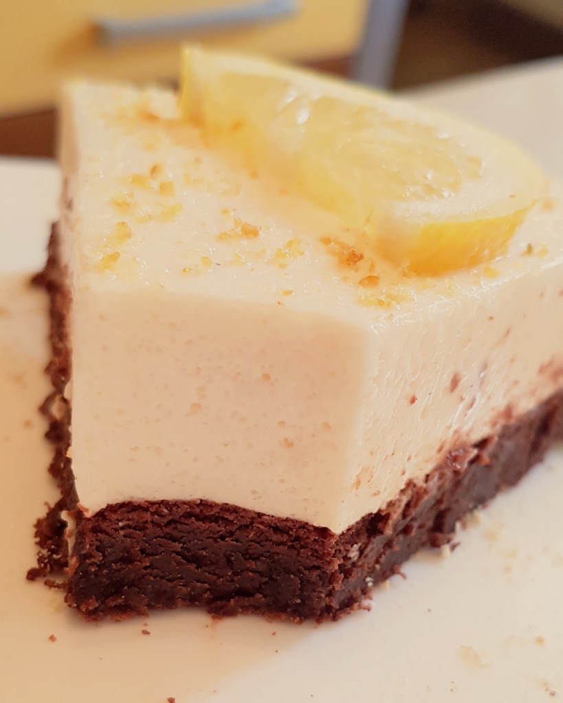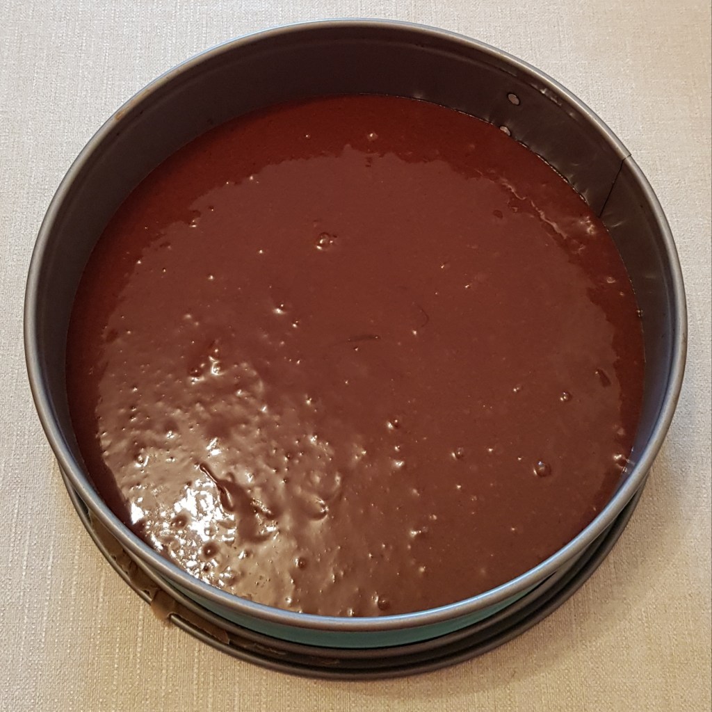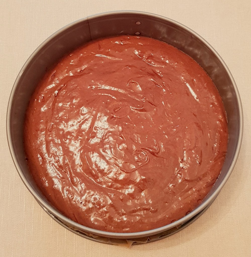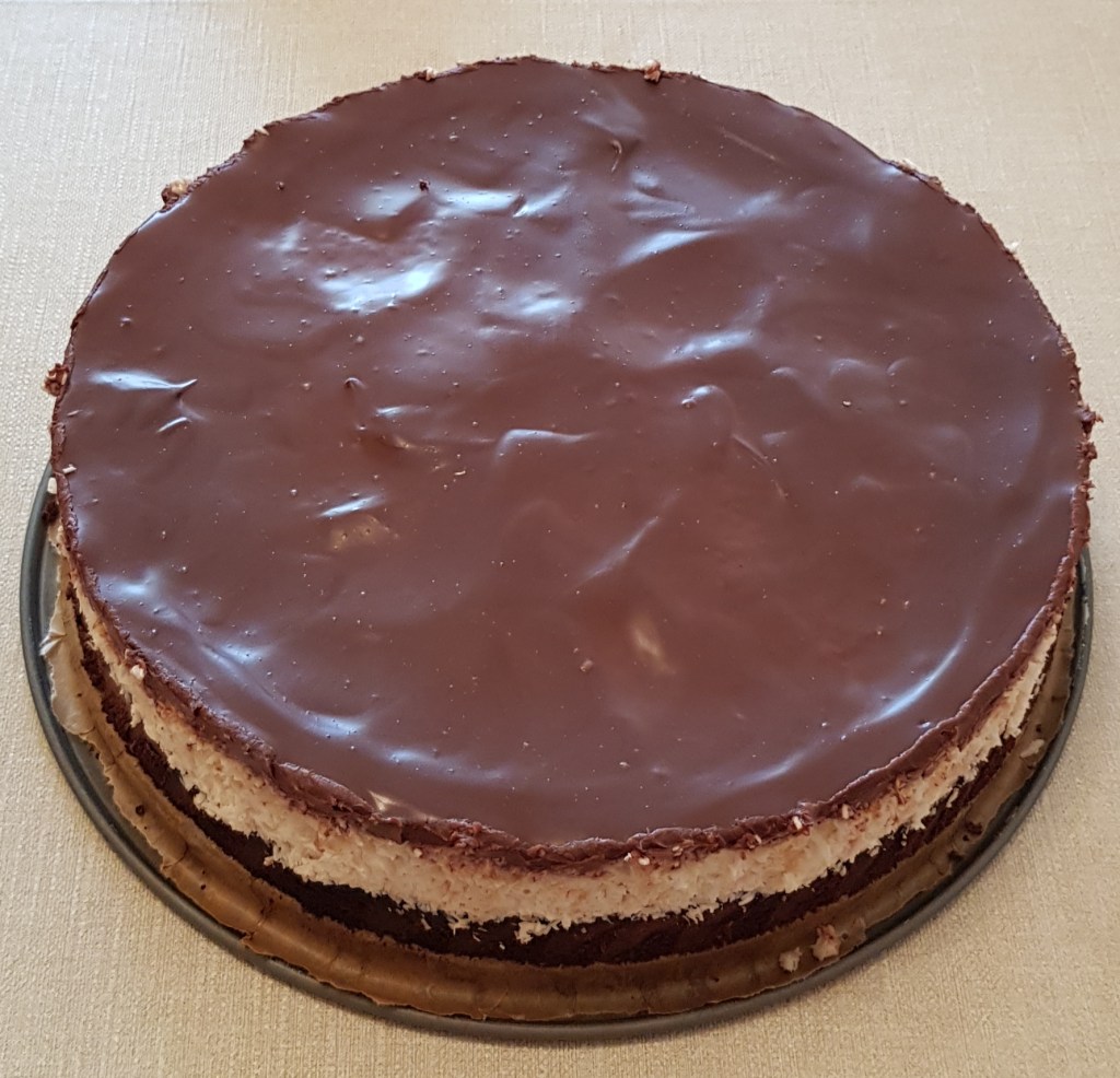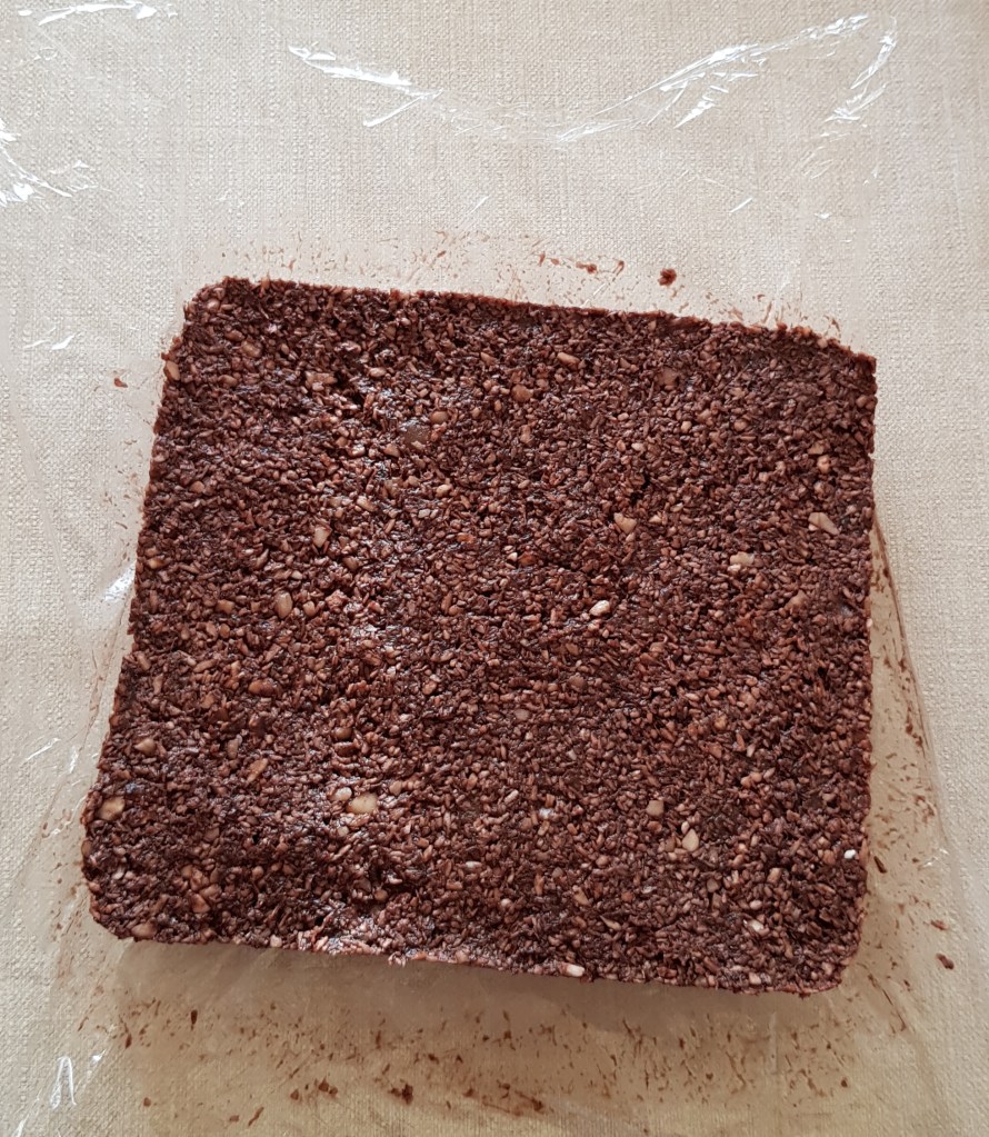 Pentru blat se adaugă în vasul unui robot de bucătărie migdalele, curmalele, fulgii de cocos, cacao, praful de sare. Se mixează până se obține fărâmituri. Apoi se adaugă 2-3 linguri de apă și se mai mixează până se obține un amestec lipicios. Se adaugă aluatul într-o formă cu pereți detașabili. Se presează ușor cu o lingură, apoi se pune tava deoparte până la prepararea cremei.