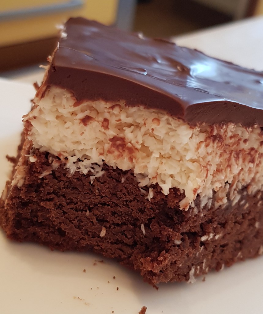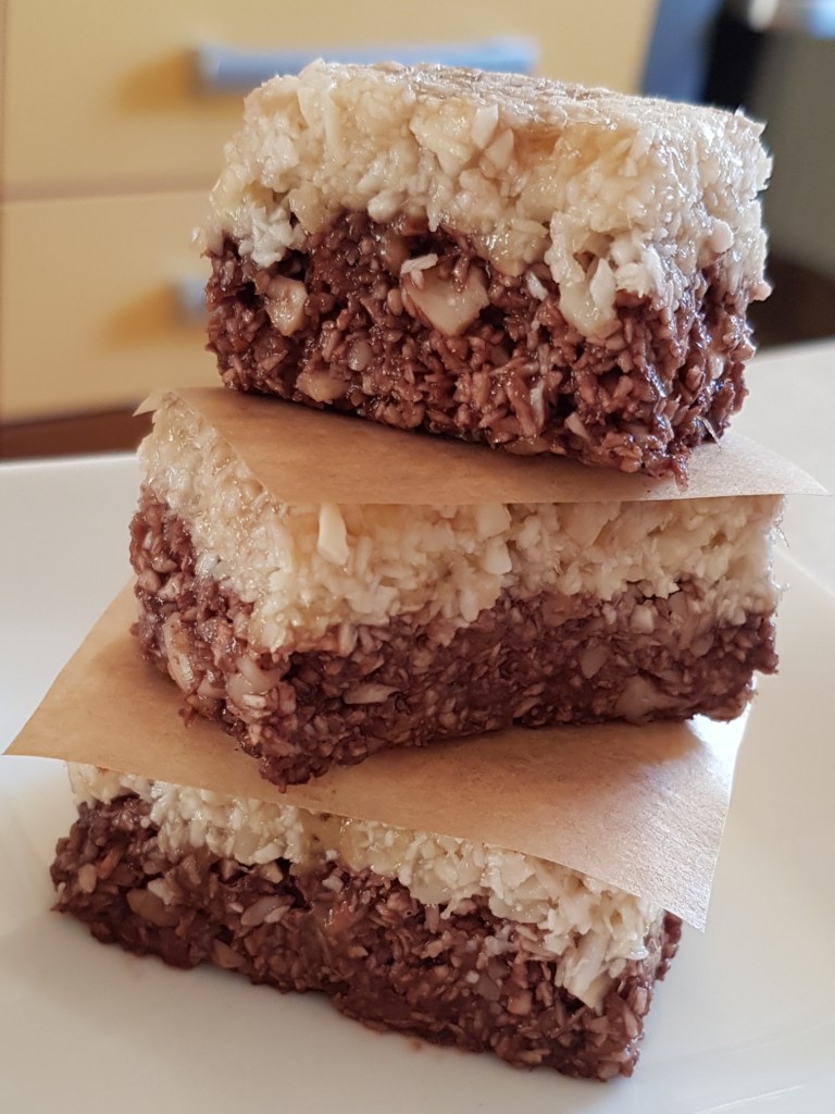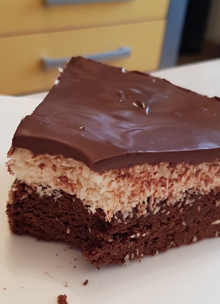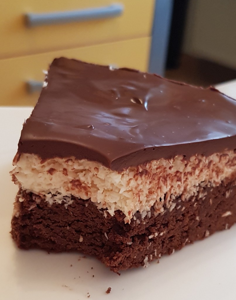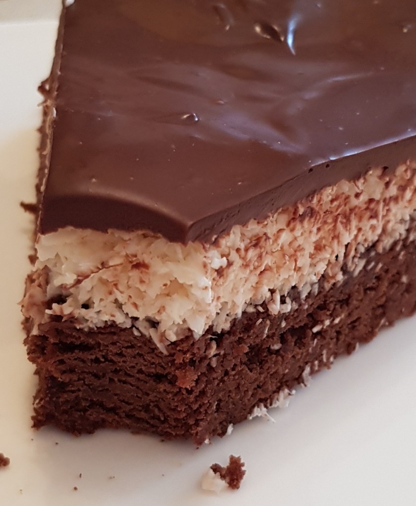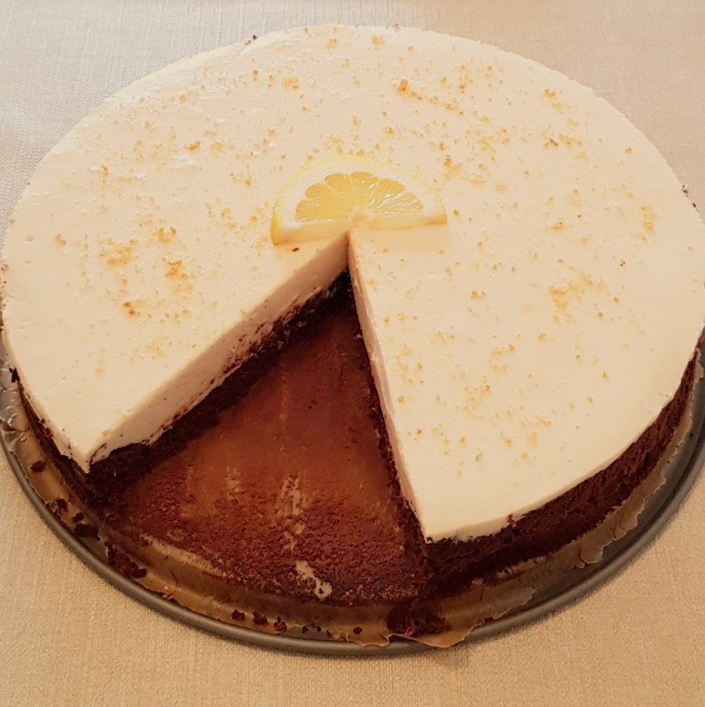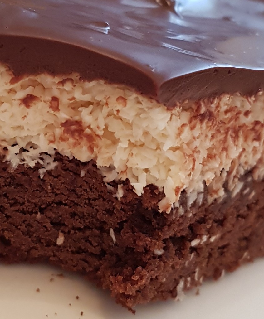 Pentru blat se adaugă în vasul unui robot de bucătărie migdalele, curmalele, fulgii de cocos, cacao, praful de sare. Se mixează până se obține fărâmituri. Apoi se adaugă 2-3 linguri de apă și se mai mixează până se obține un amestec lipicios. Se adaugă aluatul într-o formă cu pereți detașabili. Se presează ușor cu o lingură, apoi se pune tava deoparte până la prepararea cremei.