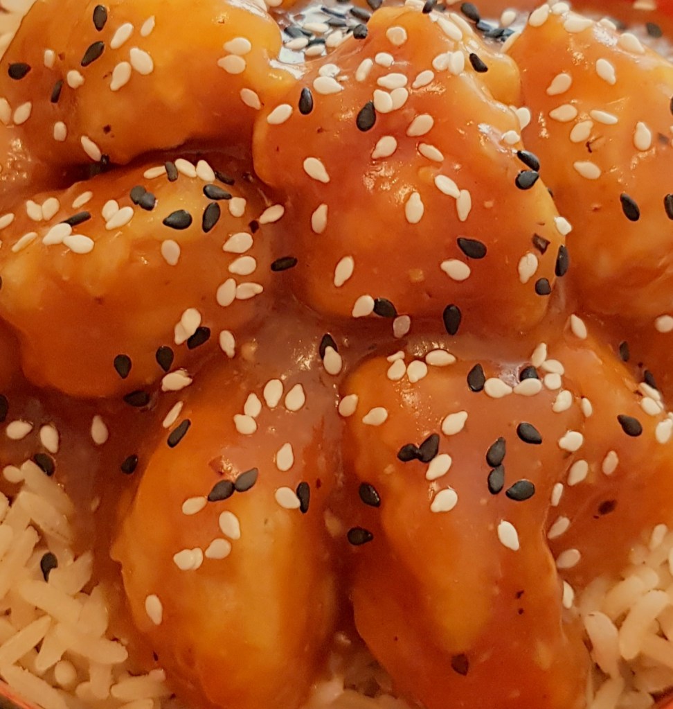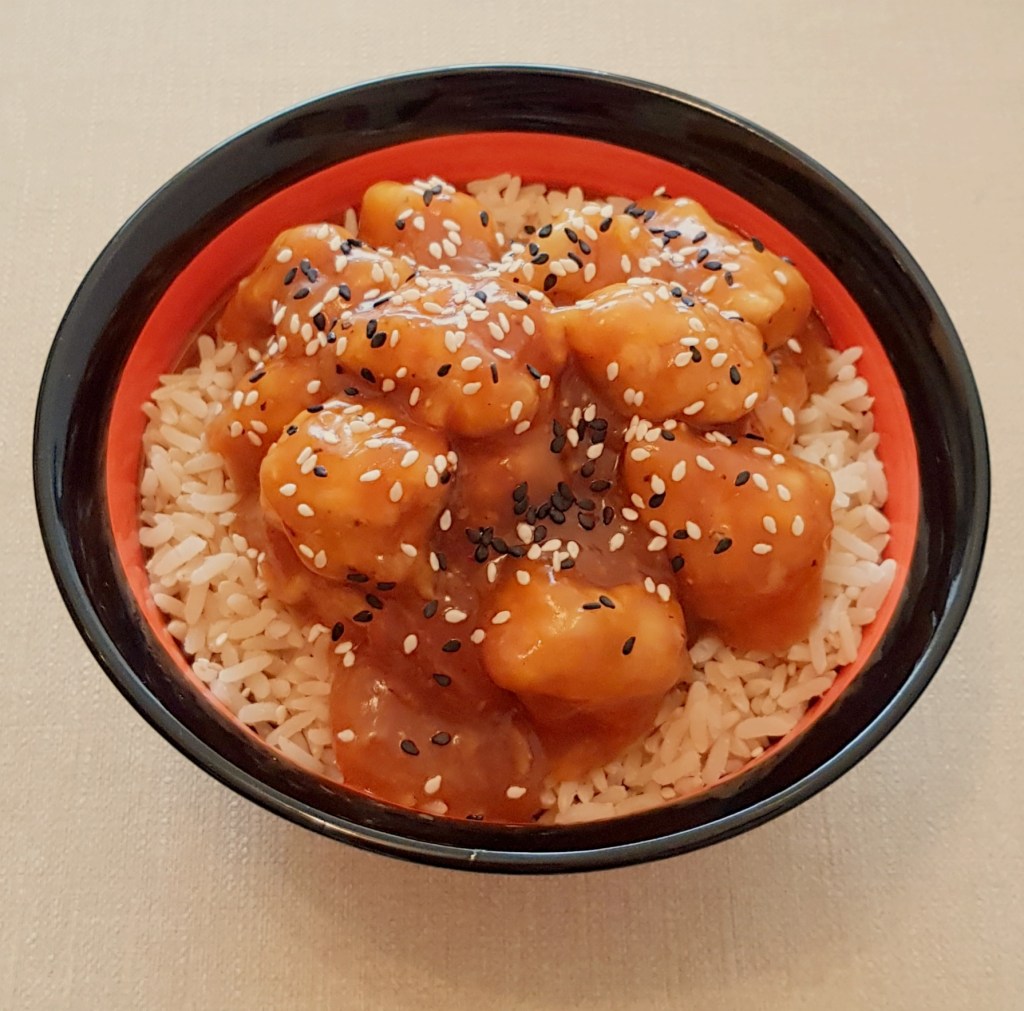 Pentru sos se adaugă într-o cratiță mică 2 linguri de ulei de răpiță sau alt ulei vegetal și se pune la foc mediu. Se pune usturoiul și se lasă un minut cât să își elibereze aromele. Se adaugă sucul de portocale, sosul de soia, zahărul, oțetul de mere, praful de ghimbir, piperul mozaic proaspăt măcinat și coaja de portocale. Se lasă la foc până începe să fiarbă. Într-un bol mic se amestecă amidonul de porumb cu apa și se pune peste sos. Se lasă la foc încă 5 minute amestecând continuu până compoziția primește consistența unui sos.