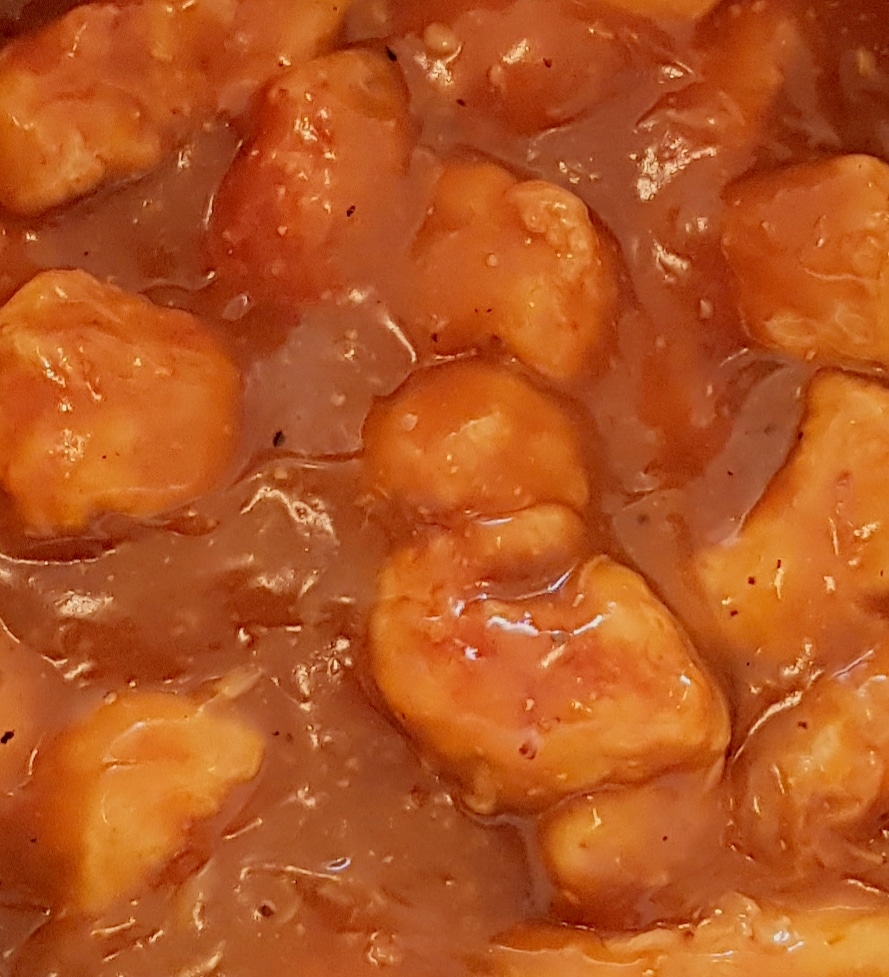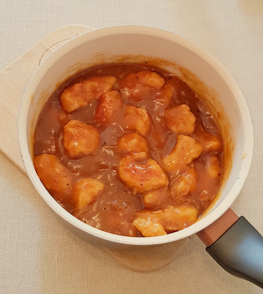 Apoi se stinge focul și se adaugă bucățile de piept de pui. Se amestecă până când îmbibă fiecare bucată de piept de pui cu sos de portocale.
