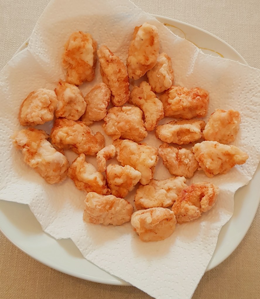 Puiul se taie cubulețe. Oul se bate ușor cu o furculiță și se condimentează cu sare și piper. Într-o farfurie se amestecă făina cu amidonul. Se trec bucățile de piept de pui mai întâi prin ou, apoi prin amestecul de făină și amidon și se prăjesc în ulei de răpiță încins pe ambele părți până se rumenesc frumos. Apoi se scot pe un șervețel absorbant.