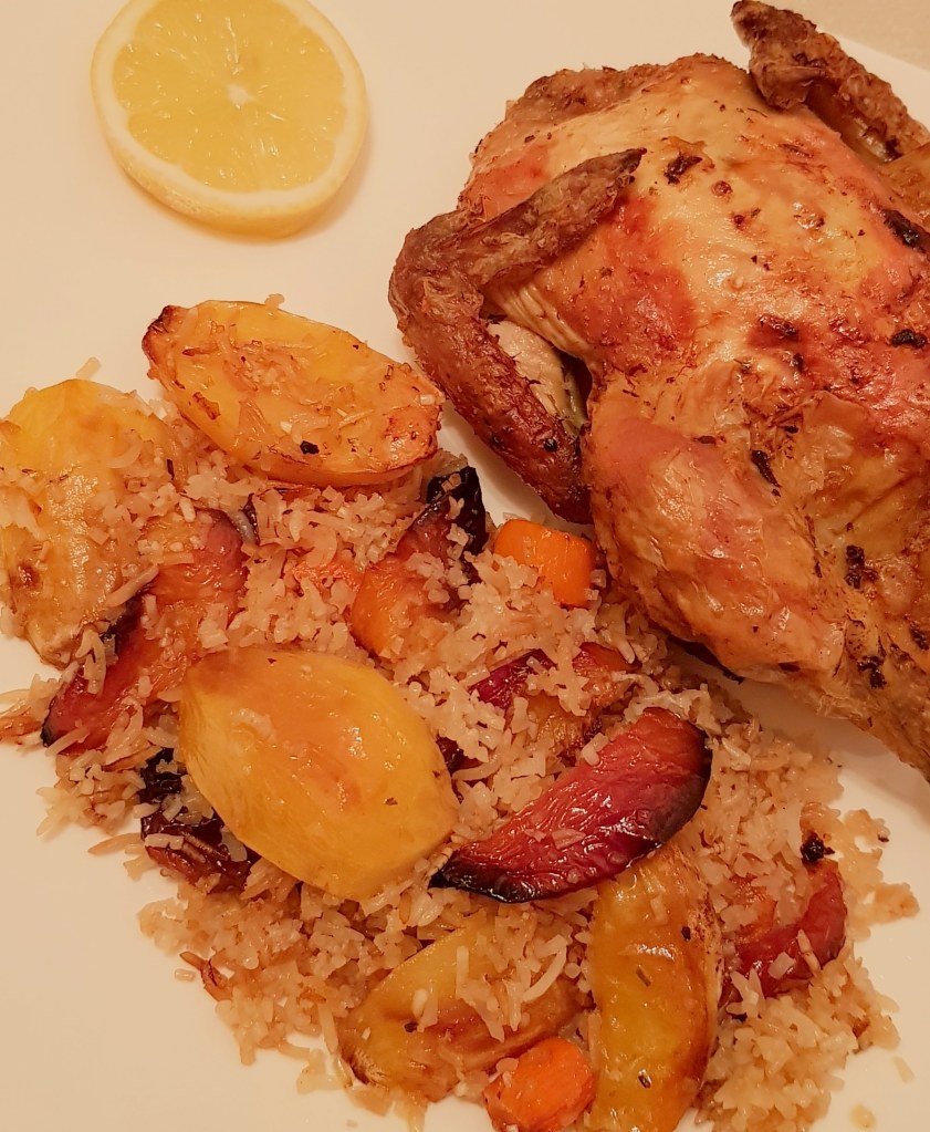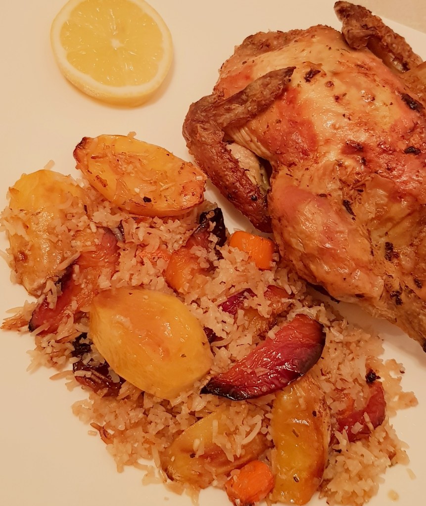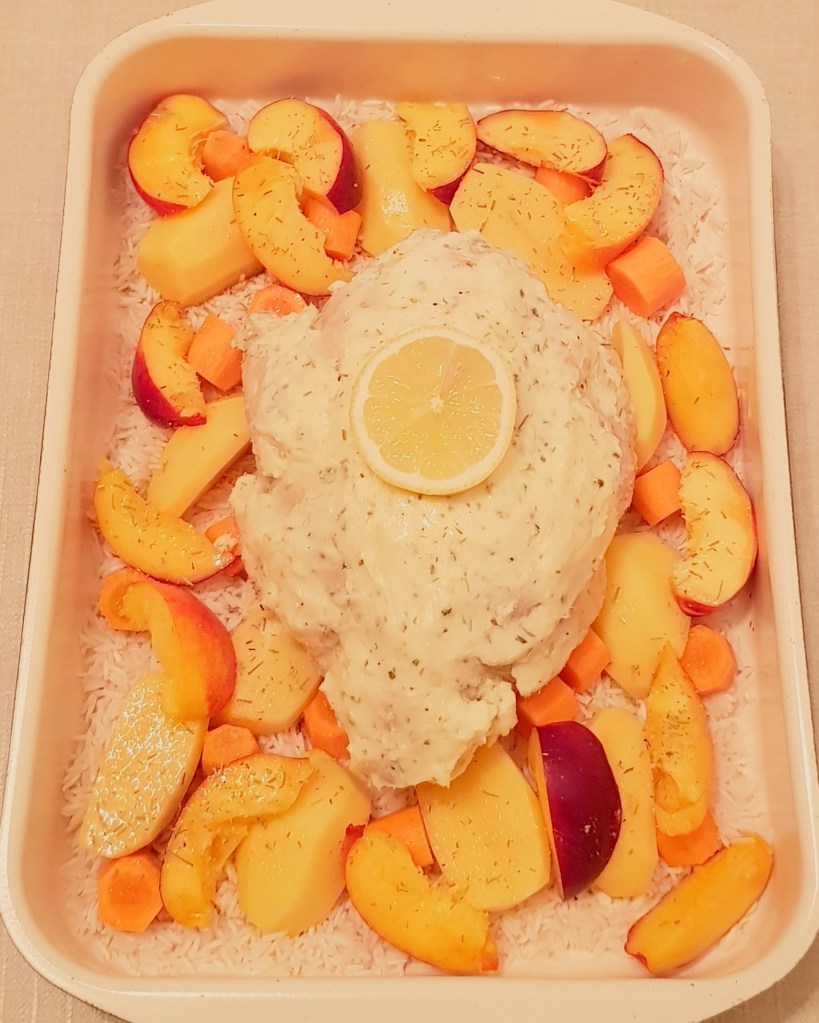 Pieptul de pui se spală, se tamponează cu un șervețel absorbant. Se taie fâșii. Se condimentează cu sare și piper în funcție de preferințe. Se unge o tavă cu uleiul de măsline extra virgin. Eu am folosit un vas de yena. Se adaugă bucățile de piept de pui, sucul de lămâie și ierburile uscate. Se pune tava în cuptorul preîncălzit la 200° pentru aproximativ 25 minute. E delicios alături de o salată simplă cu roșii cherry, obținută prin amestecul salatei cu roșiile cherry tăiate jumătăți, sucul de lămâie, uleiul de măsline, sare și piper în funcție de preferințe 😋