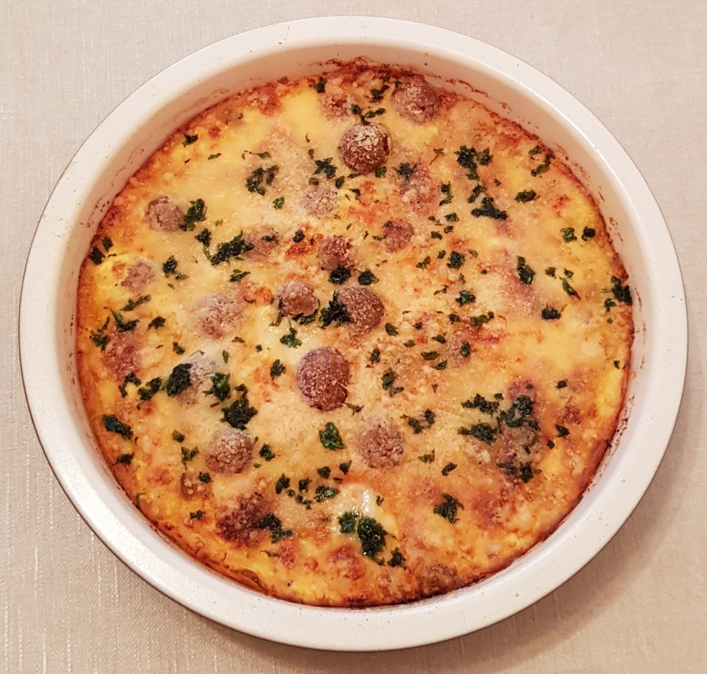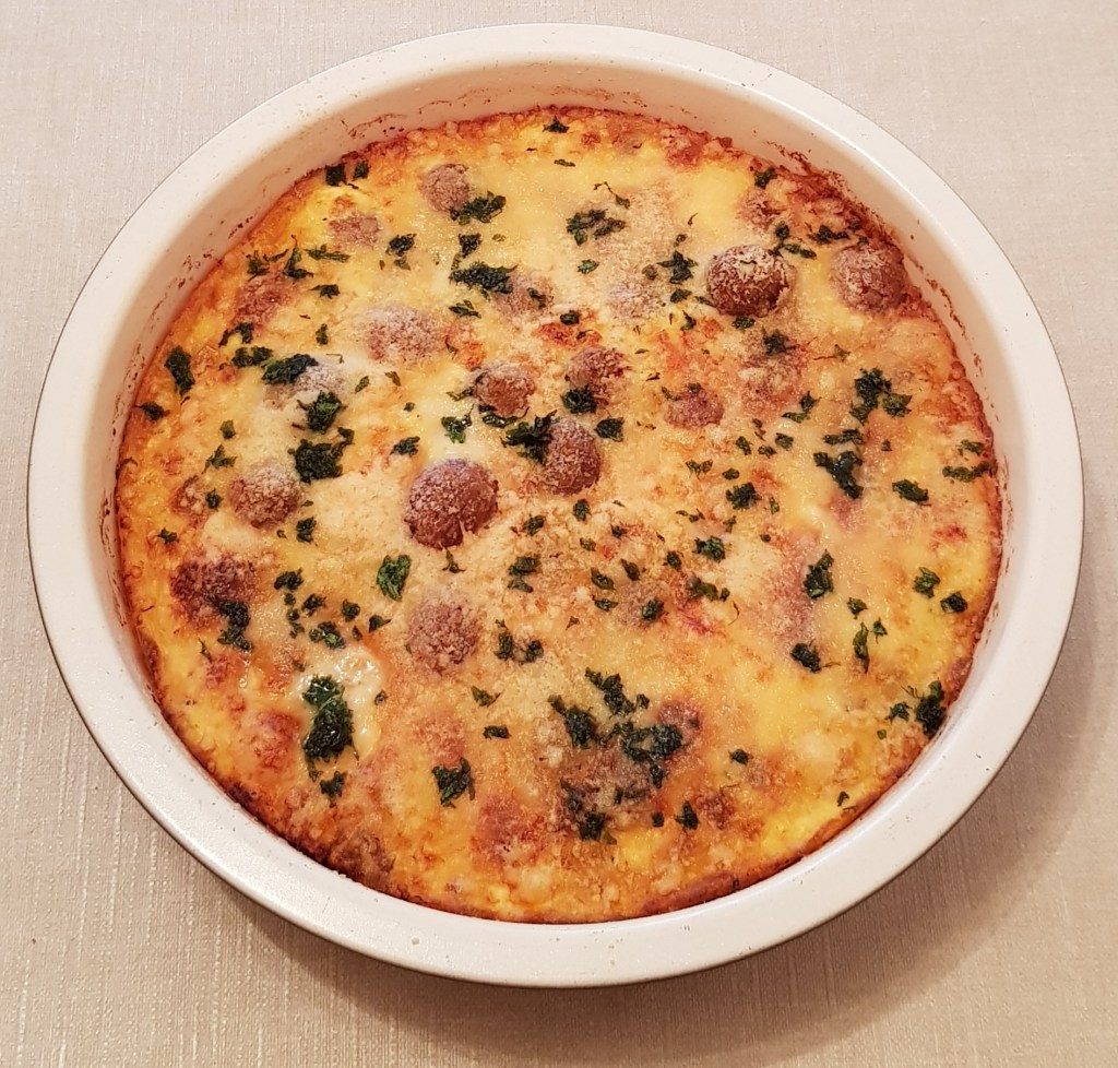 Se toarnă uleiul și apa plată. Se acoperă tava cu folie de aluminiu și se pune în cuptorul preîncălzit la 180° pentru 40 minute. Apoi se scoate folia de aluminiu și se mai lasă în cuptor încă 5-10 minute.