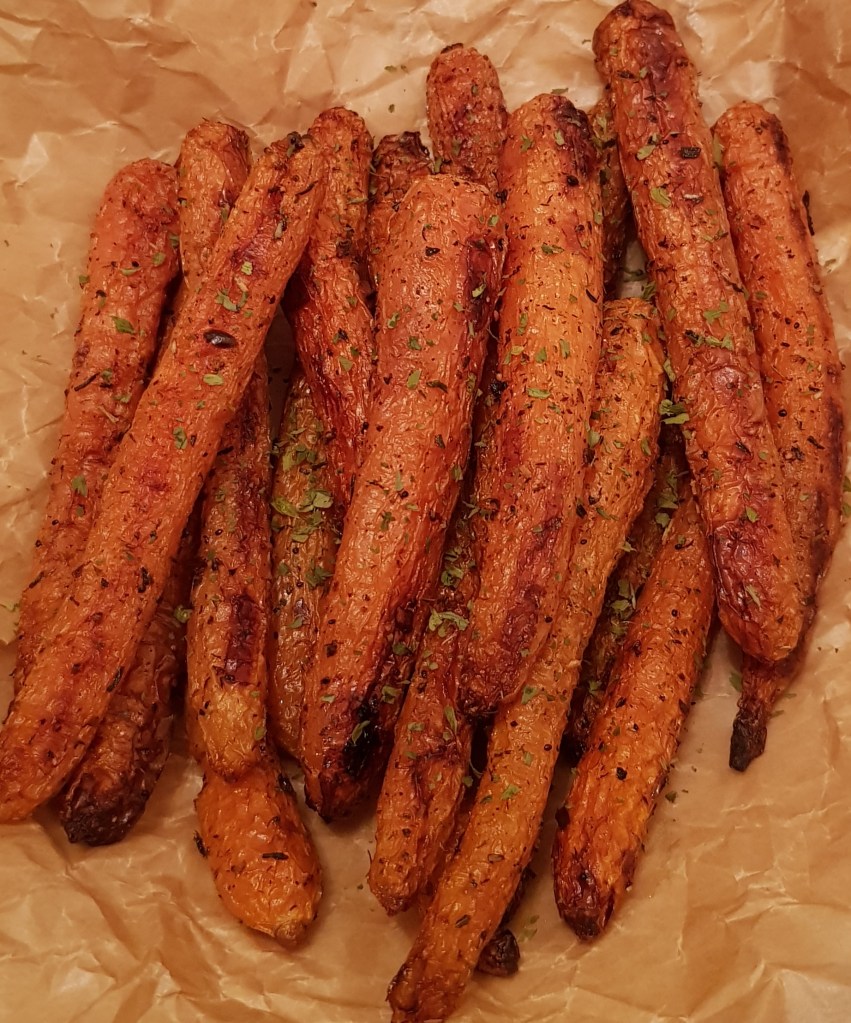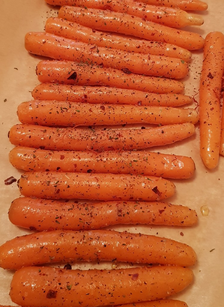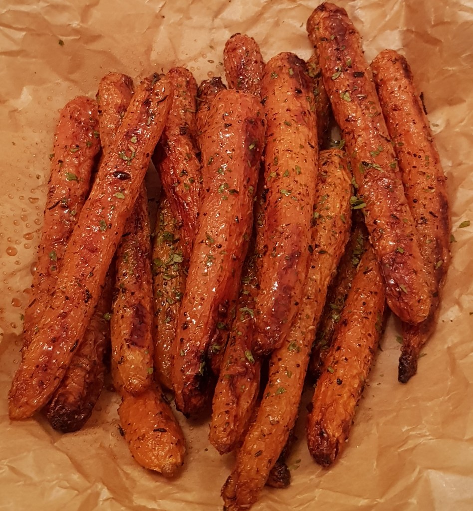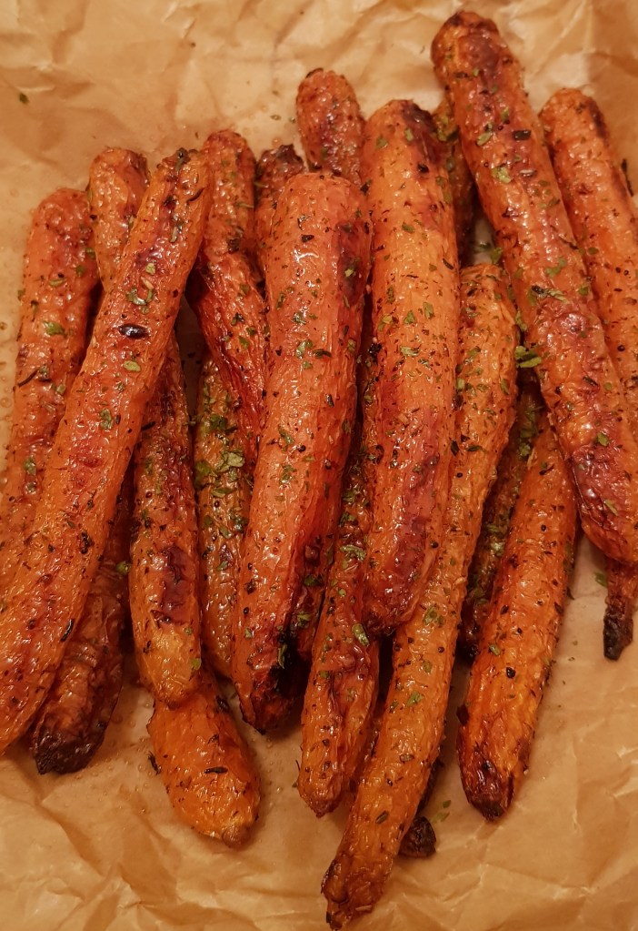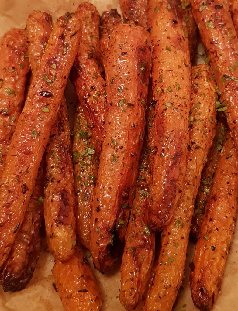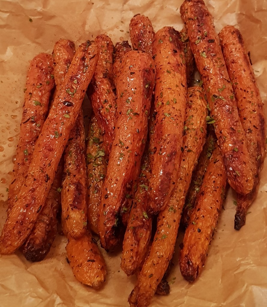 La jumătatea timpului se scoate tava și se întorc morcovii. După ce s-au copt morcovii se presară cu puțin pătrunjel verde și opțional se pulverizează cu puțin oțet balsamic. Sunt absolut delicioși. Eu i-am savurat alături de puțin sos sweet chilli 😋