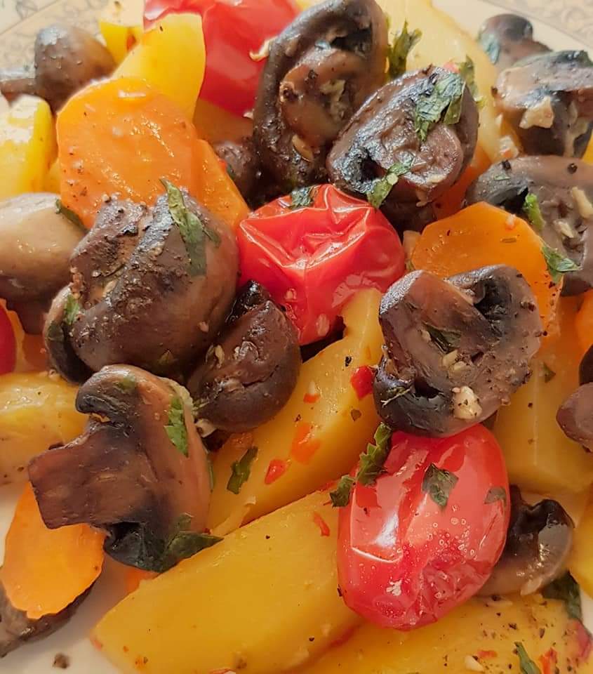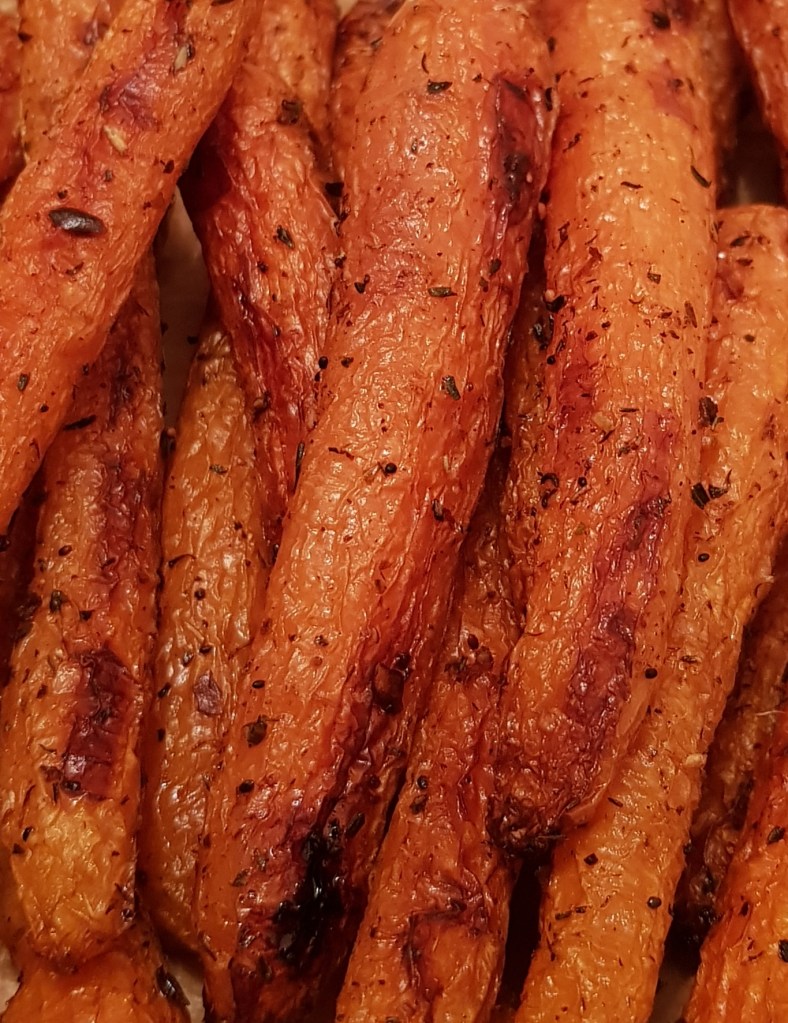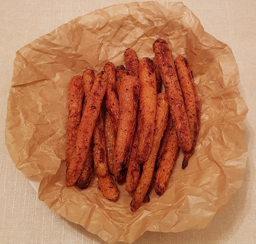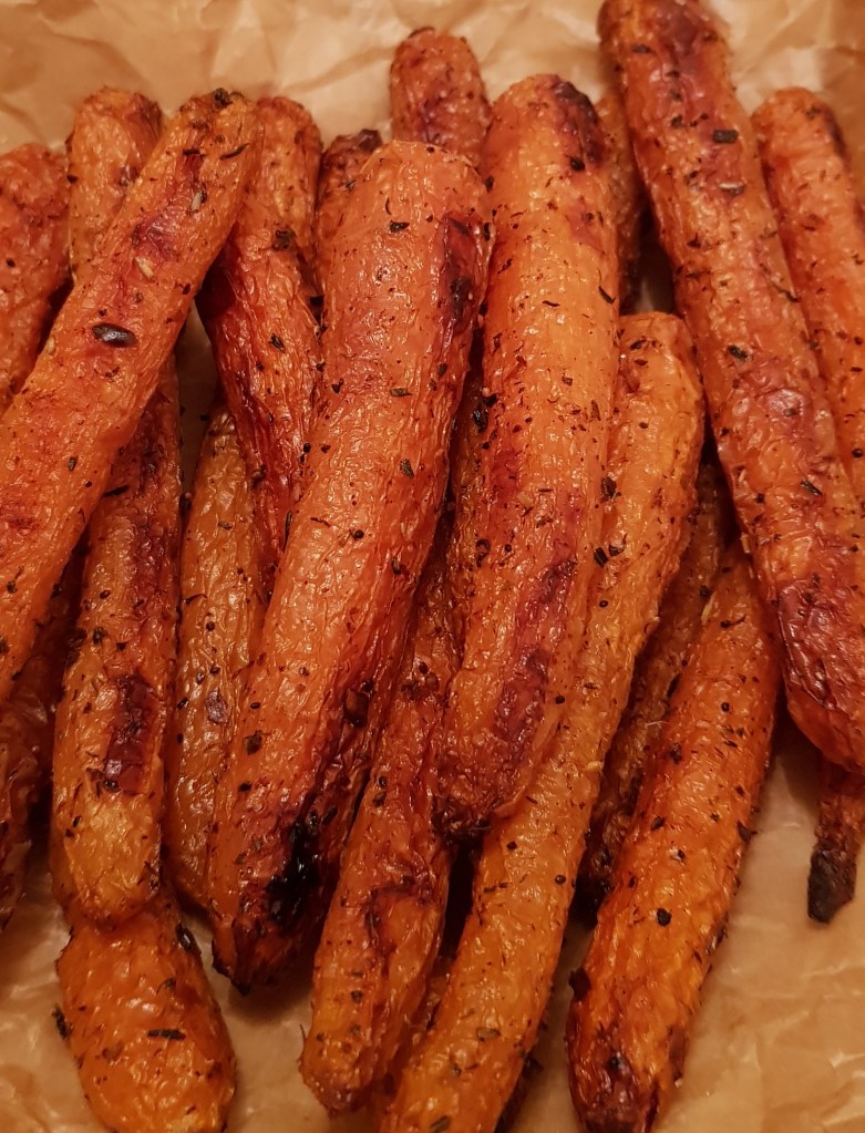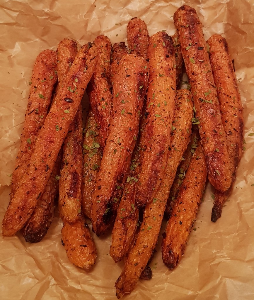 La jumătatea timpului se scoate tava și se întorc morcovii. După ce s-au copt morcovii se presară cu puțin pătrunjel verde și opțional se pulverizează cu puțin oțet balsamic. Sunt absolut delicioși. Eu i-am savurat alături de puțin sos sweet chilli 😋
