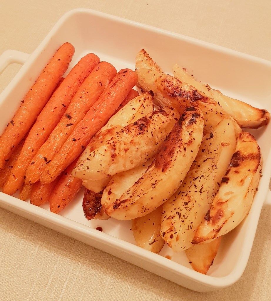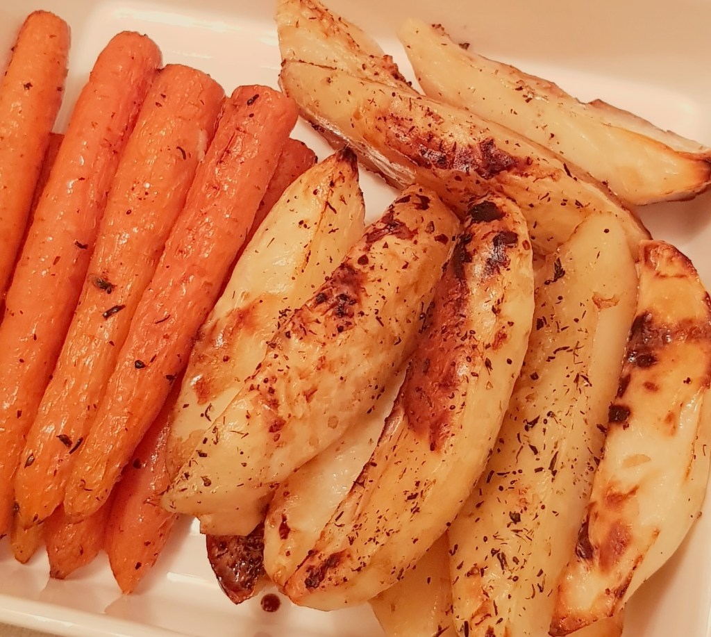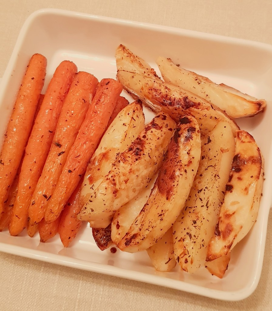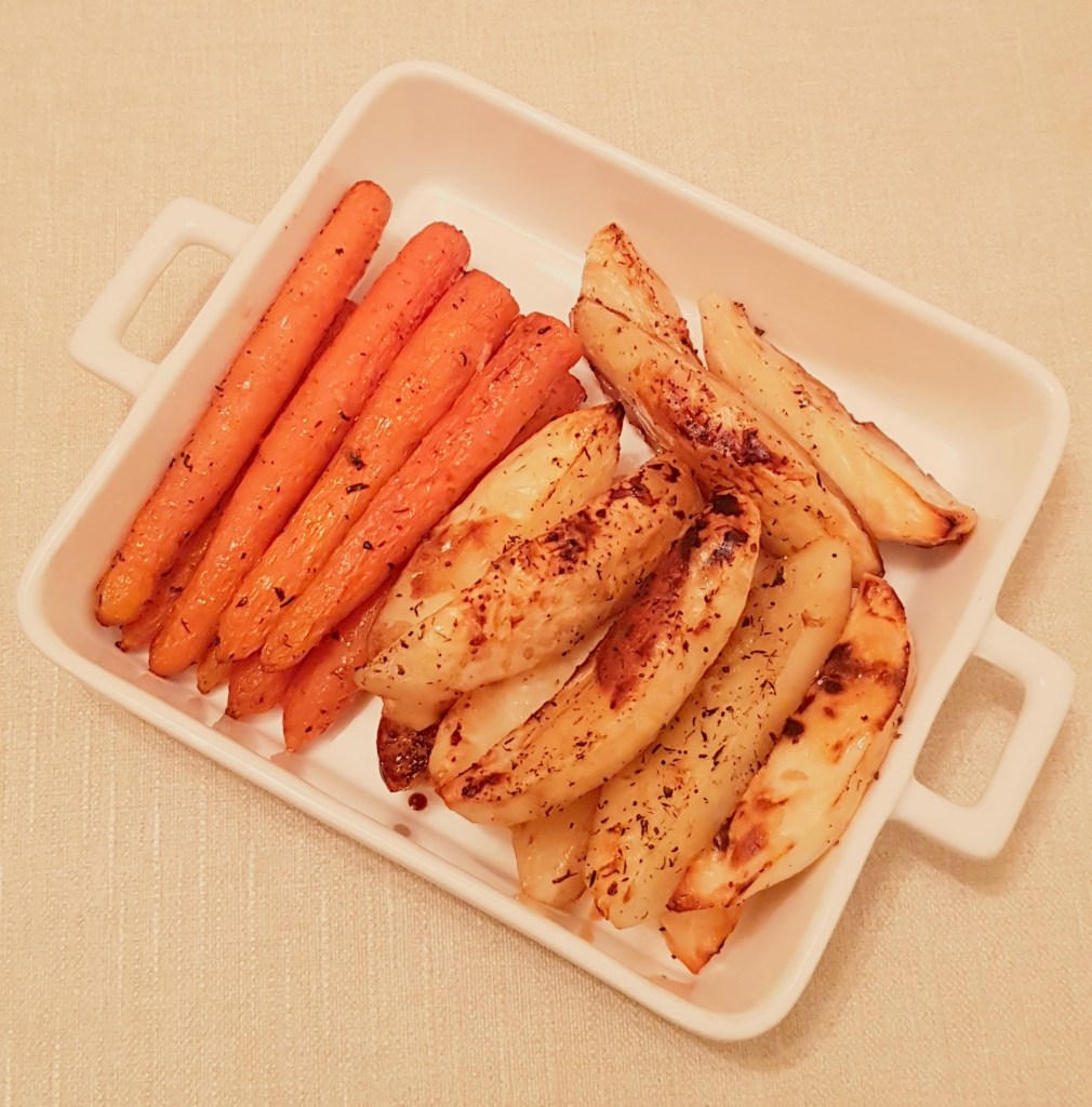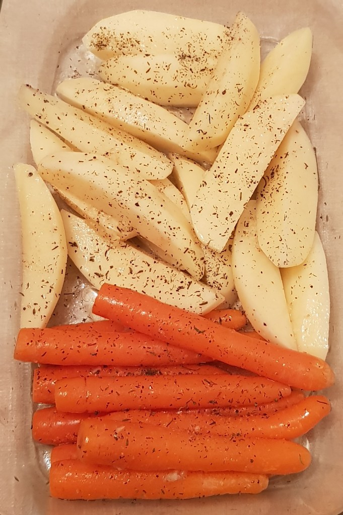 Cartofii se curăță, se spală și se taie sferturi. Morcoveii se spală foarte bine. Se pune într-o tavă uleiul de răpiță. Se adaugă cartofii și morcoveii. Se condimentează cu sare, piper, usturoiul pisat și cimbrul uscat.