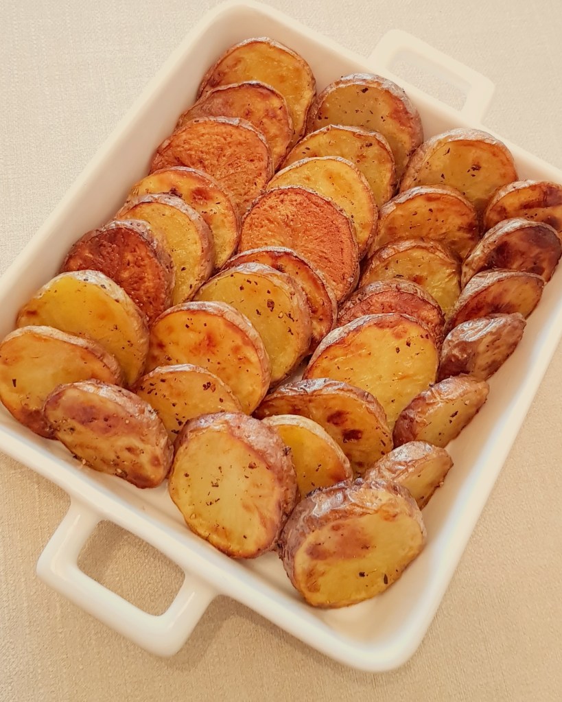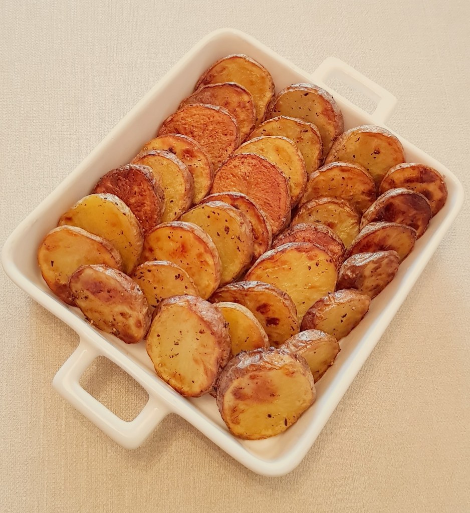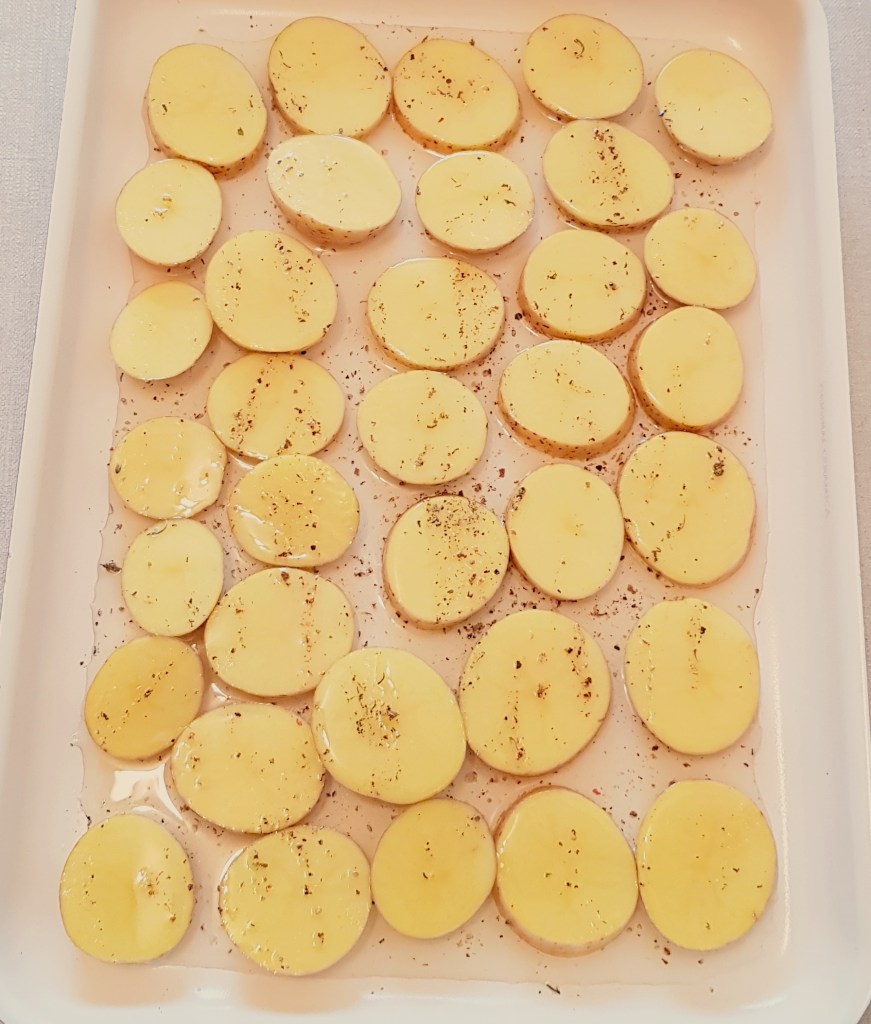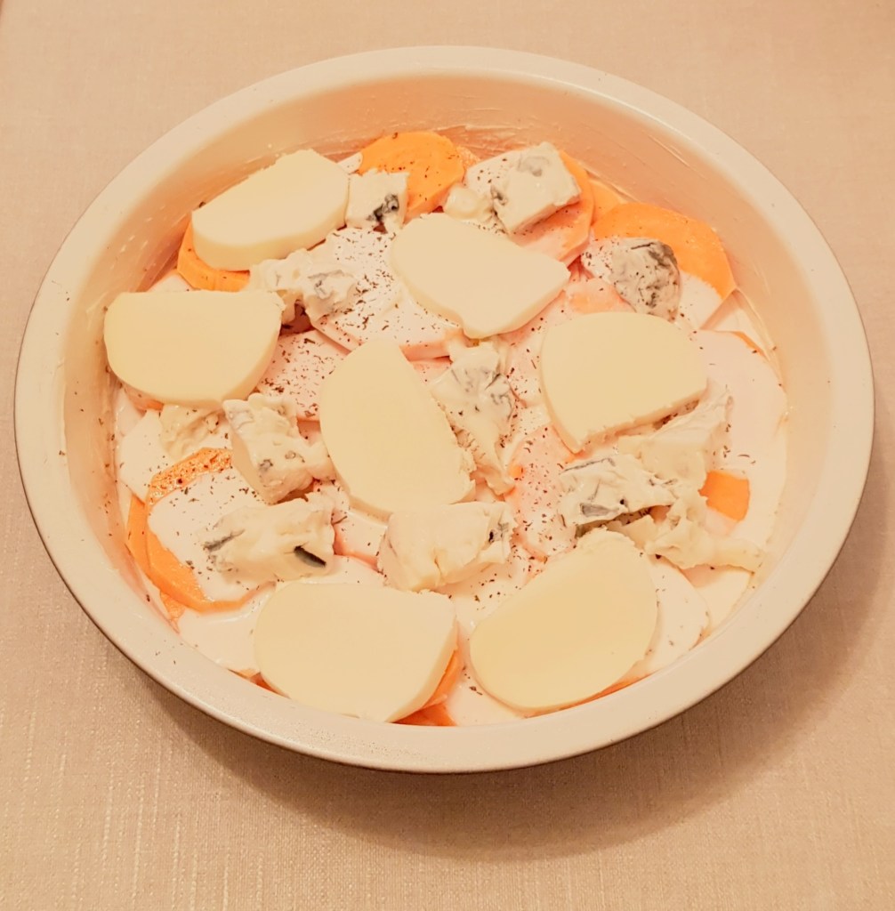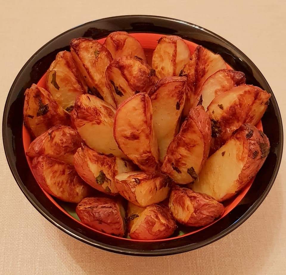 Cartofii se curăță, se spală și se taie sferturi. Morcoveii se spală foarte bine. Se pune într-o tavă uleiul de răpiță. Se adaugă cartofii și morcoveii. Se condimentează cu sare, piper, usturoiul pisat și cimbrul uscat.