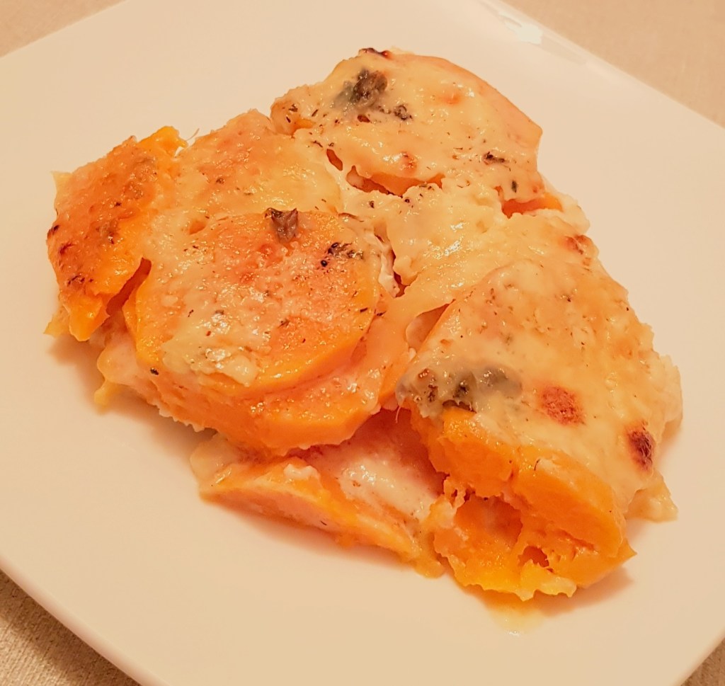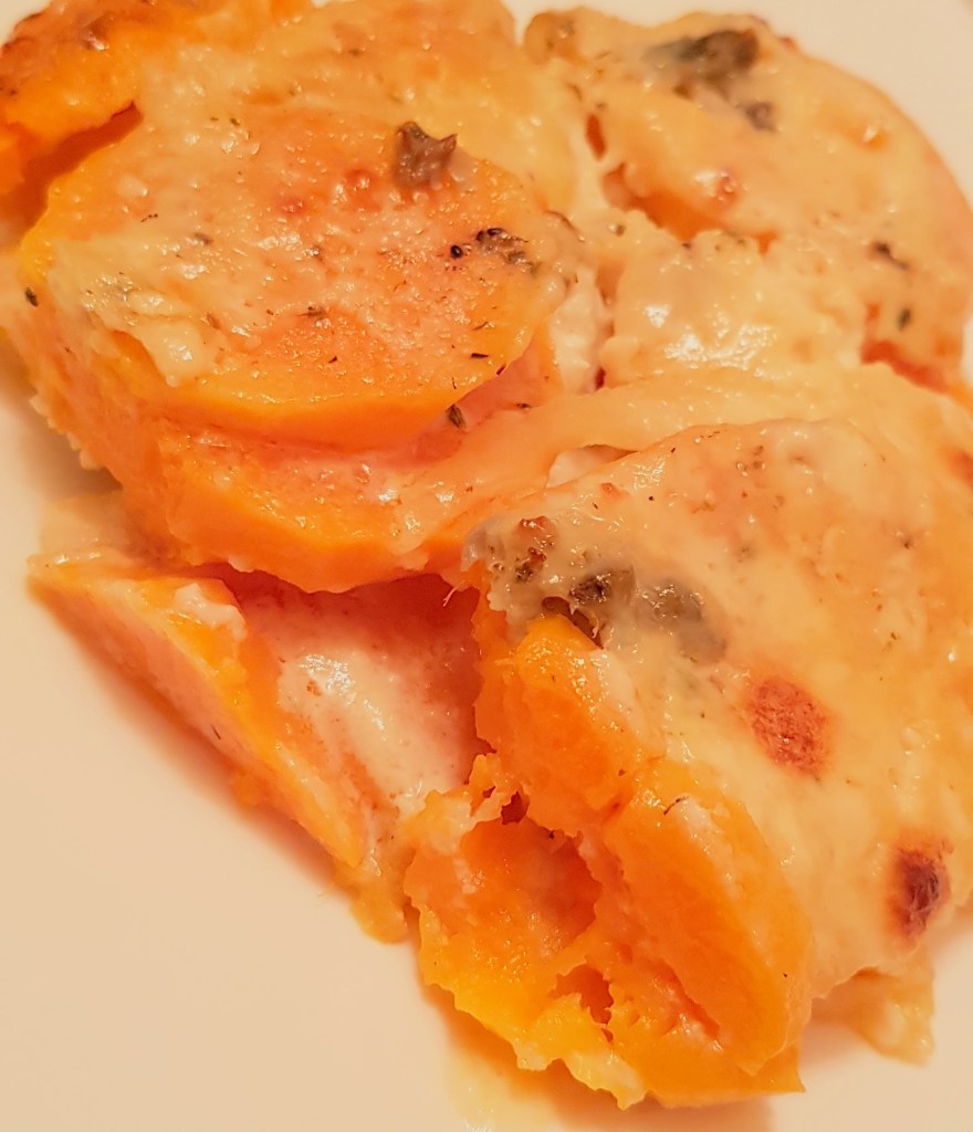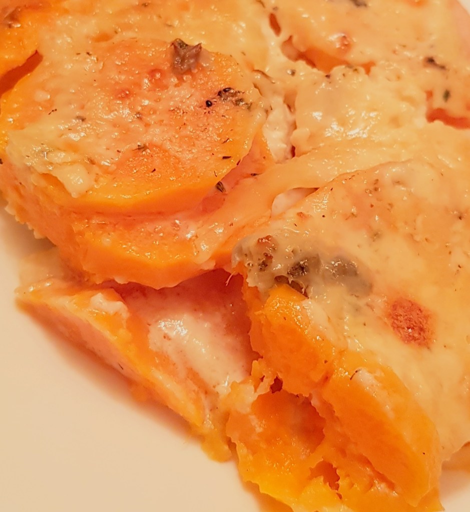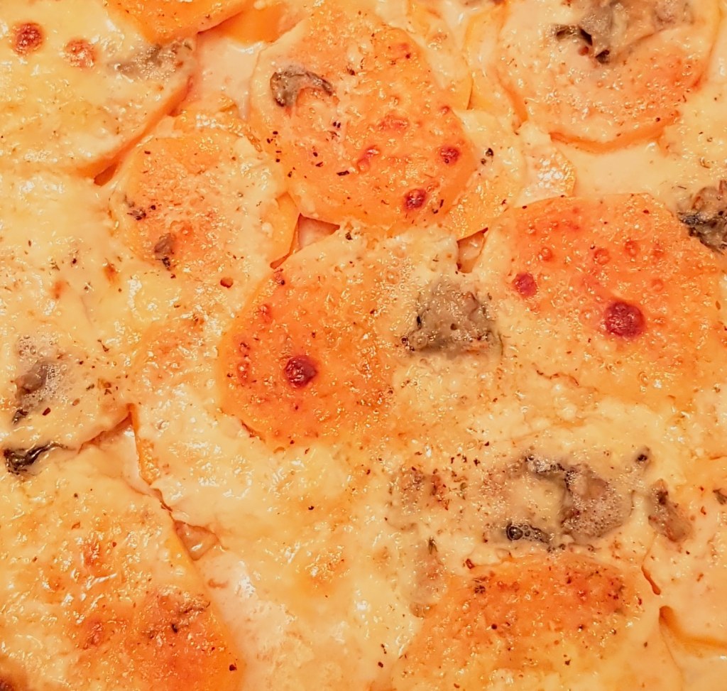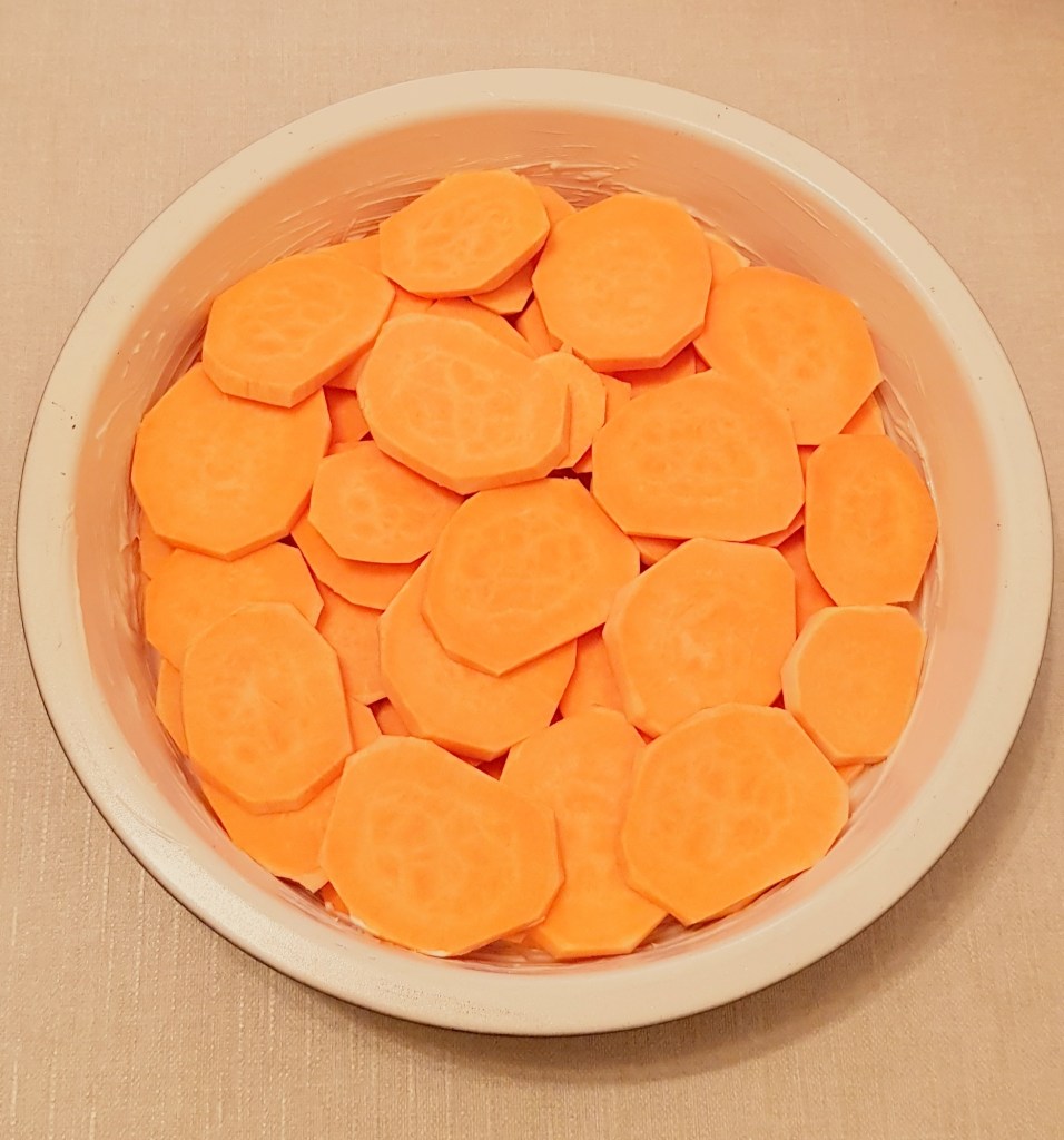 Cartofii se curăță, se spală și se taie sferturi. Morcoveii se spală foarte bine. Se pune într-o tavă uleiul de răpiță. Se adaugă cartofii și morcoveii. Se condimentează cu sare, piper, usturoiul pisat și cimbrul uscat.