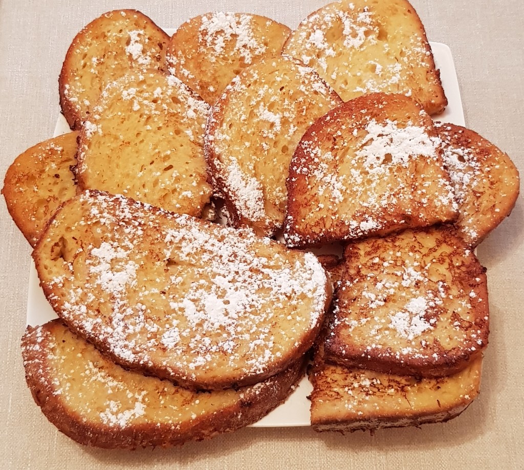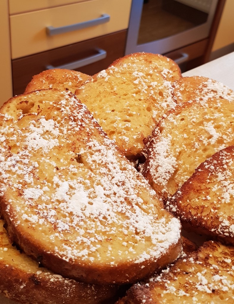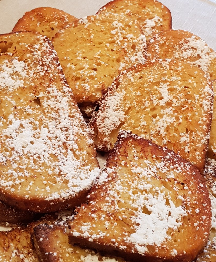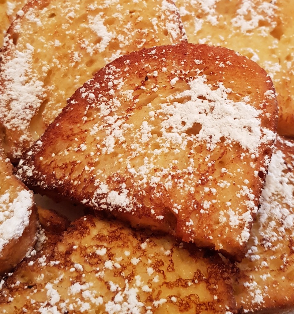 Pe mine pâinea în ou mă trimite cu gândul la copilărie… e mic-dejunul pregătit de mama sau bunica în diminețile de vacanță. Un mic-dejun mereu dulce pentru că tot timpul era presărată cu zahăr tos din abundență și însoțită de ceaiuri dulci 😊 Pe blogul meu veți găsi mai multe variante ale acestui mic dejun delicios. În acest articol o să vă prezint varianta care mă trimite cu gândul la copilărie, îmbunătățită cu un strop de esență de vanilie și puțină smântână pentru gătit.