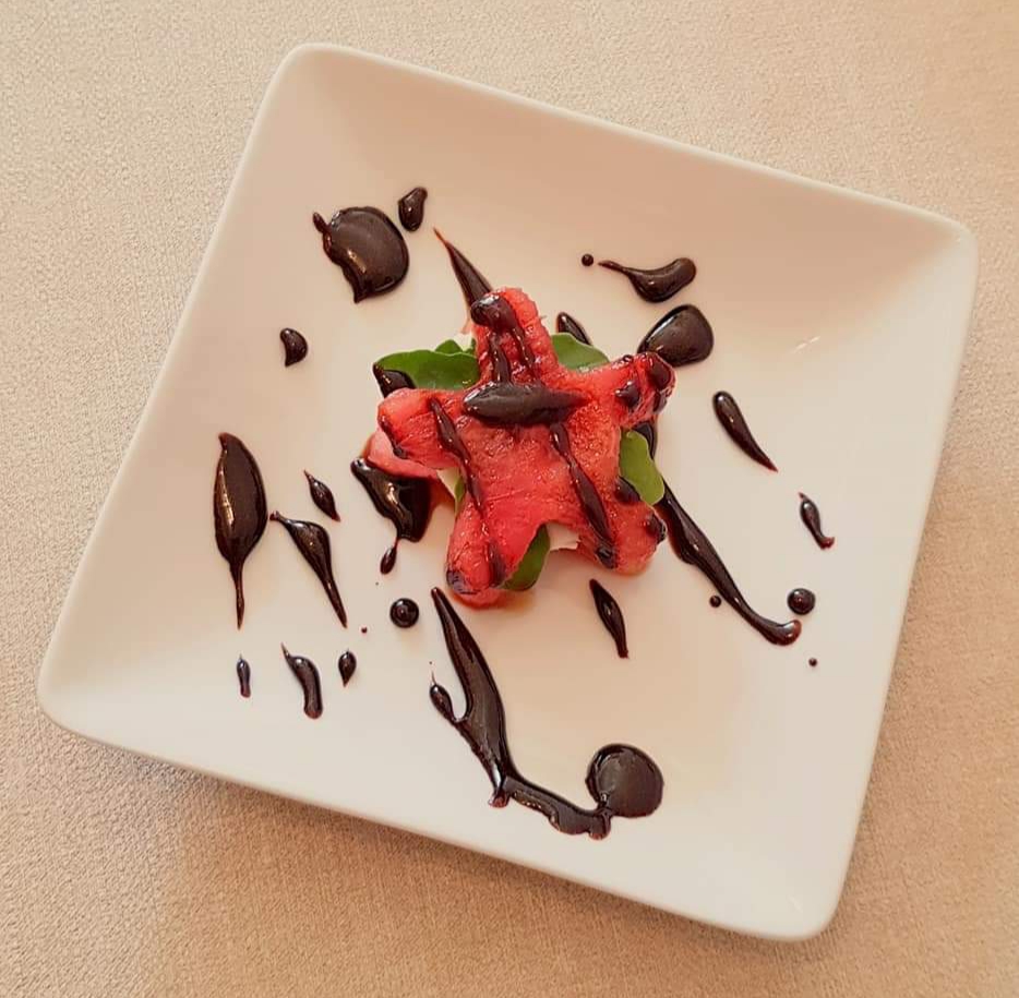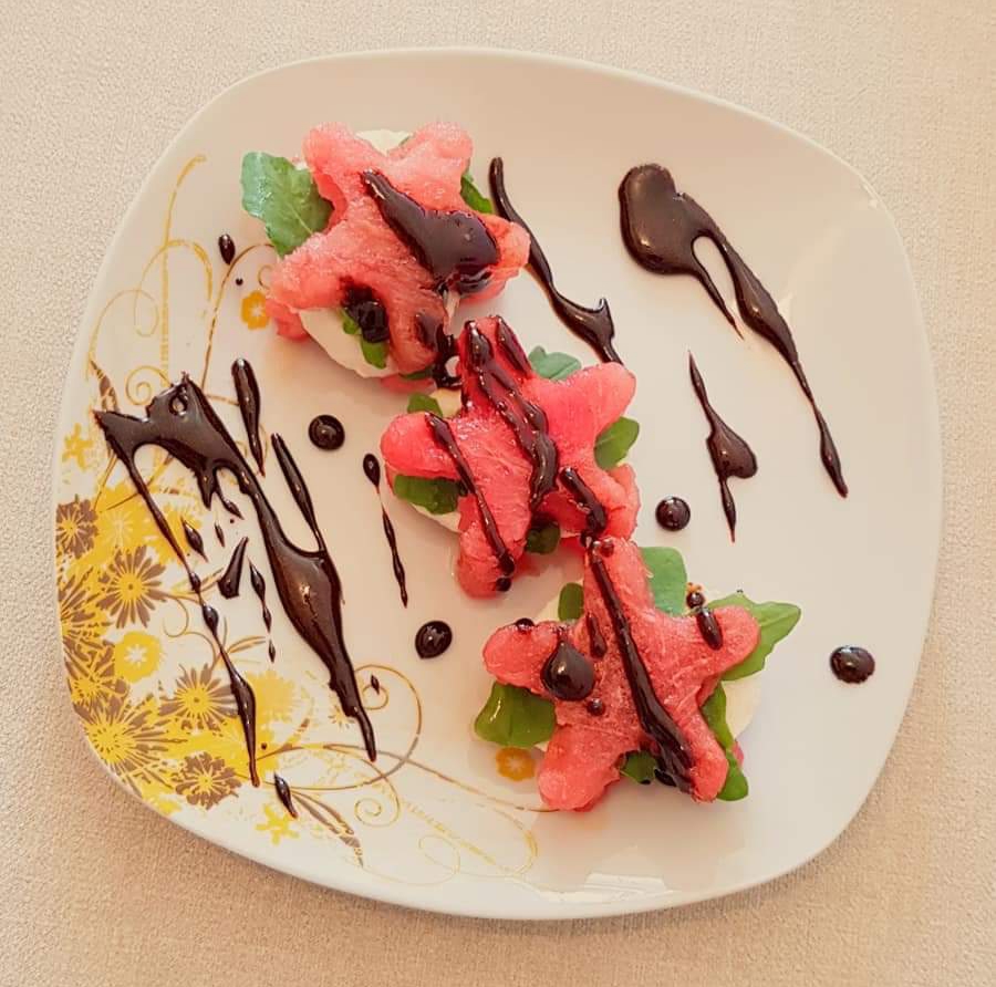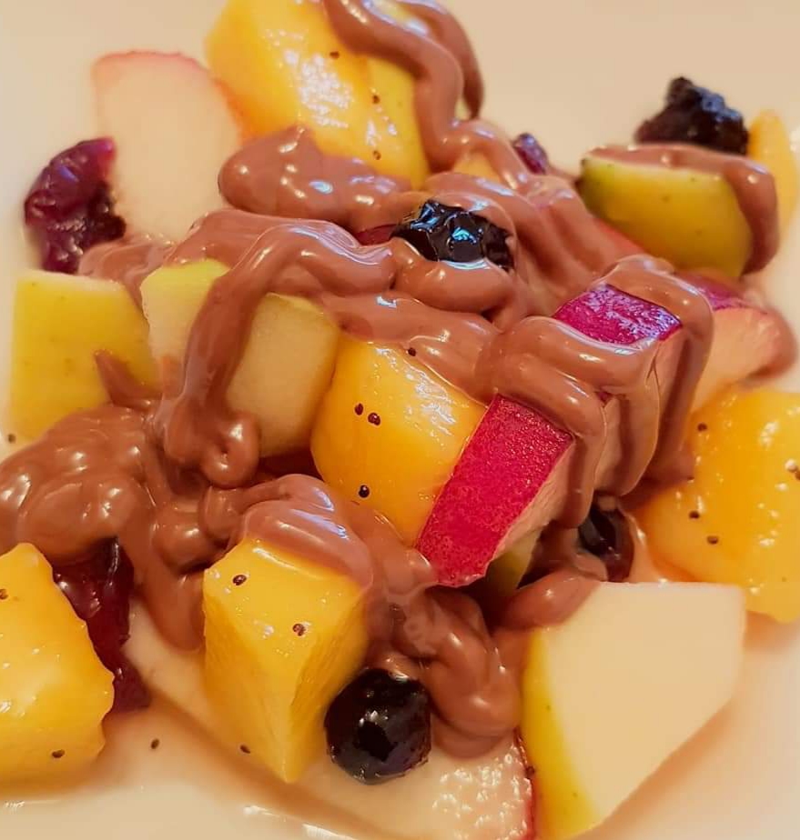 Se prepară dressingul din amestecul mierii cu sucul de lămâie și se toarnă peste fructe. Se amestecă ușor pentru omogenizare și îmbinarea aromelor. Opțional puteți adăuga frișcă în momentul servirii. Eu am ales puțin sos de ciocolată 😋