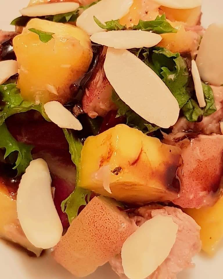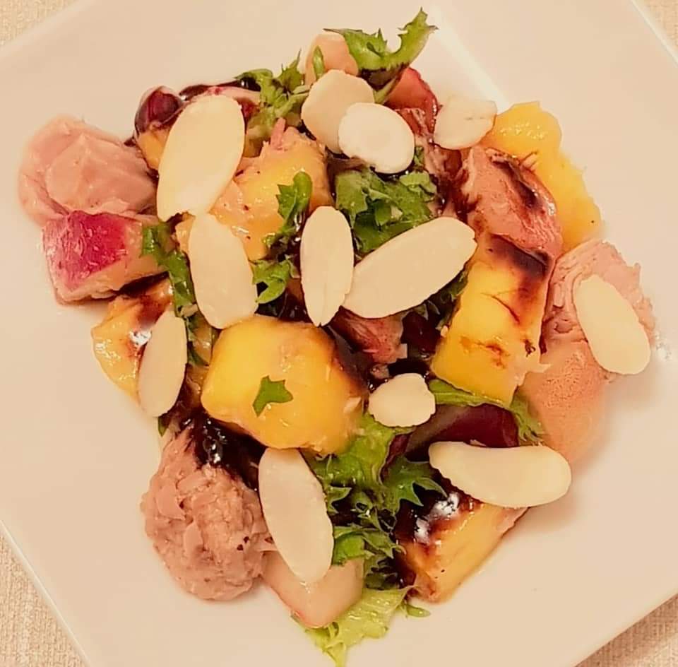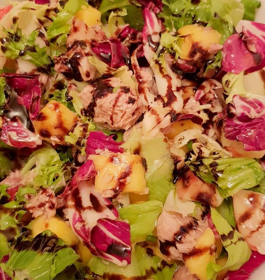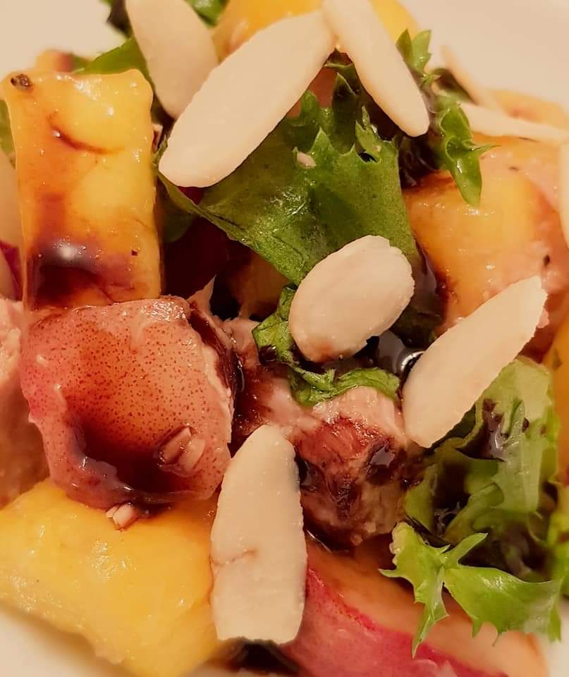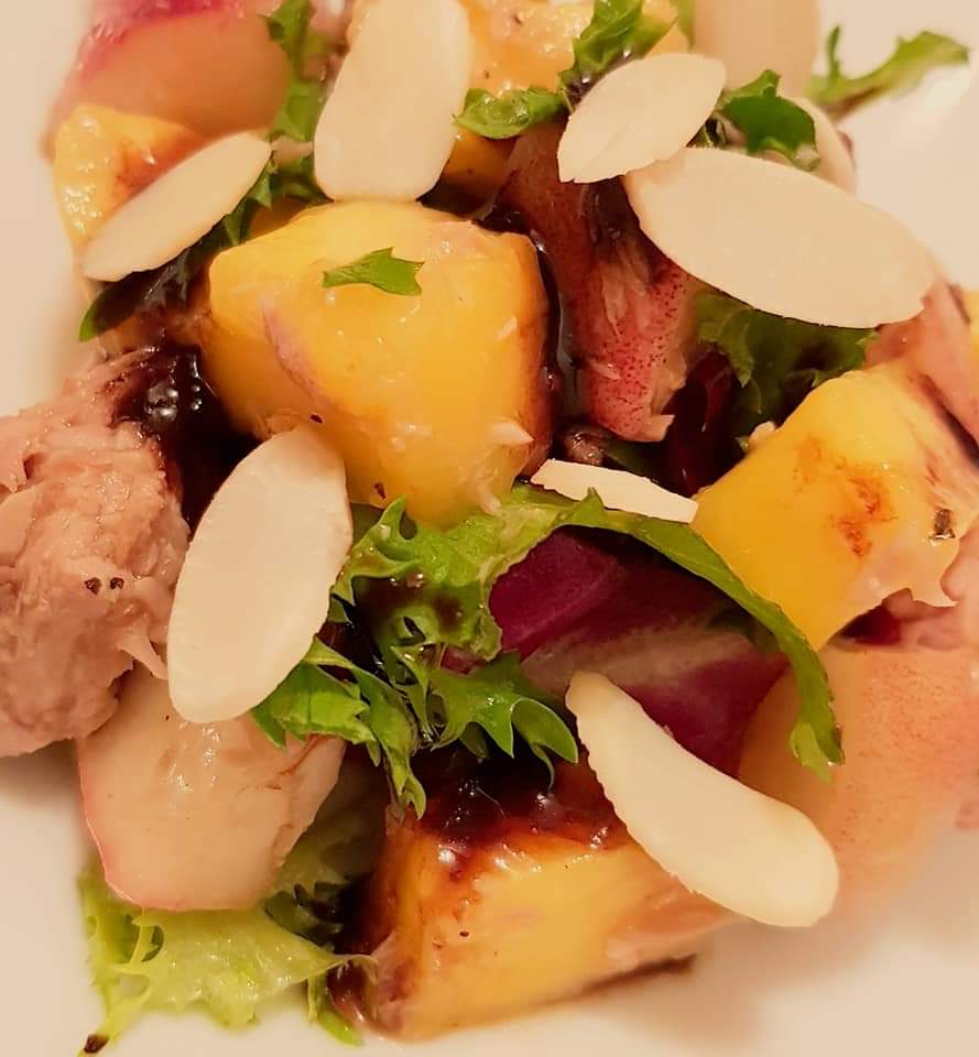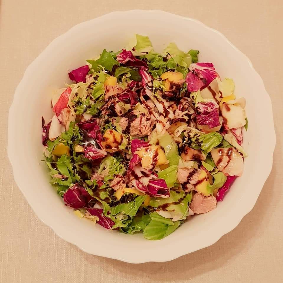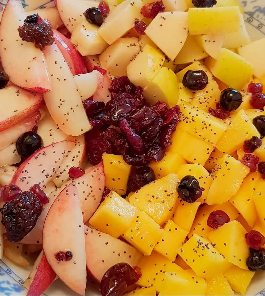 Pe blogul meu găsiți mai multe salate de fructe, fiecare cu ingredientele sale speciale. Azi vă propun o rețetă de salată de fructe mai simplă. Am ales doar 3 fructe: piersici, mango și mere verzi. Și, pentru că, mie îmi place să adaug fructe confiate, nuci sau semințe în salatele mele de fructe, am ales de această dată merișoarele și semințele de mac. Și, pentru o salată delicioasă, am preparat un mic dressing din suc de lămâie și miere cu bucăți de fructe de pădure. Delicios 😋
