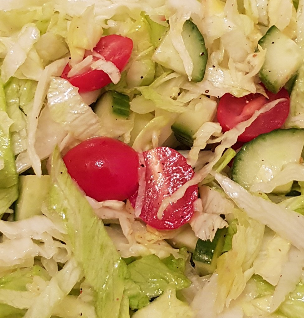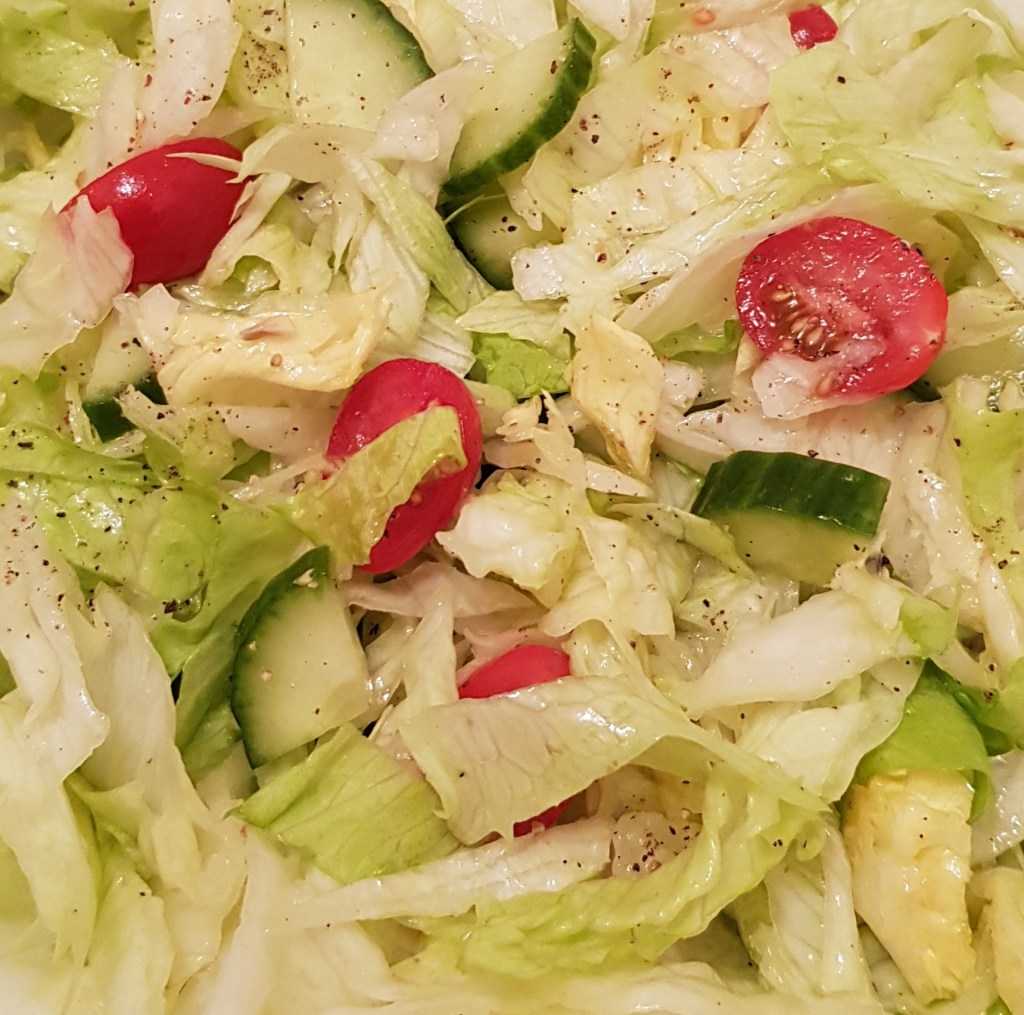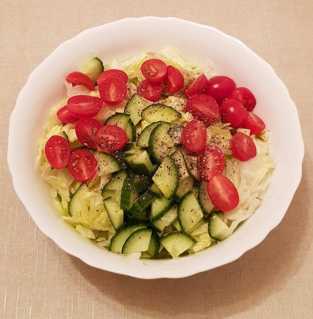 Ingrediente 1/2 salată iceberg 1/2 castravete 8-10 roșii cherry Sucul de la o lămâie 3 linguri ulei de măsline extra virgin Sare roz de Himalaya Piper mozaic proaspăt măcinat