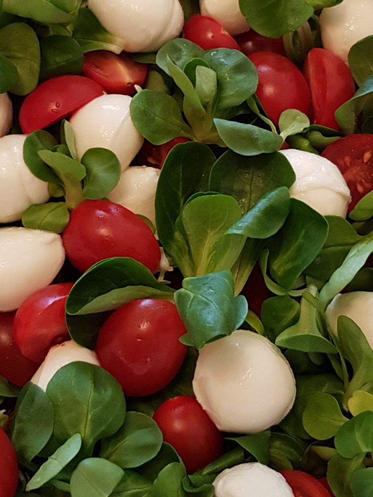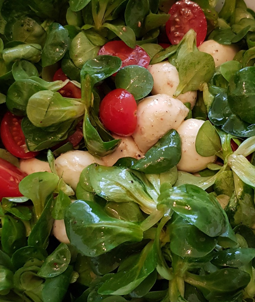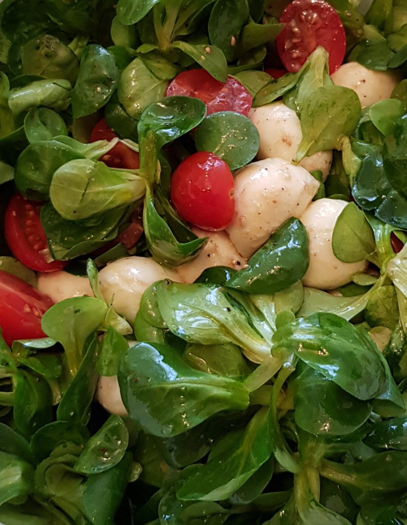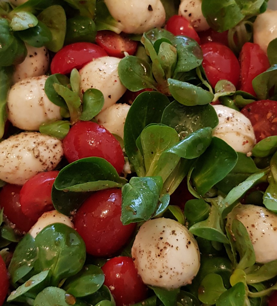 Ingrediente 100gr valeriană 200gr baby mozzarella Câteva roșii cherry 3 linguri ulei de măsline extra virgin 3-4 linguri oțet balsamic Sare roz de Himalaya Piper mozaic proaspăt măcinat