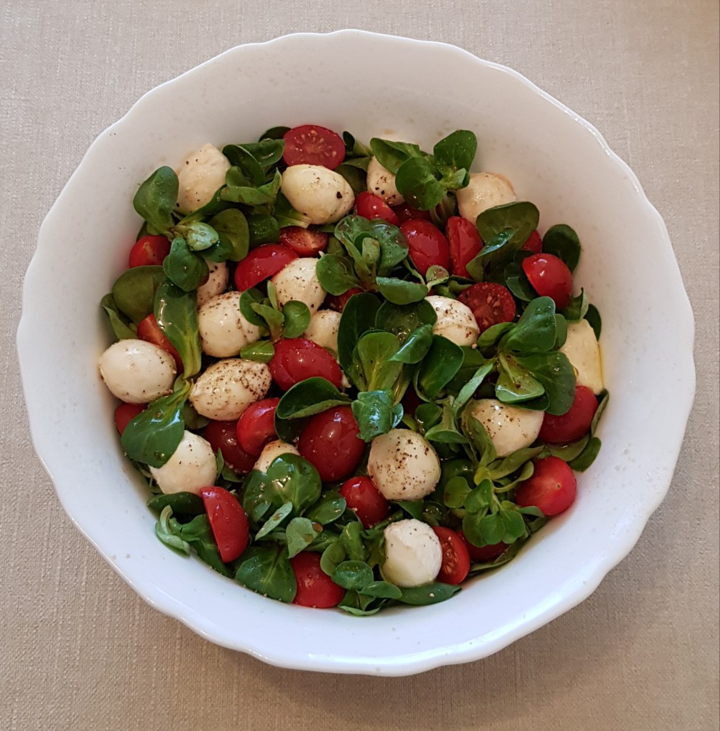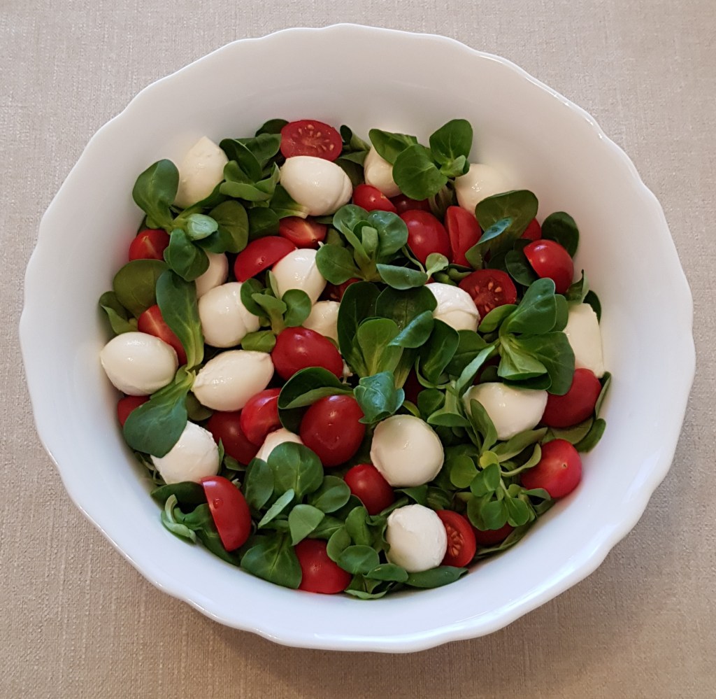 Mod de preparare Se adaugă valeriana într-un bol. Se pun roșiile cherry tăiate jumătăți, baby mozzarella și se condimentează cu sare și piper în funcție de preferințe.