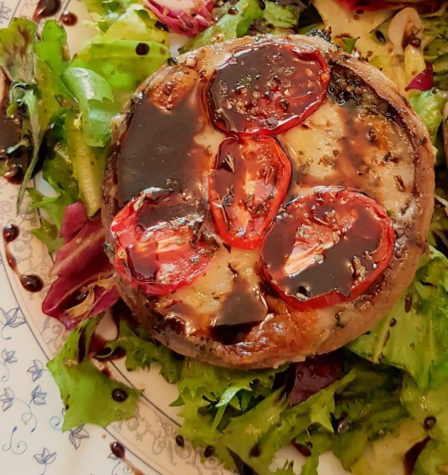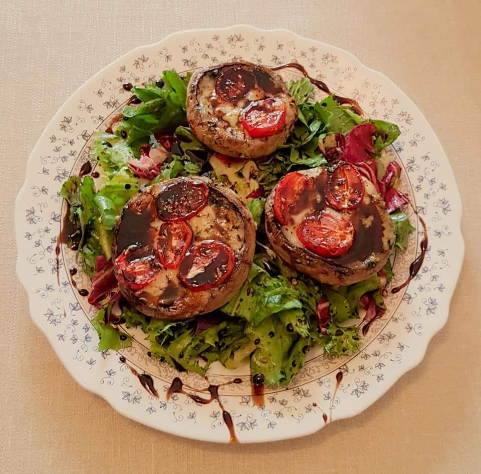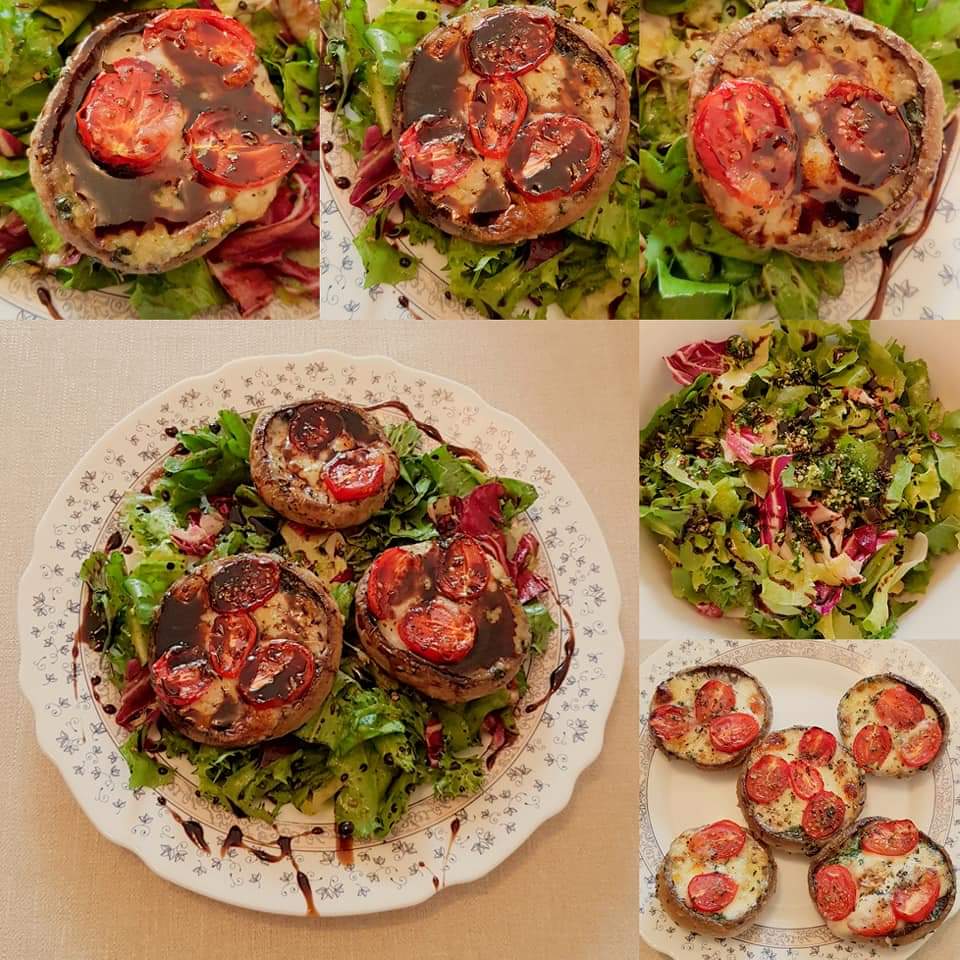 Ciupercile se curăță, se spală, se tamponează cu un șervețel absorbant. Se ung pe ambele părți cu ulei de măsline extra virgin cu ajutorul unei pensule pentru bucătărie. Se sărează și se piperează în funcție de preferințe. Se pun într-o tavă și se pune în fiecare ciupercuță câte o linguriță de ketchup, bucățele de salam și rondele de măsline verzi. Se pun în cuptorul preîncalzit la 180° pentru 10 minute.