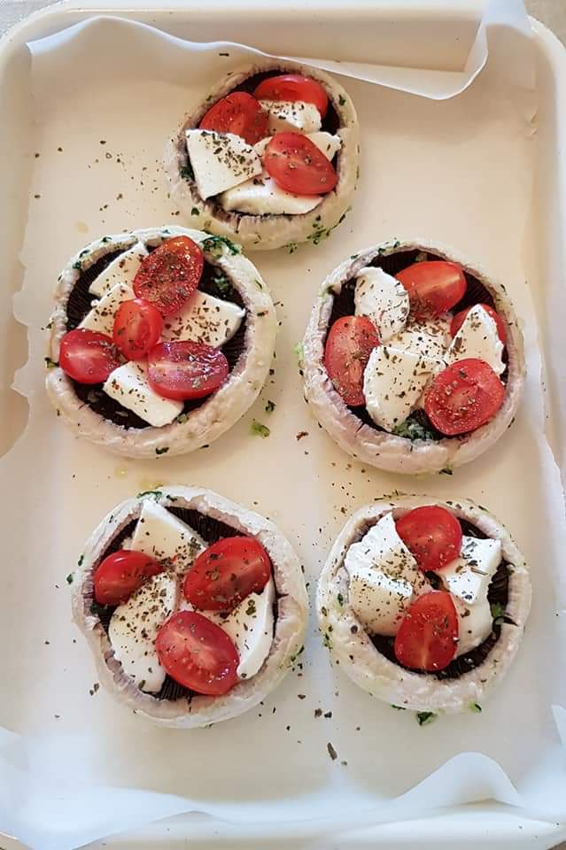 Apoi se scot și se pun feliile de mozzarella proaspătă în fiecare ciupercuță. Se mai adaugă câteva bucățele de salam și rondele de măsline verzi pe fiecare ciupercuță.