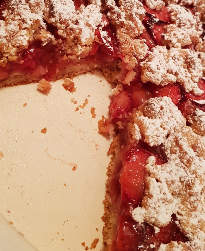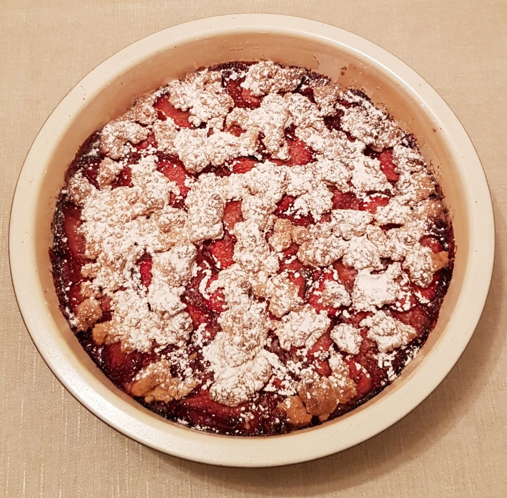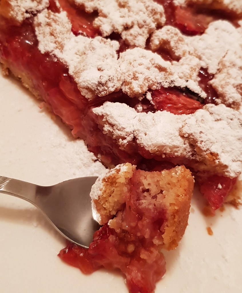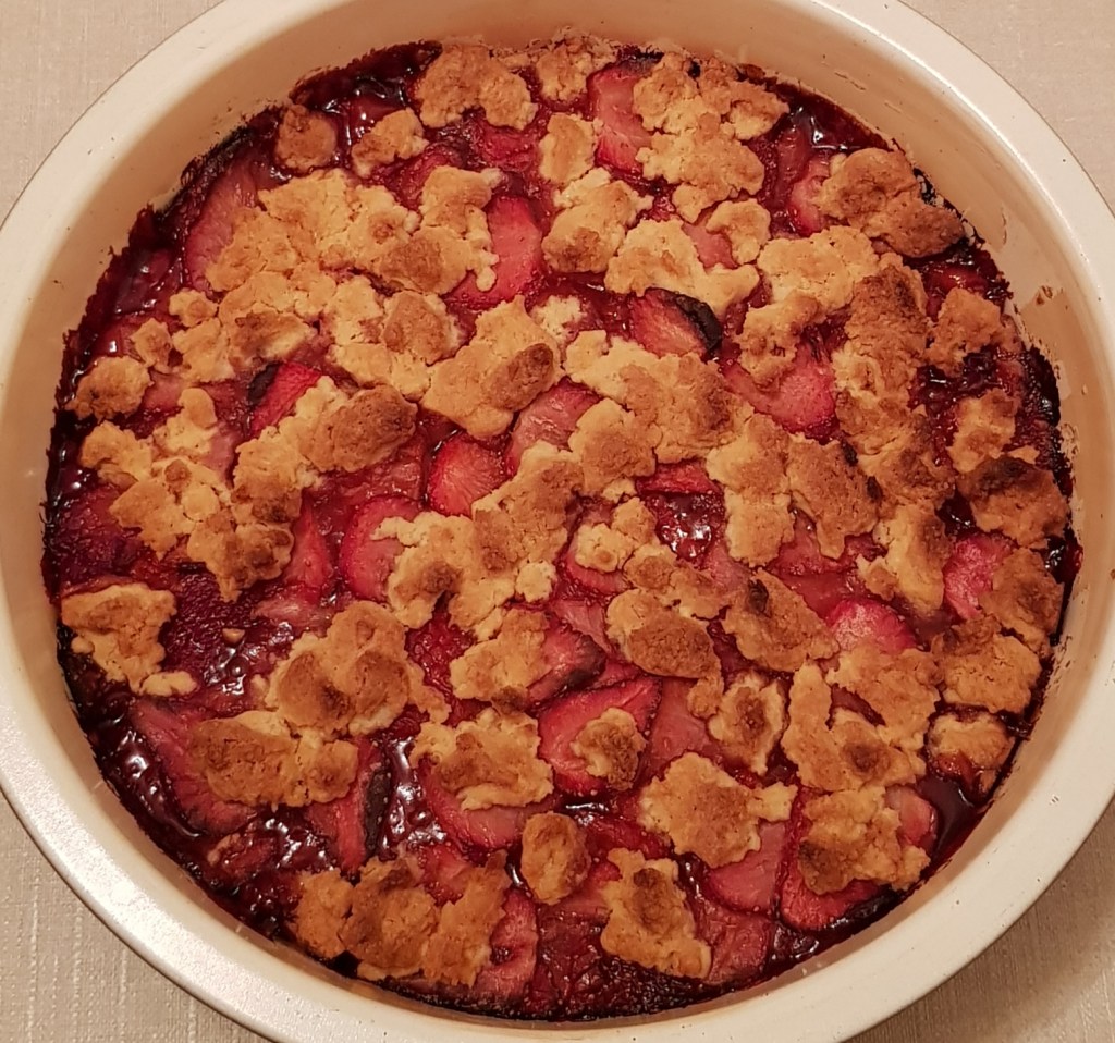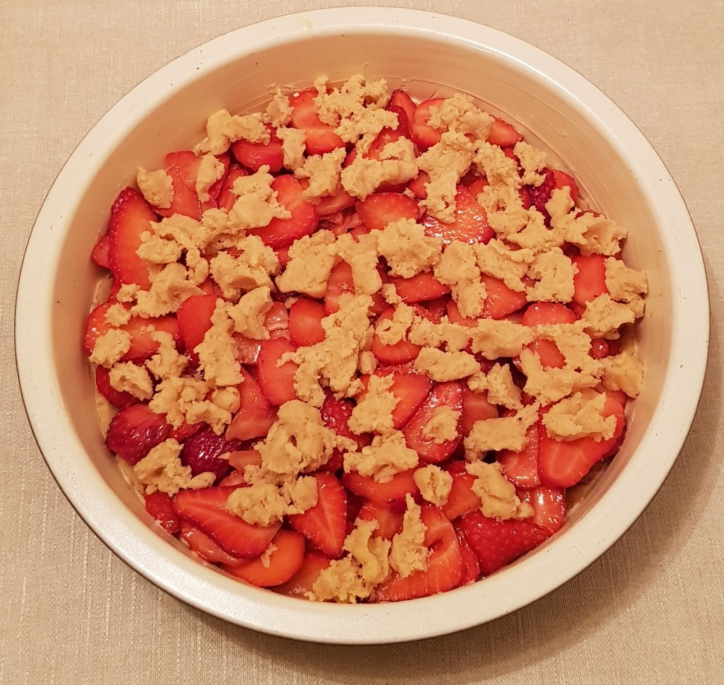 Se pune compoziția de fructe, apoi se împrăștie cu mâna aluatul sfărâmicios.