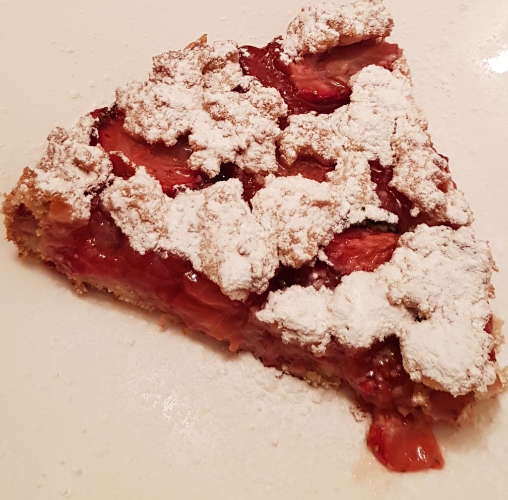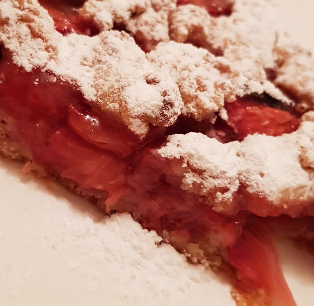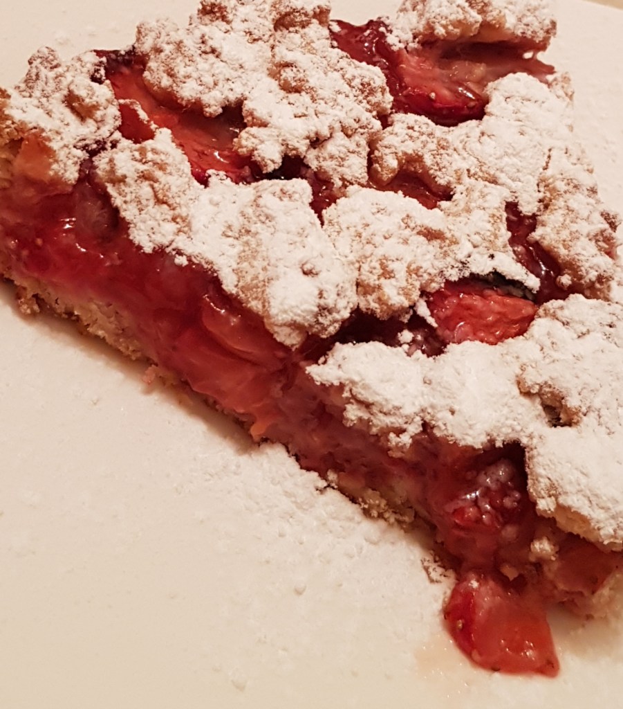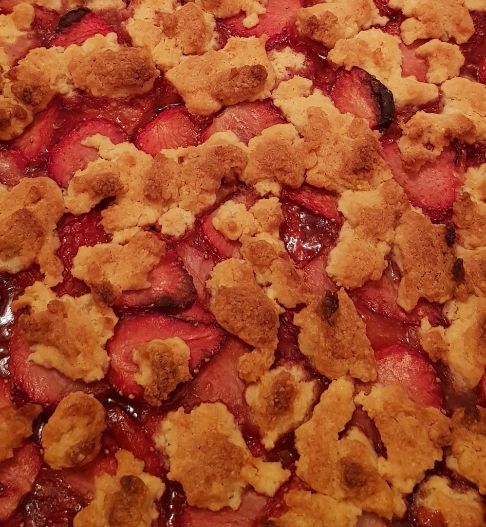 Se pune compoziția de fructe, apoi se împrăștie cu mâna aluatul sfărâmicios.
