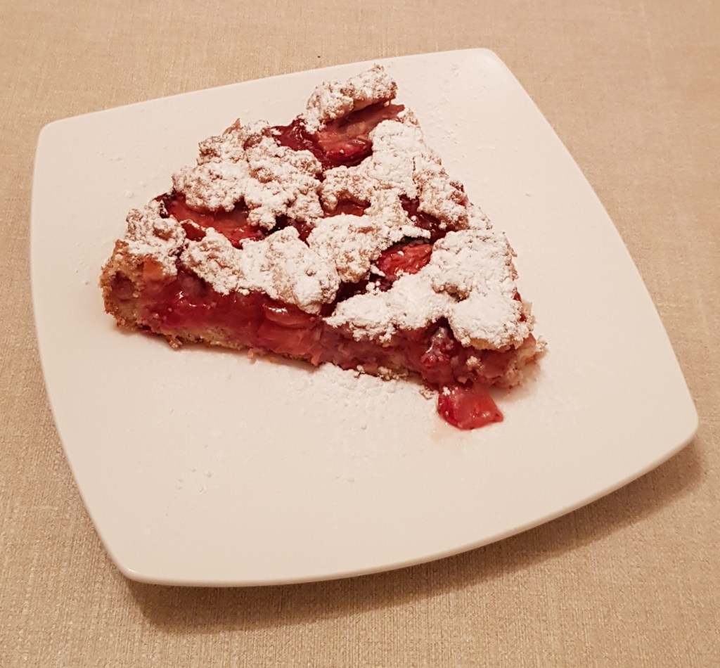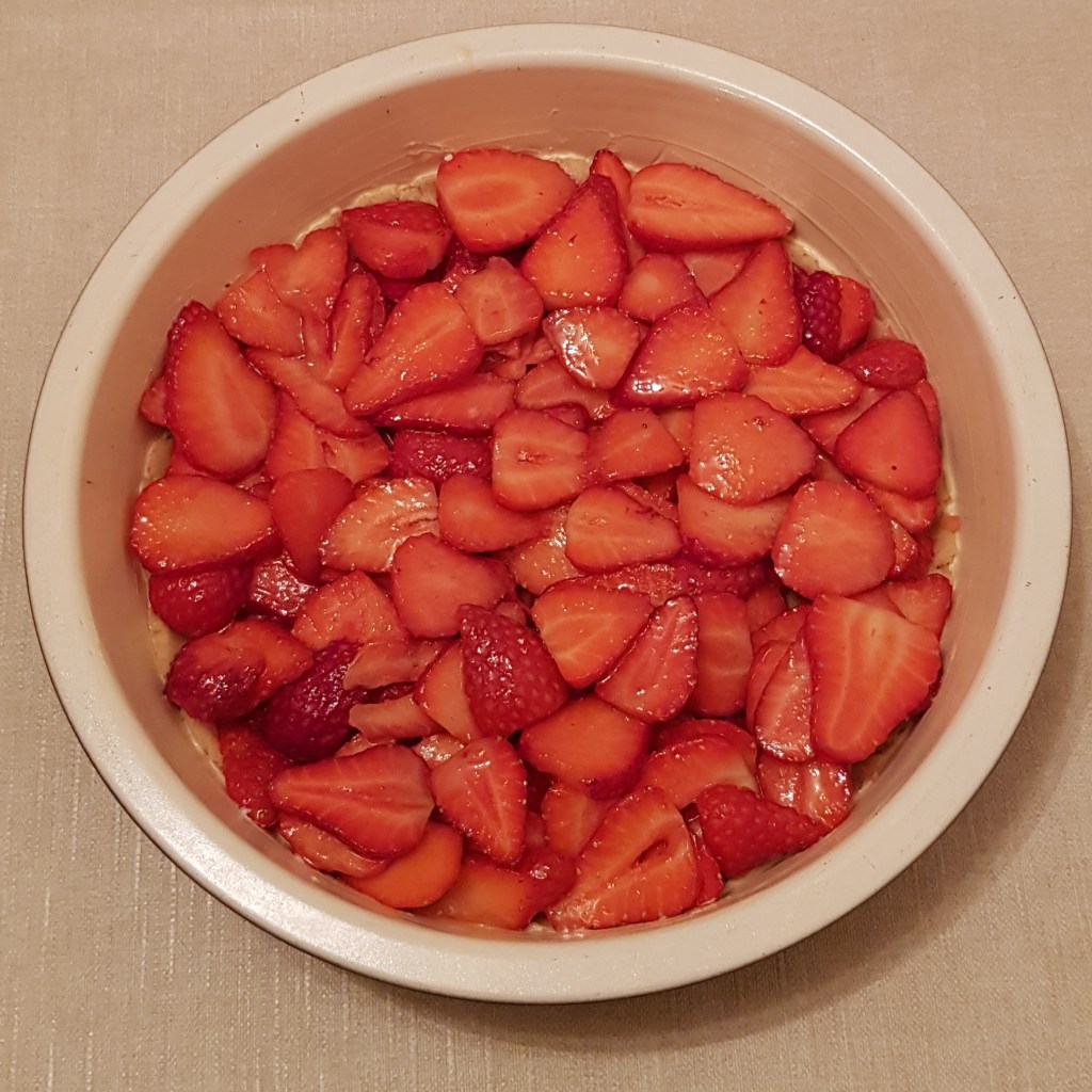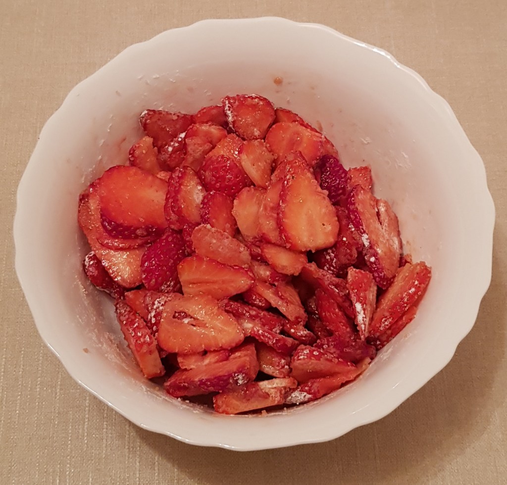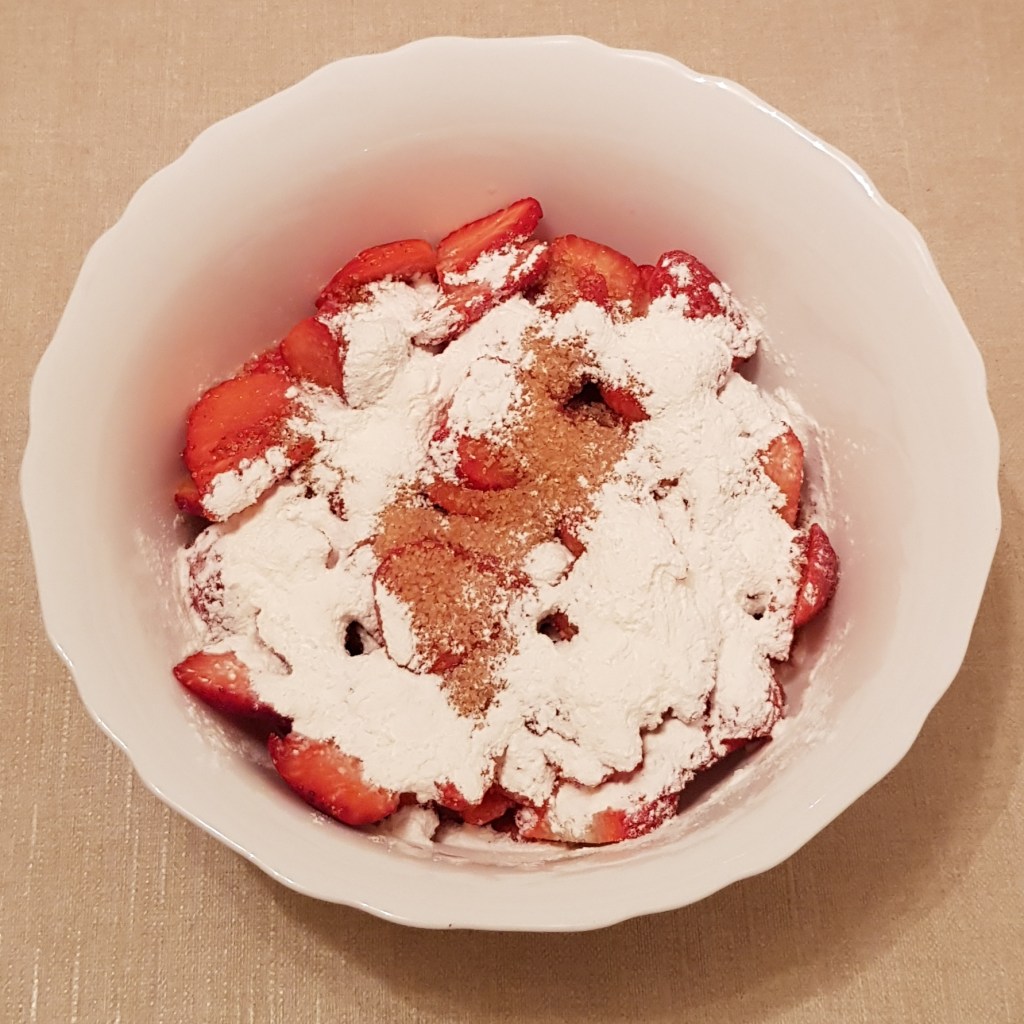 Căpșunii se curăță de codițe, se spală și se taie grosier. Rubarbărul se curăță de pieliță, se spală și se taie în bucăți de aproximativ 2cm. Peste fructe se toarnă sucul de lămâie, se adaugă zahărul și cele 2 linguri de amidon. Se amestecă pentru omogenizare și se lasă deoparte.