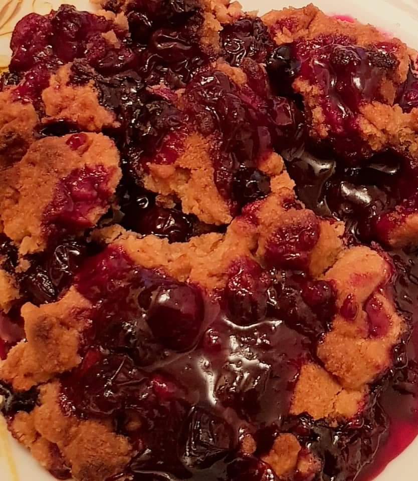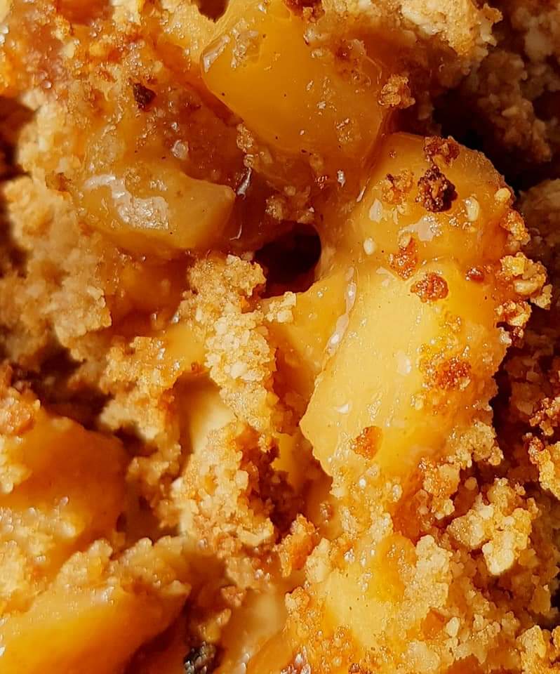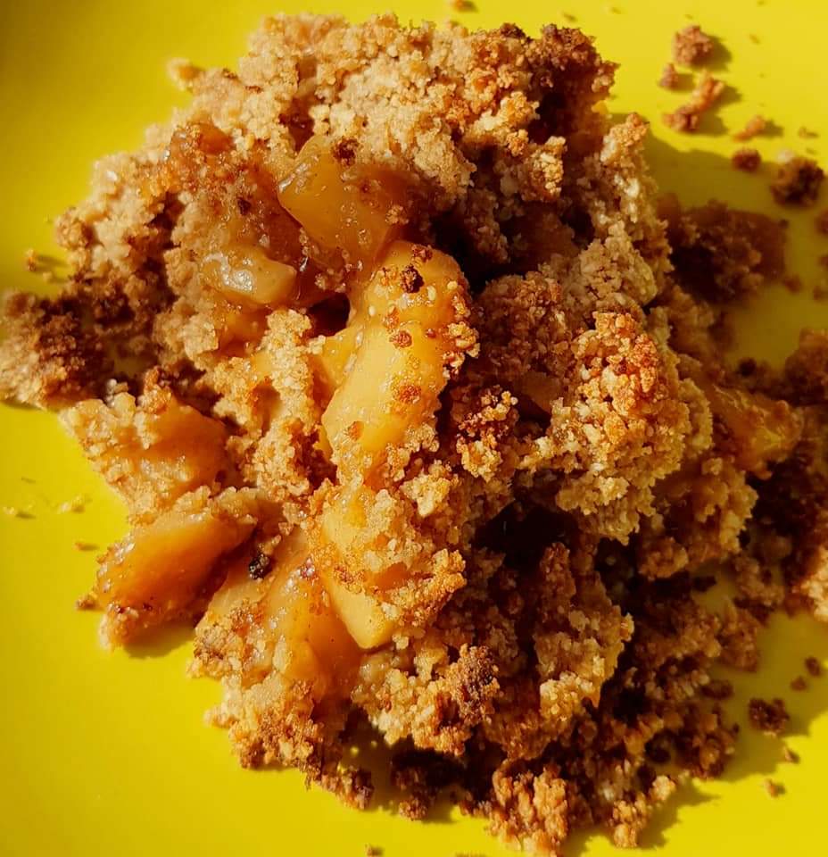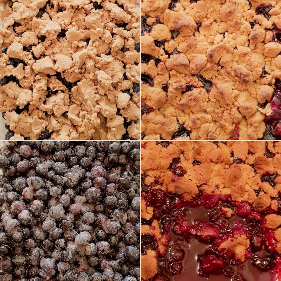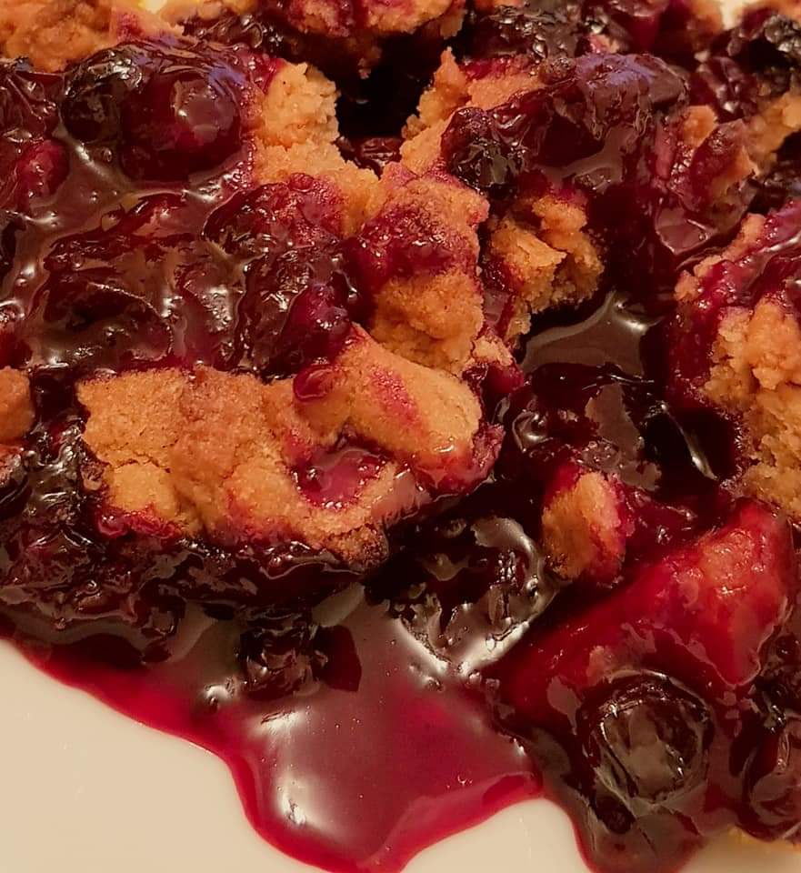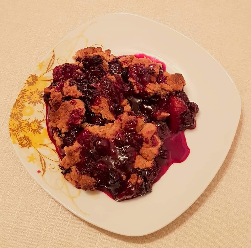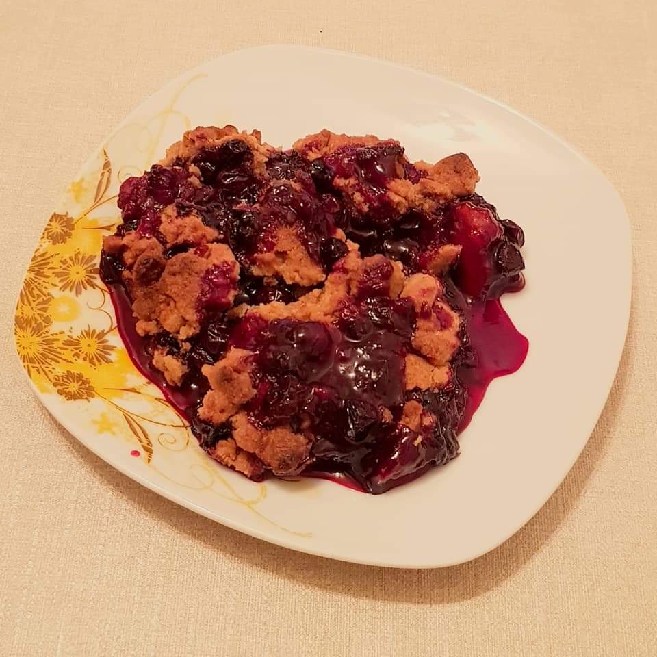 Se pune compoziția de fructe, apoi se împrăștie cu mâna aluatul sfărâmicios.