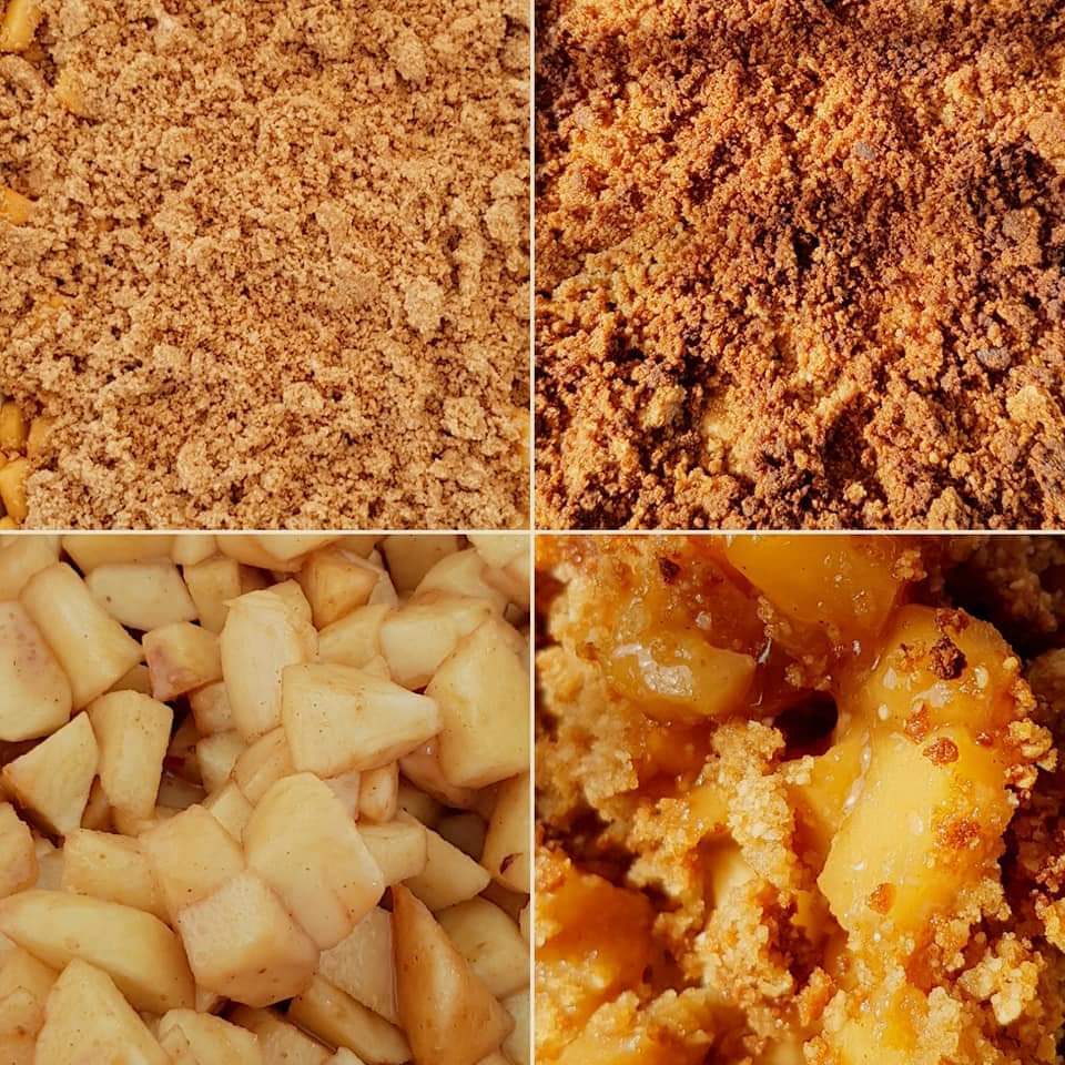 Pentru aluatul sfărâmicios se mixează untul la temperatura camerei cu zahărul brun și esența de vanilie. Apoi se adaugă făina și praful de sare și se amestecă ușor cu ajutorul mâinii până se obține un aluat sfărâmicios. Se unge o tavă cu unt. Eu am ales de data aceasta forme ramekin și o tavă mai mică.