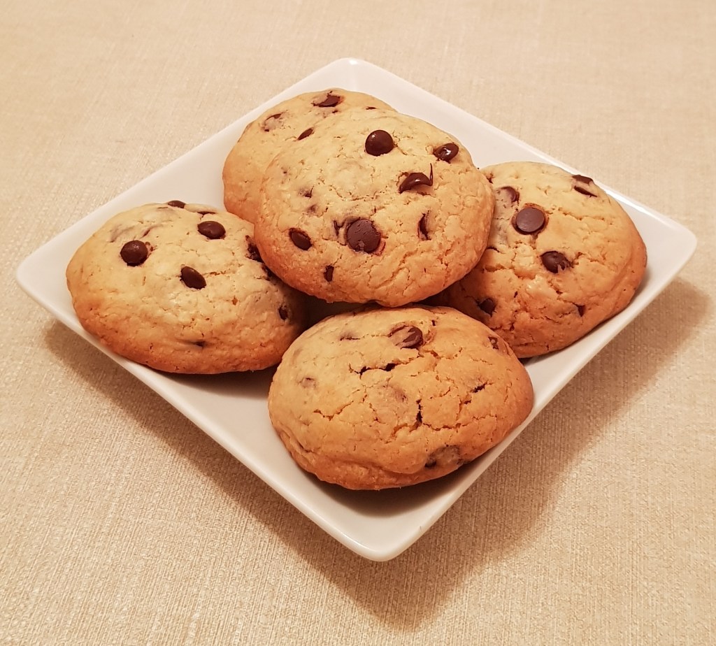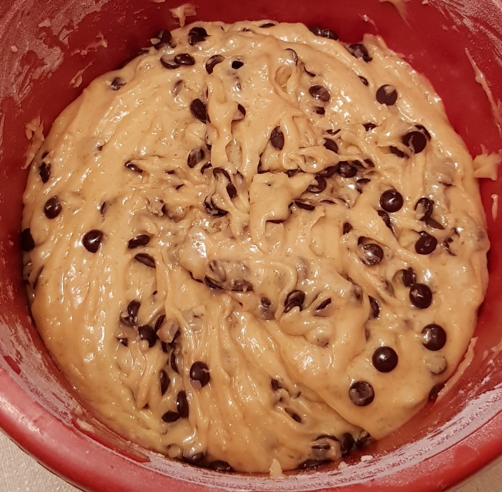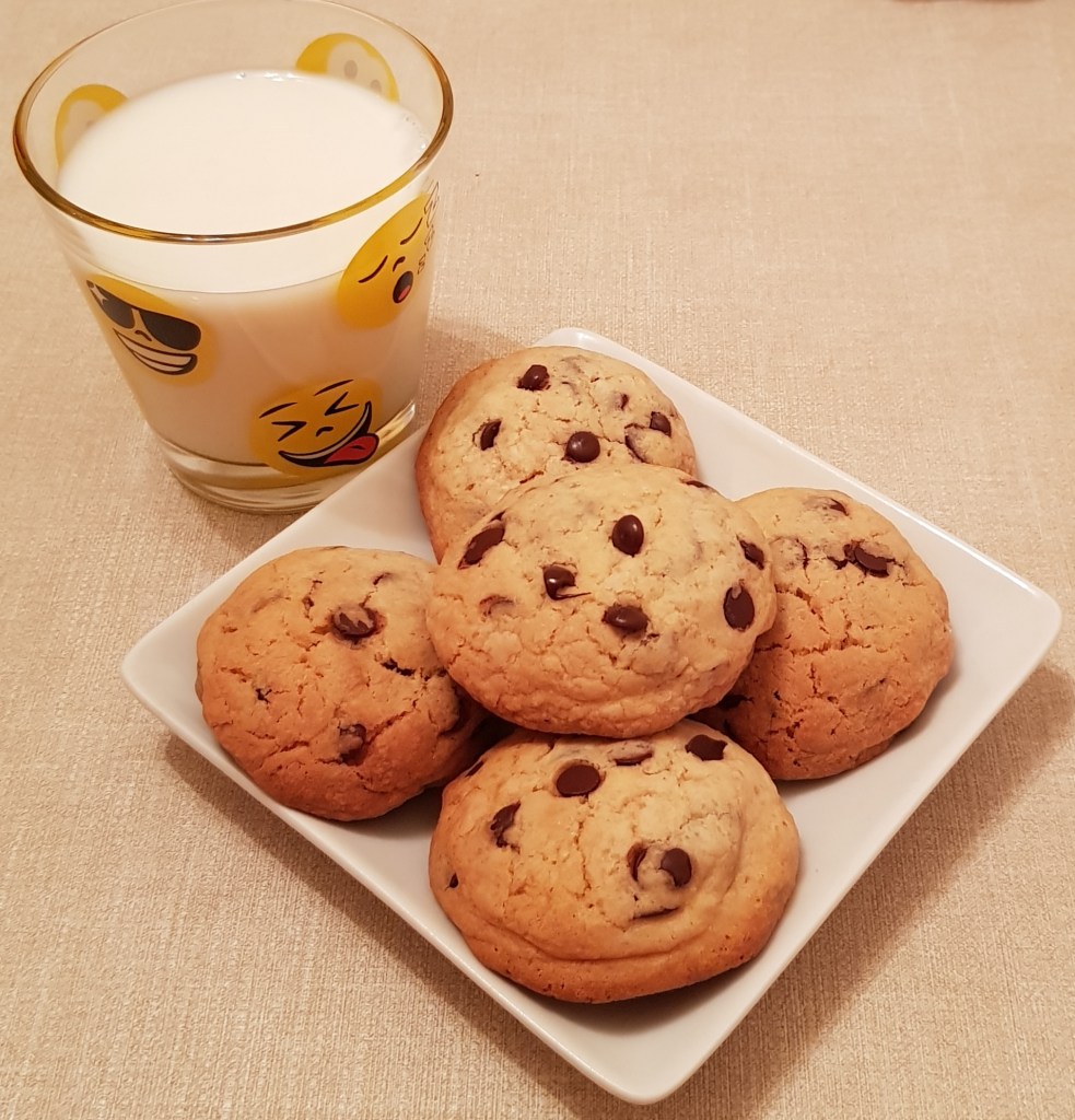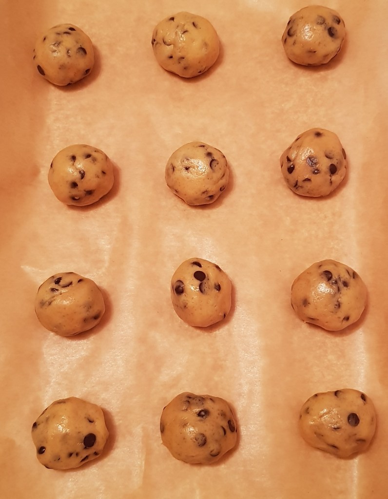 Într-un bol se amestecă făina cu praful de copt. Într-un alt bol se mixează untul de arahide, zahărul și untul la temperatura camerei până se obține o compoziție cremoasă. Se adaugă esența de vanilie și câte un ou pe rând amestecând foarte bine. Apoi se adaugă amestecul de făină și praf de copt pe rând, mixând la viteză mică doar cât să se încorporeze făina. Apoi se adaugă ciocolata tăiată grosier și se amestecă cu o spatulă sau lingură de lemn pentru încorporare. Se tapetează o tavă cu hârtie de copt și se formează bile din compoziție care se așează în tavă la distanță de aproximativ 2 cm una de cealaltă. Pentru că am preparat fursecurile împreună cu băiețelul meu de aproape 6 anișori, fursecurile noaste nu au ieșit egale, datorită celor 2 tipuri de mânuțe mici și mari care le-au preparat 😊