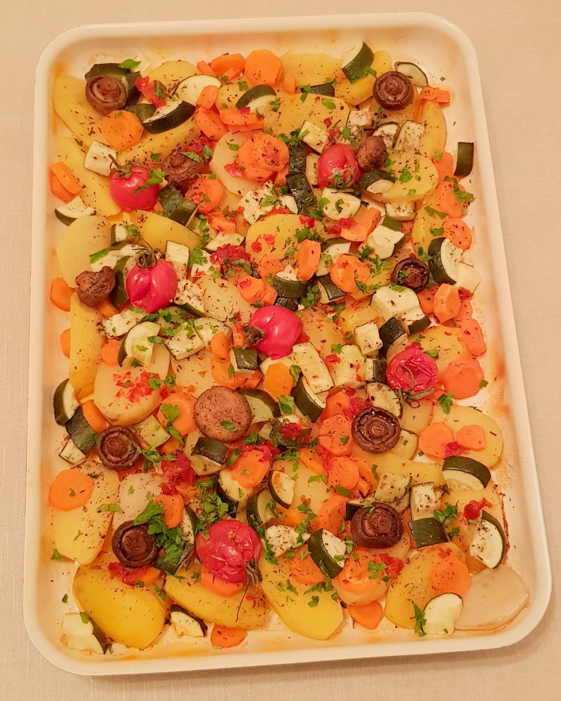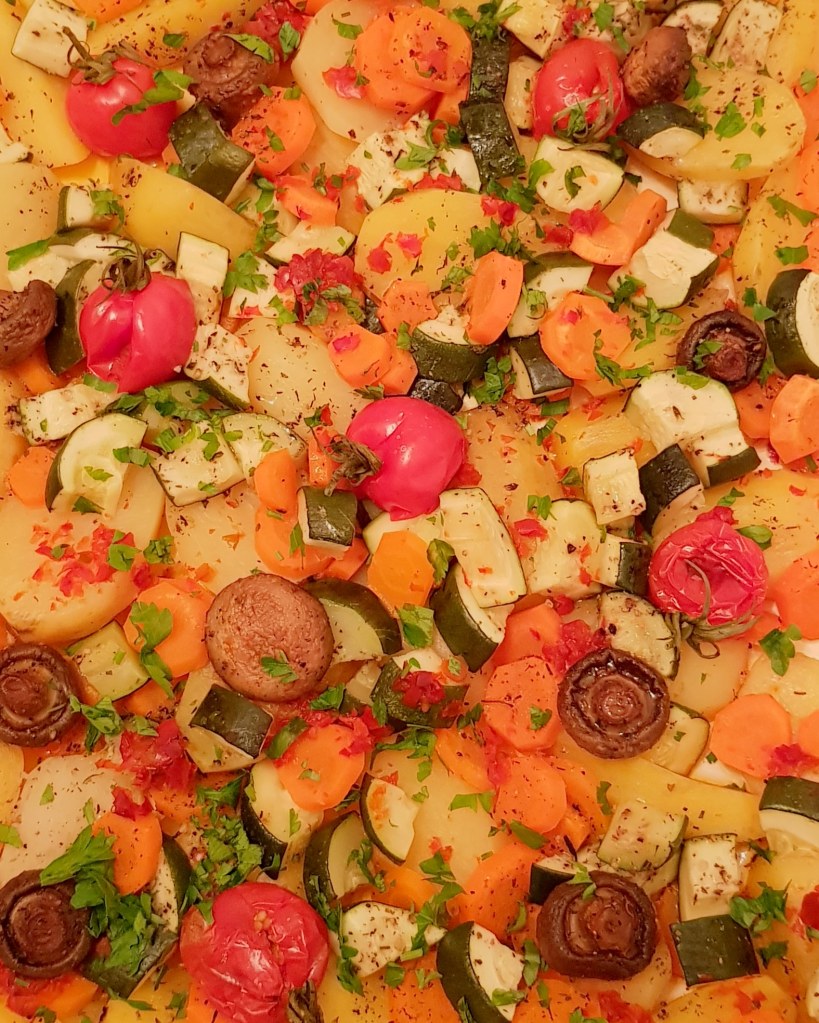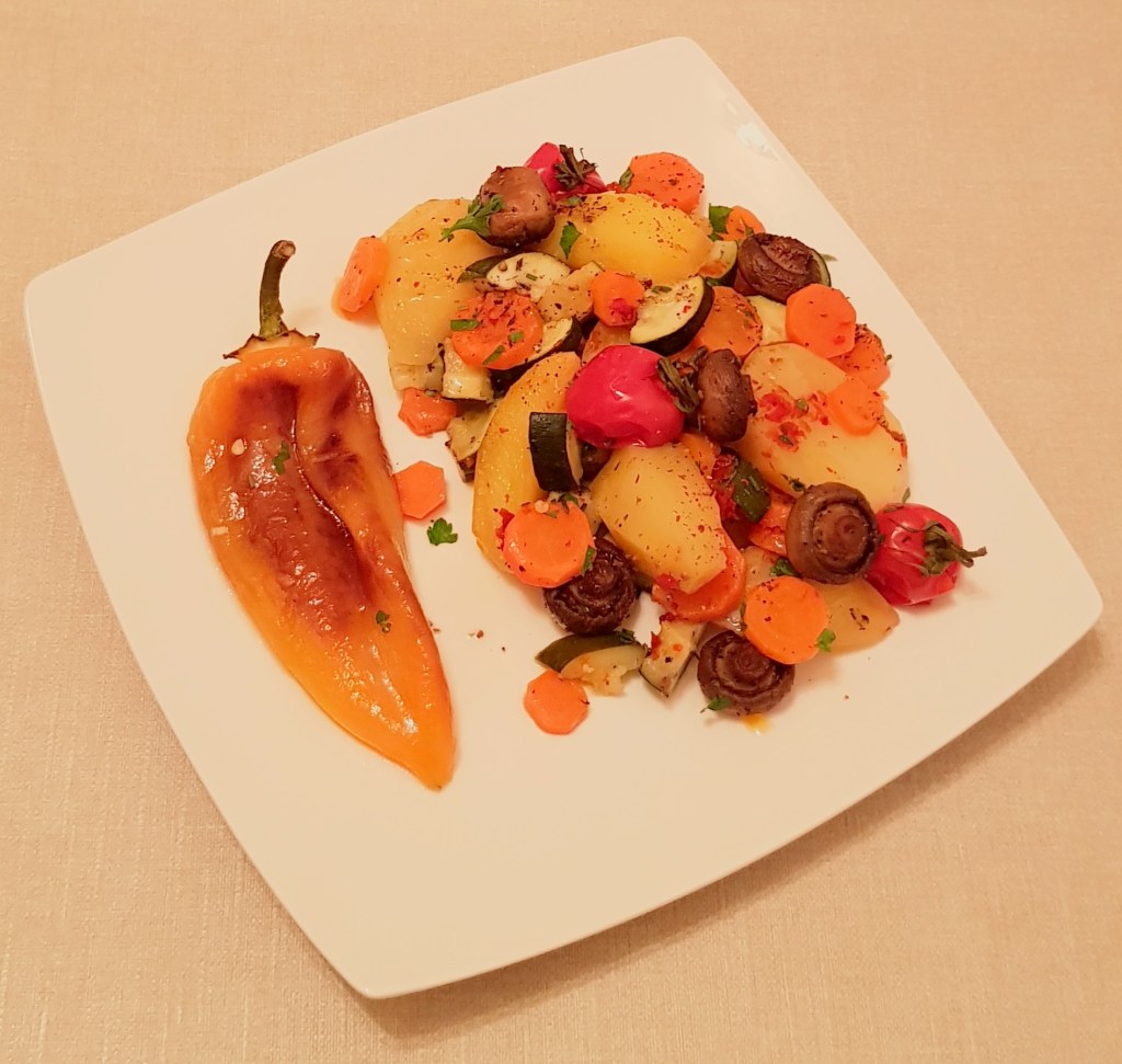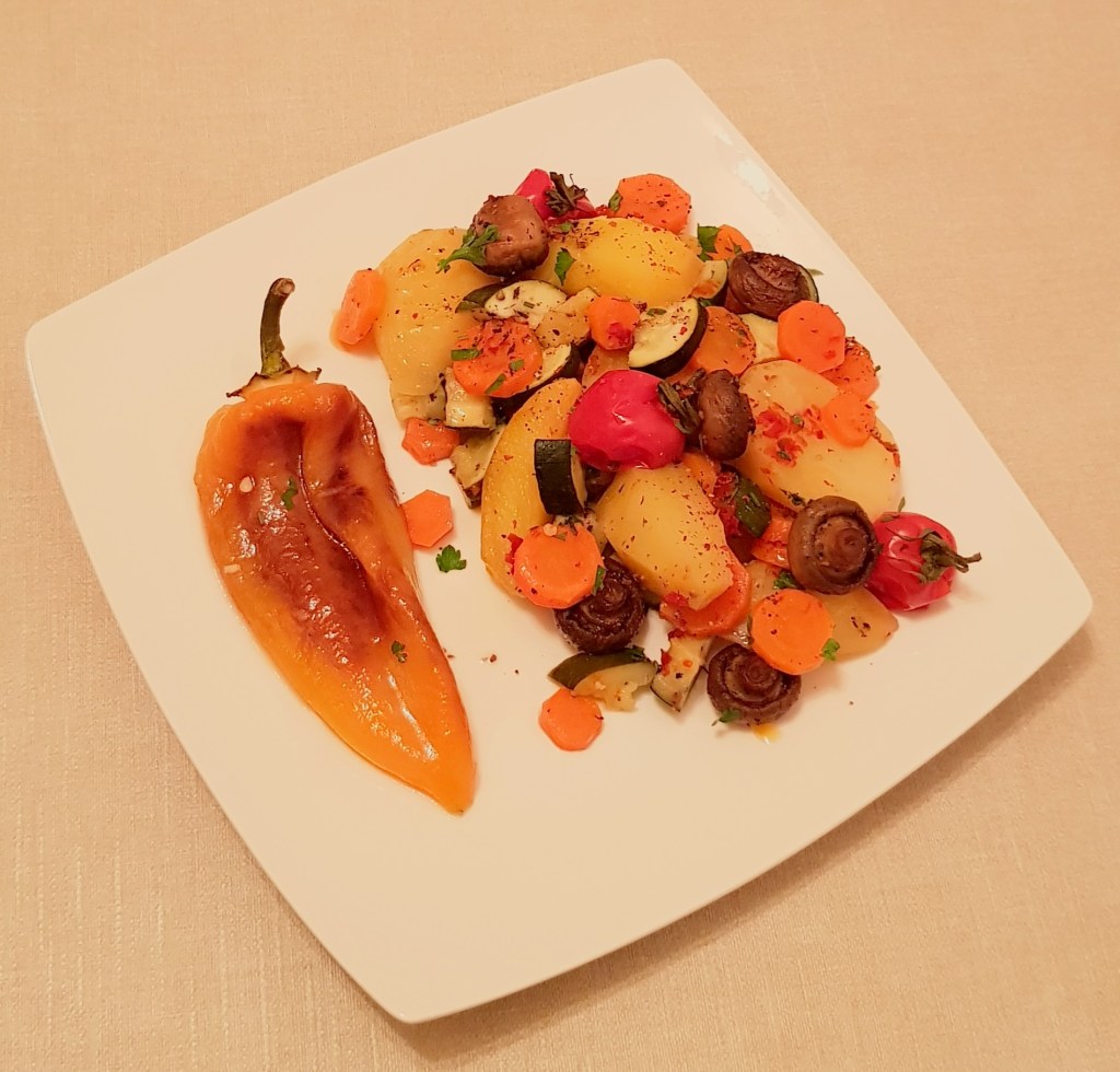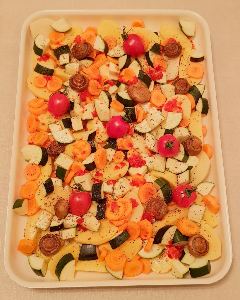 Ciupercile se spală foarte bine și se feliază. Eu am avut ciuperci mai mici și le-am tăiat jumătăți. Se pun ciupercile într-o tigaie cu 2 linguri de ulei și se prăjesc la foc mediu aproximativ 20 de minute până se gătesc, apoi se condimentează cu sare și piper în funcție de preferințe. Cartofii se curăță și se taie în sferturi. Morcovii se curăță și se taie rondele. Roșiile cherry se spală și se lasă întregi. Într-o tavă se toarnă aproximativ 3 linguri de ulei. Se adaugă cartofii, morcovii și pasta de ardei. Se amestecă pentru omogenizare. Se condimentează cu sare și piper în funcție de preferințe. Se adaugă ciupercuțele prăjite și roșiile cherry.