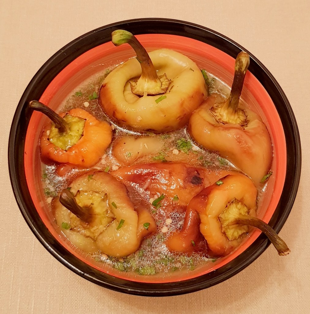 Se presară pătrunjelul verde tocat și usturpiul pisat. La final se adaugă apa și se acoperă tava cu folie de aluminiu. Apoi se pune în cuptorul preîncălzit la 180° pentru aproximativ 45 de minute.