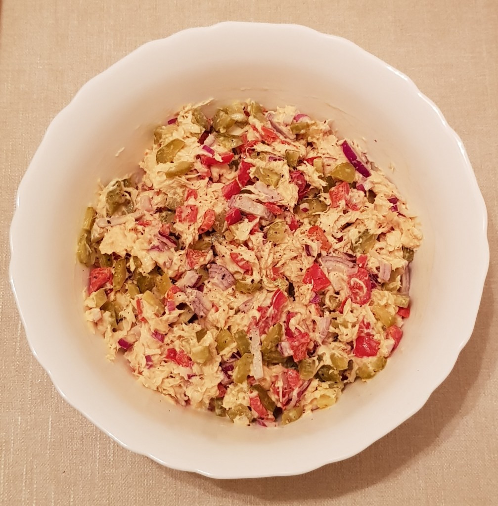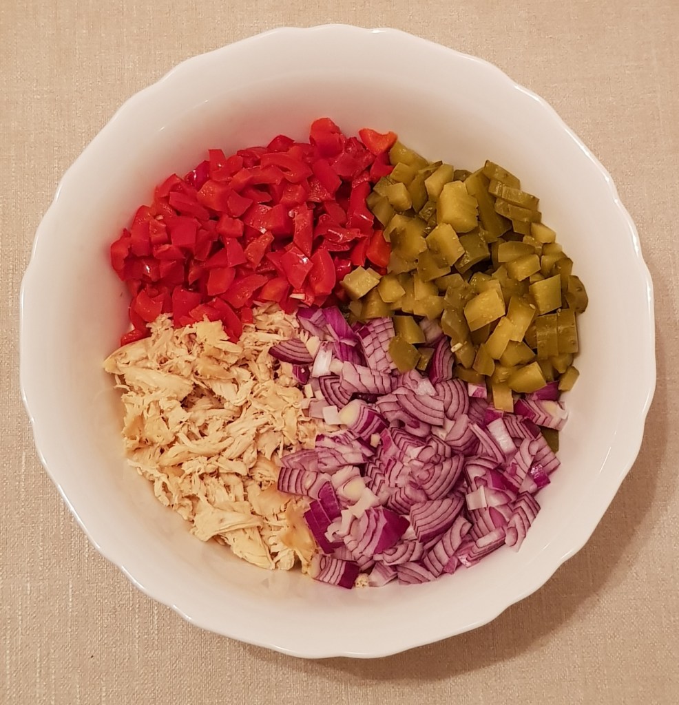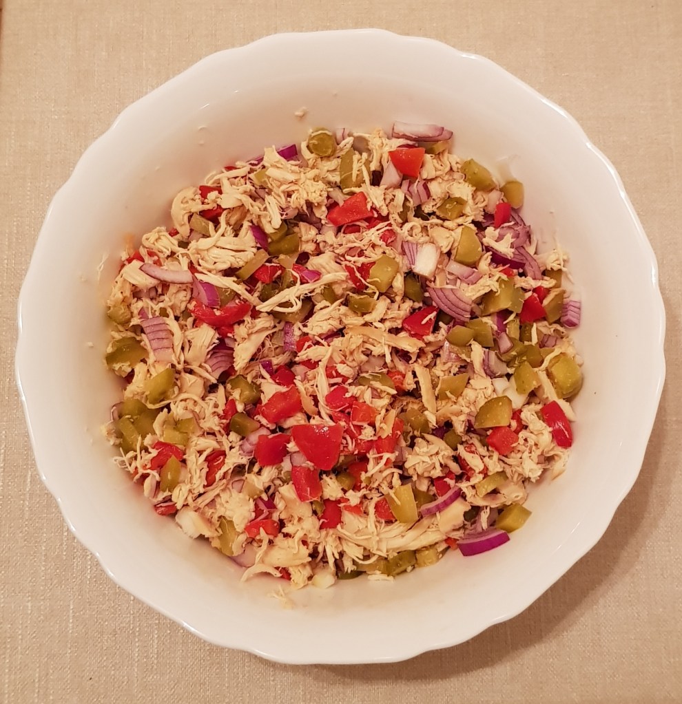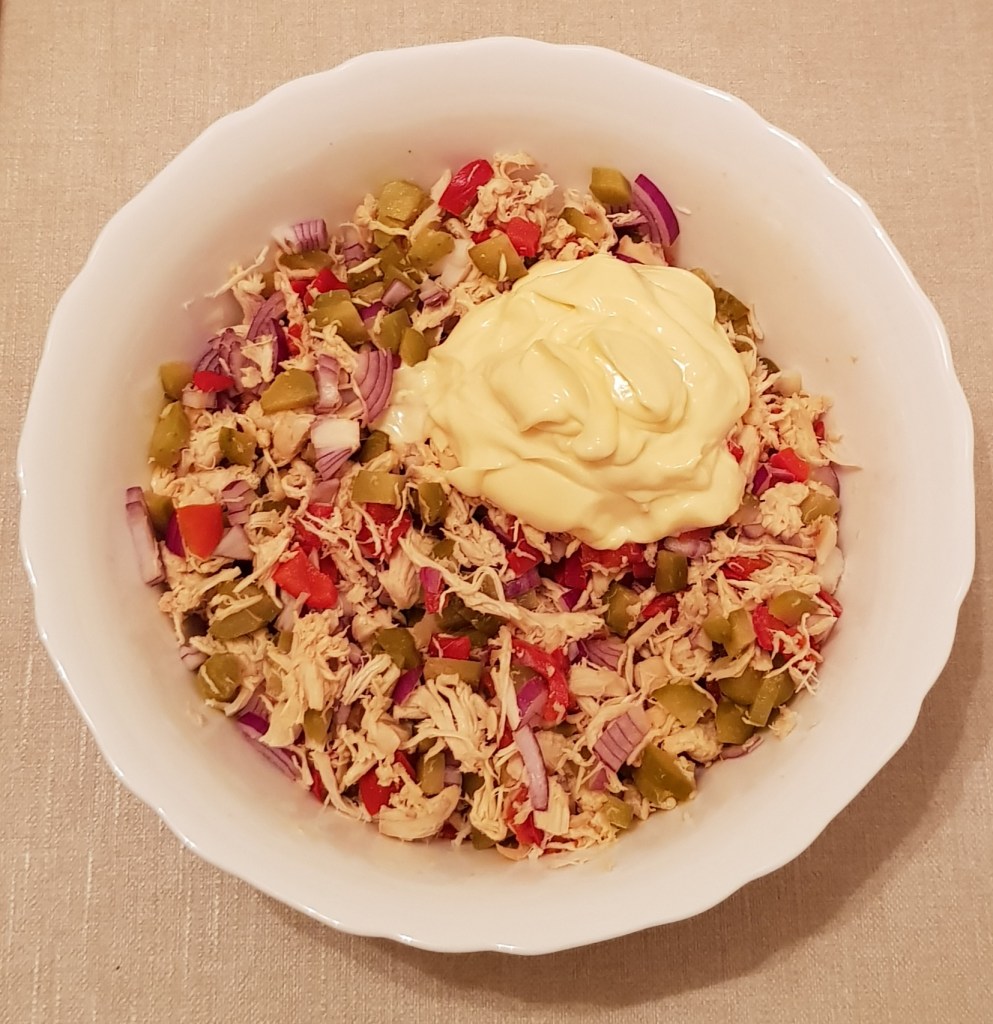 Pieptul de pui se feliază, se condimentează cu sare și piper, apoi se frige în ulei încins pe ambele părți până se rumenește frumos. Se scoate pe un șervețel absorbant și se lasă câteva minute la răcit. Conserva de porumb se scurge de apă. Castraveții se taie cubulețe sau în funcție de preferințe. Pieptul de pui se taie cubulețe cât mai mici posibil. Se amesteca toate ingredientele într-un bol. Se adaugă maioneza și se mai amestecă o dată pentru omogenizare. Se condimentează cu sare și piper în funcție de preferințe. Se ornează cu codițe de ceapă verde tăiate mărunt.