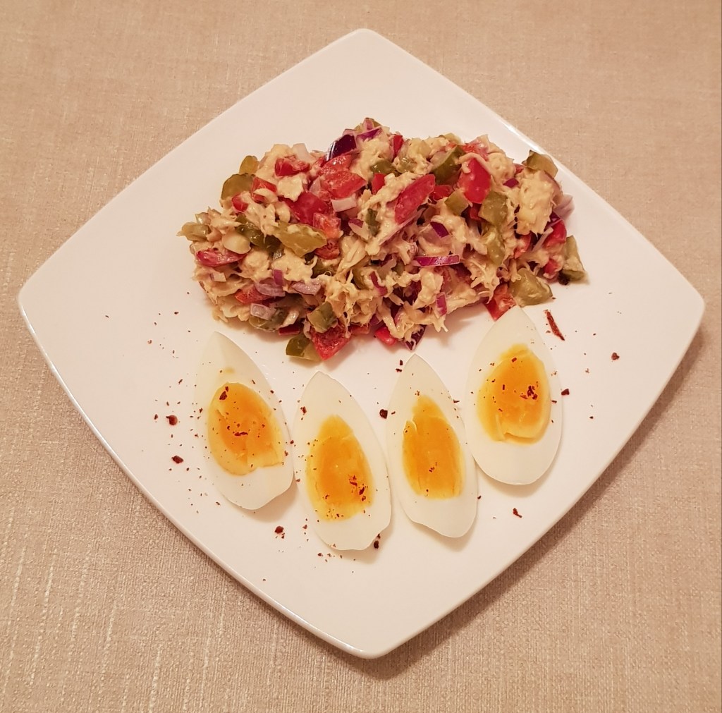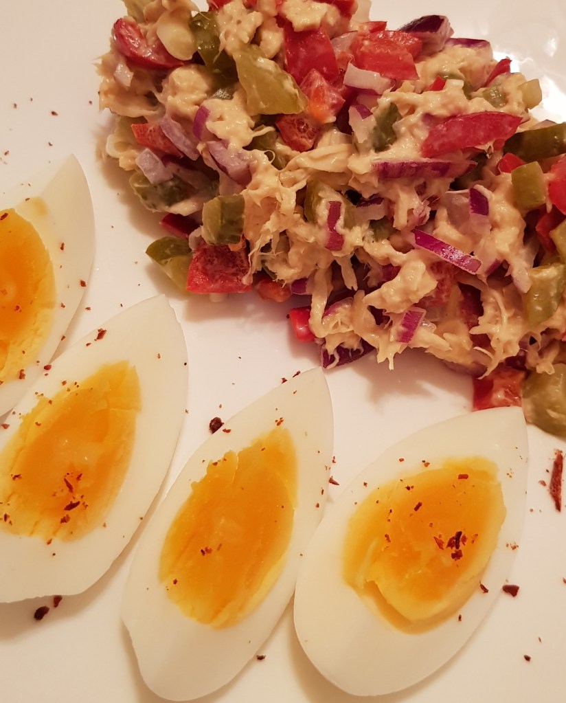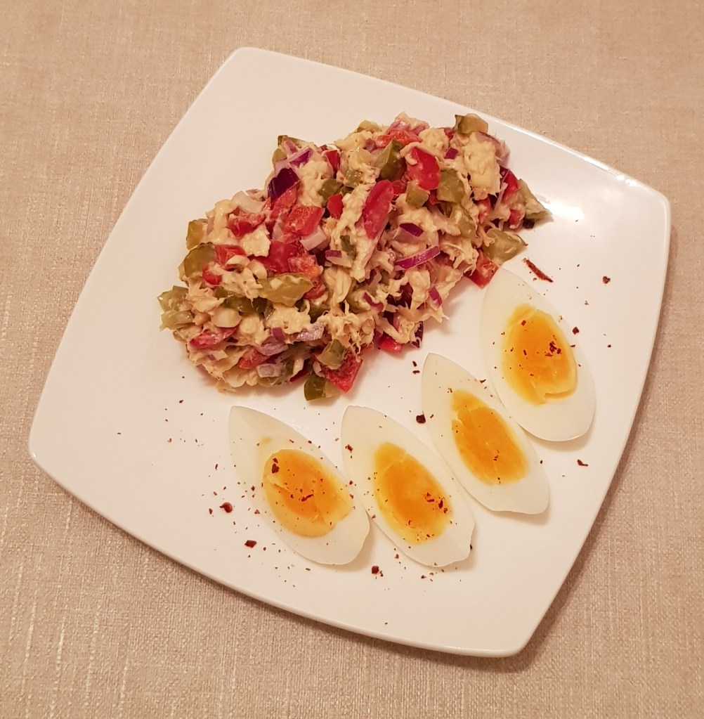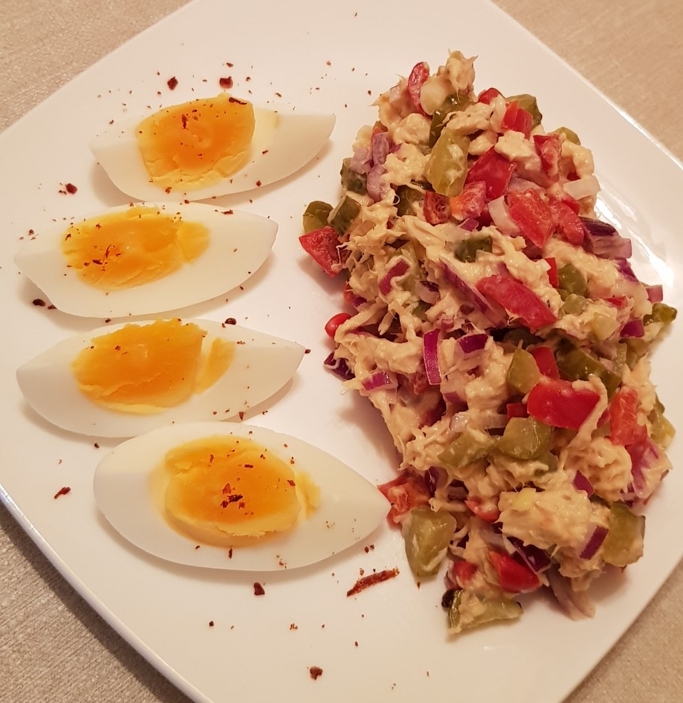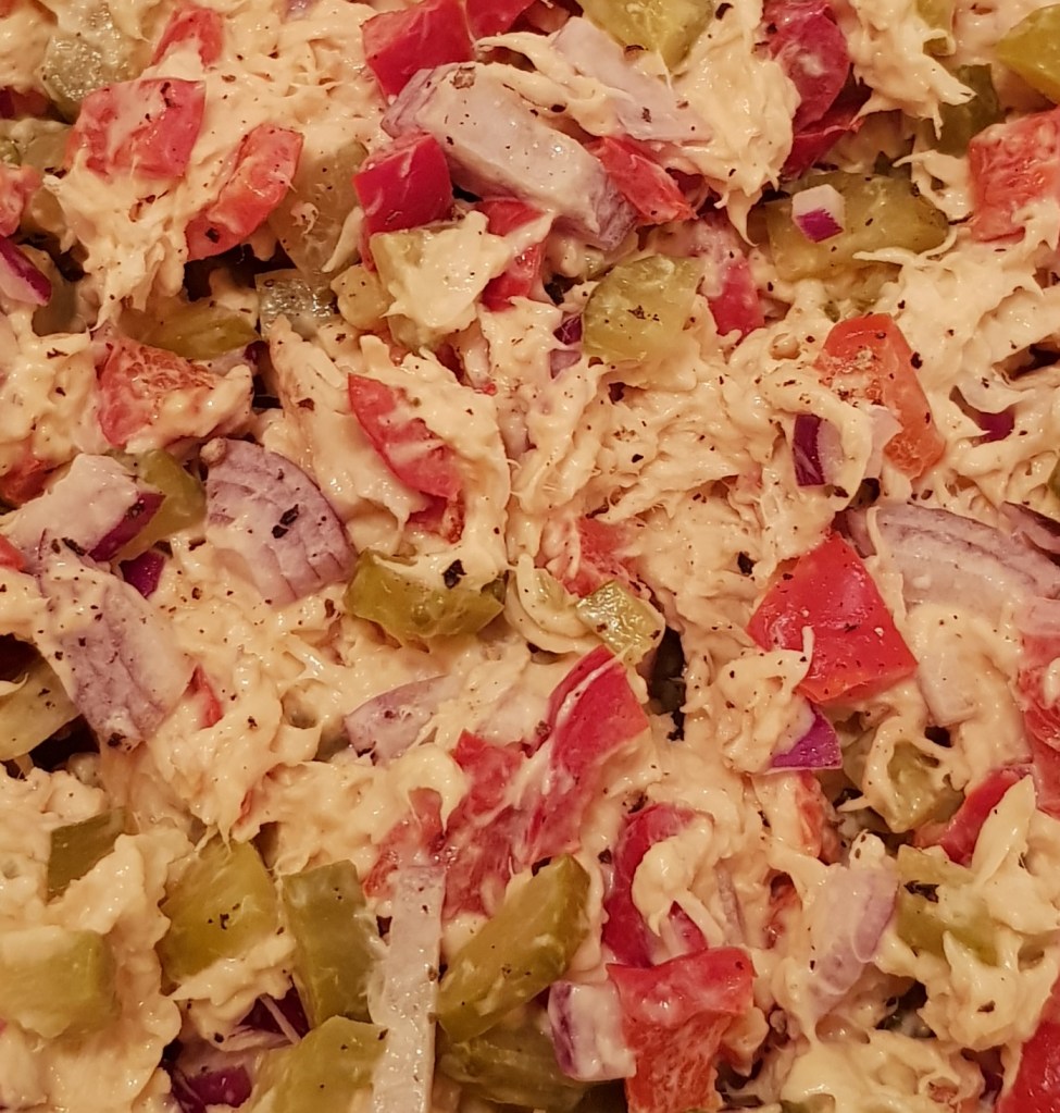 Pieptul de pui se feliază, se condimentează cu sare și piper, apoi se frige în ulei încins pe ambele părți până se rumenește frumos. Se scoate pe un șervețel absorbant și se lasă câteva minute la răcit. Conserva de porumb se scurge de apă. Castraveții se taie cubulețe sau în funcție de preferințe. Pieptul de pui se taie cubulețe cât mai mici posibil. Se amesteca toate ingredientele într-un bol. Se adaugă maioneza și se mai amestecă o dată pentru omogenizare. Se condimentează cu sare și piper în funcție de preferințe. Se ornează cu codițe de ceapă verde tăiate mărunt.