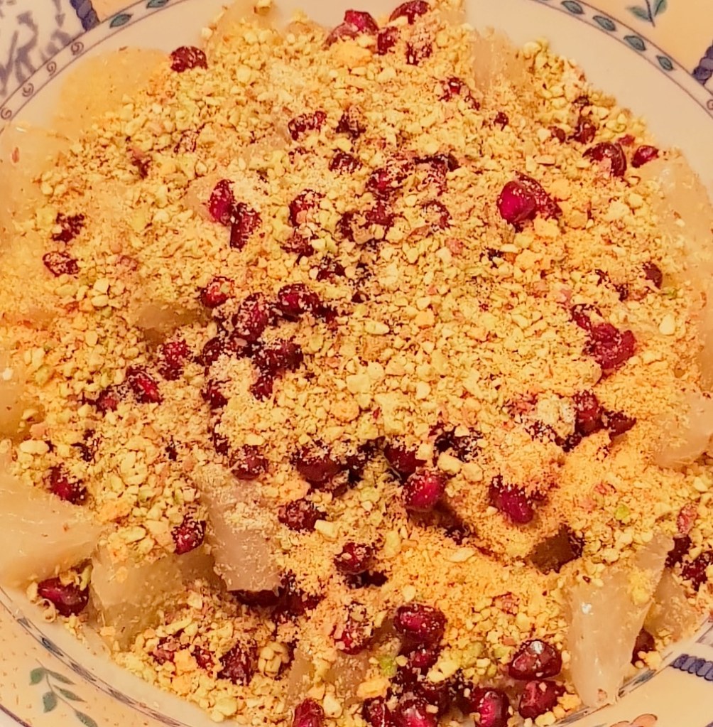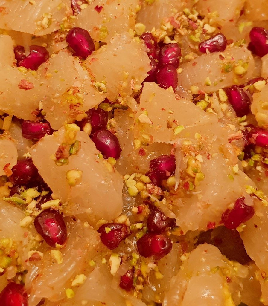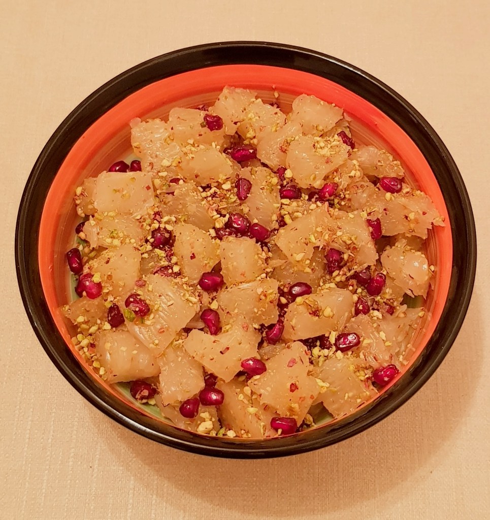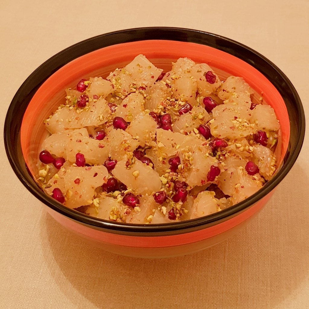 Pomelo se curăță și se taie cubulețe. În funcție de preferințe puteți să îi lăsați sau să îi curățați învelișul alb. Fisticul se macină cu ajutorul unui robot de bucătărie. Într-un bol se adaugă cubulețele de pomelo, semințele de rodie, fisticul măcinat, coaja de lămâie și de portocală (eu folosesc întotdeauna coajă de lămâie și portocală cumpărată la pliculeț și vă sfătuiesc să faceți la fel, nu utilizați coaja citricelor din supermarket). Se adaugă mierea de albine și se amestecă ușor pentru omogenizare. Astfel veți obține o salată delicioasă și sănătoasă 😋