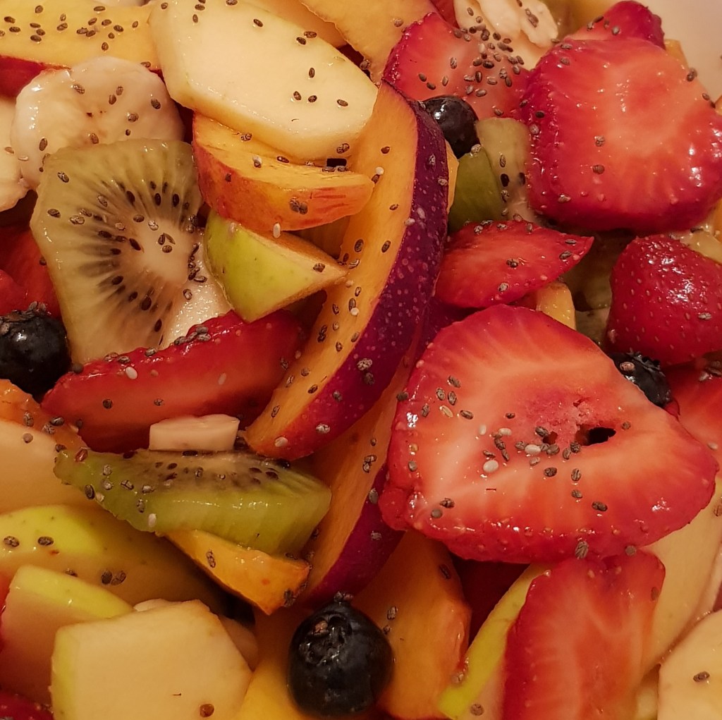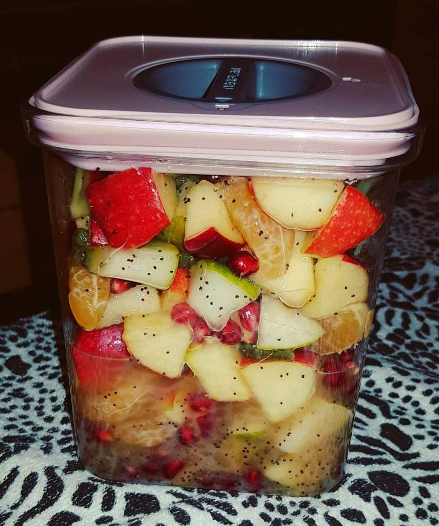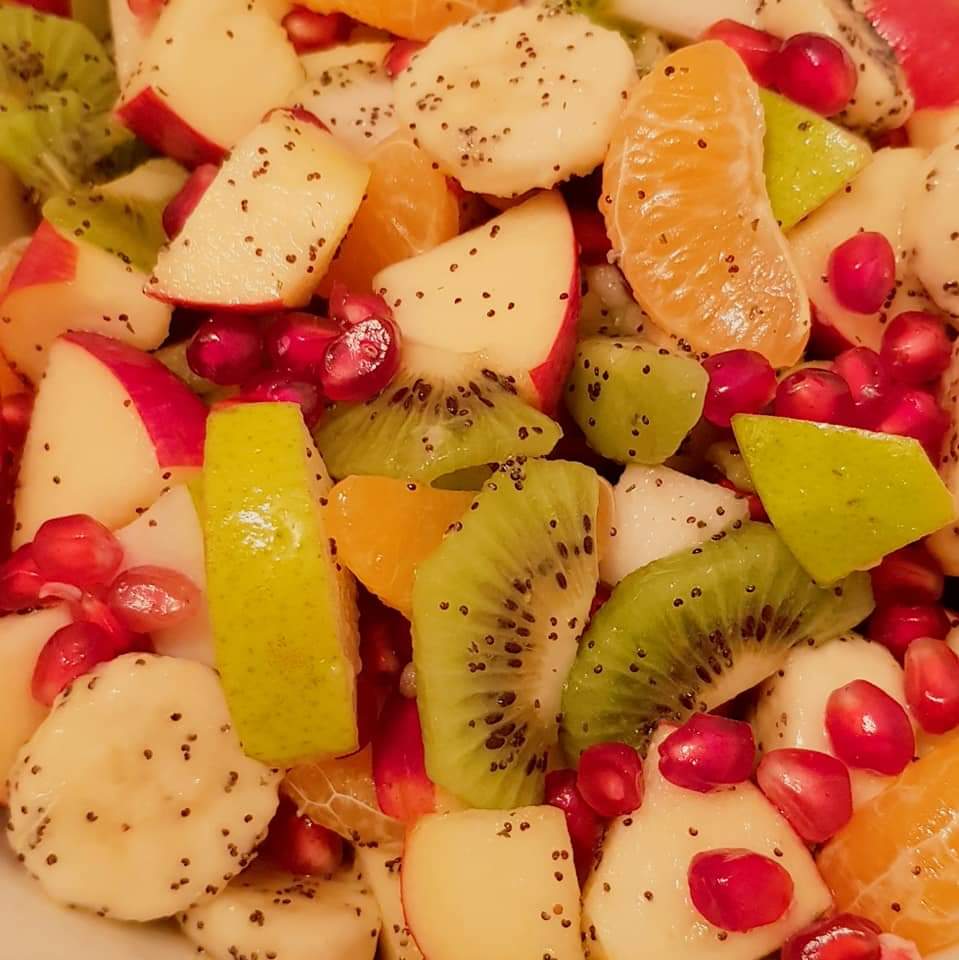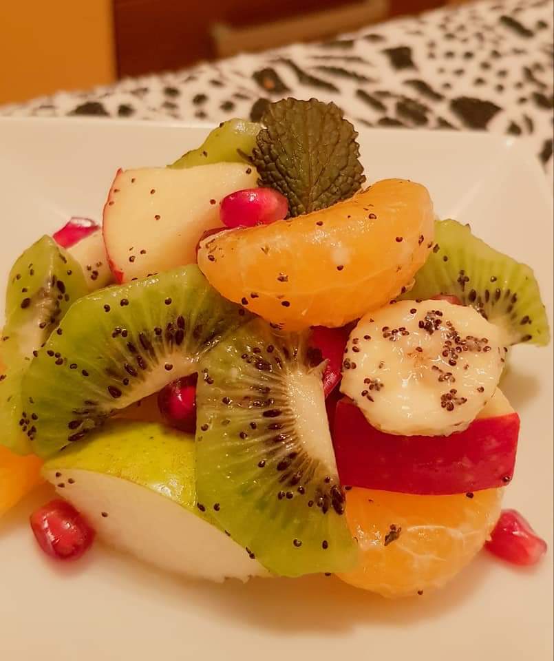 Pe blogul meu găsiți mai multe salate de fructe, fiecare cu ingredientele sale speciale. Azi vă propun o rețetă de salată de fructe mai simplă. Am ales doar 3 fructe: piersici, mango și mere verzi. Și, pentru că, mie îmi place să adaug fructe confiate, nuci sau semințe în salatele mele de fructe, am ales de această dată merișoarele și semințele de mac. Și, pentru o salată delicioasă, am preparat un mic dressing din suc de lămâie și miere cu bucăți de fructe de pădure. Delicios 😋
