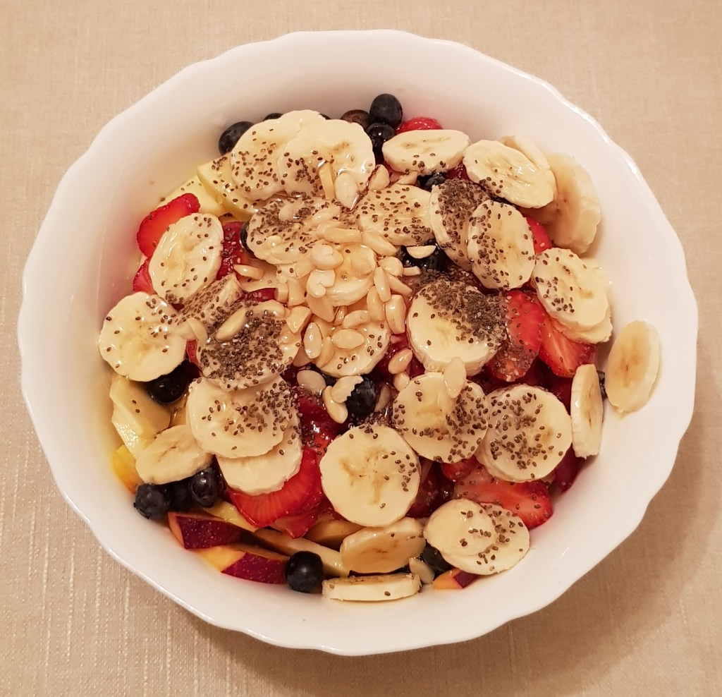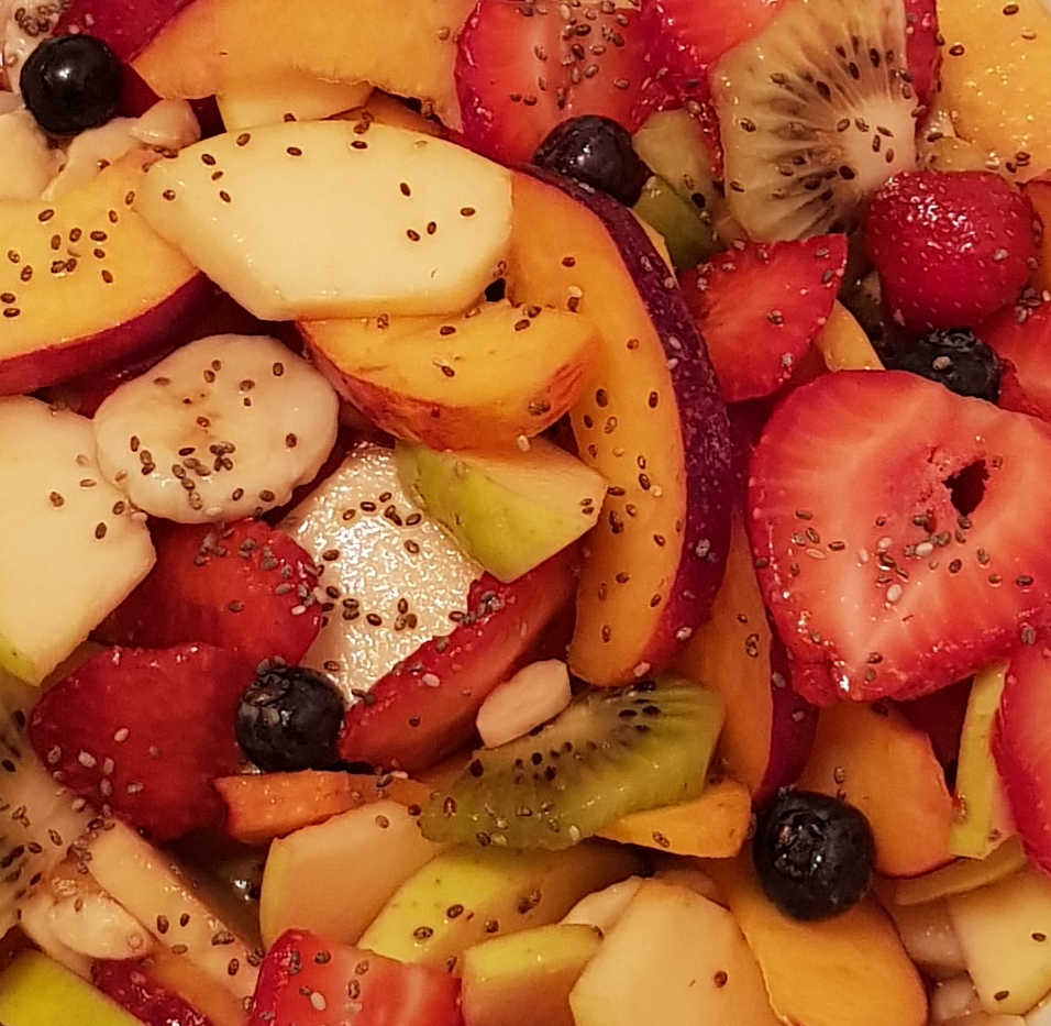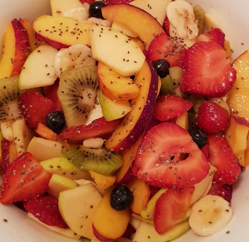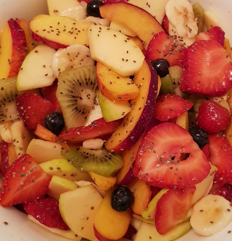 Pe blogul meu găsiți mai multe salate de fructe, fiecare cu ingredientele sale speciale. Azi vă propun o rețetă de salată de fructe mai simplă. Am ales doar 3 fructe: piersici, mango și mere verzi. Și, pentru că, mie îmi place să adaug fructe confiate, nuci sau semințe în salatele mele de fructe, am ales de această dată merișoarele și semințele de mac. Și, pentru o salată delicioasă, am preparat un mic dressing din suc de lămâie și miere cu bucăți de fructe de pădure. Delicios 😋