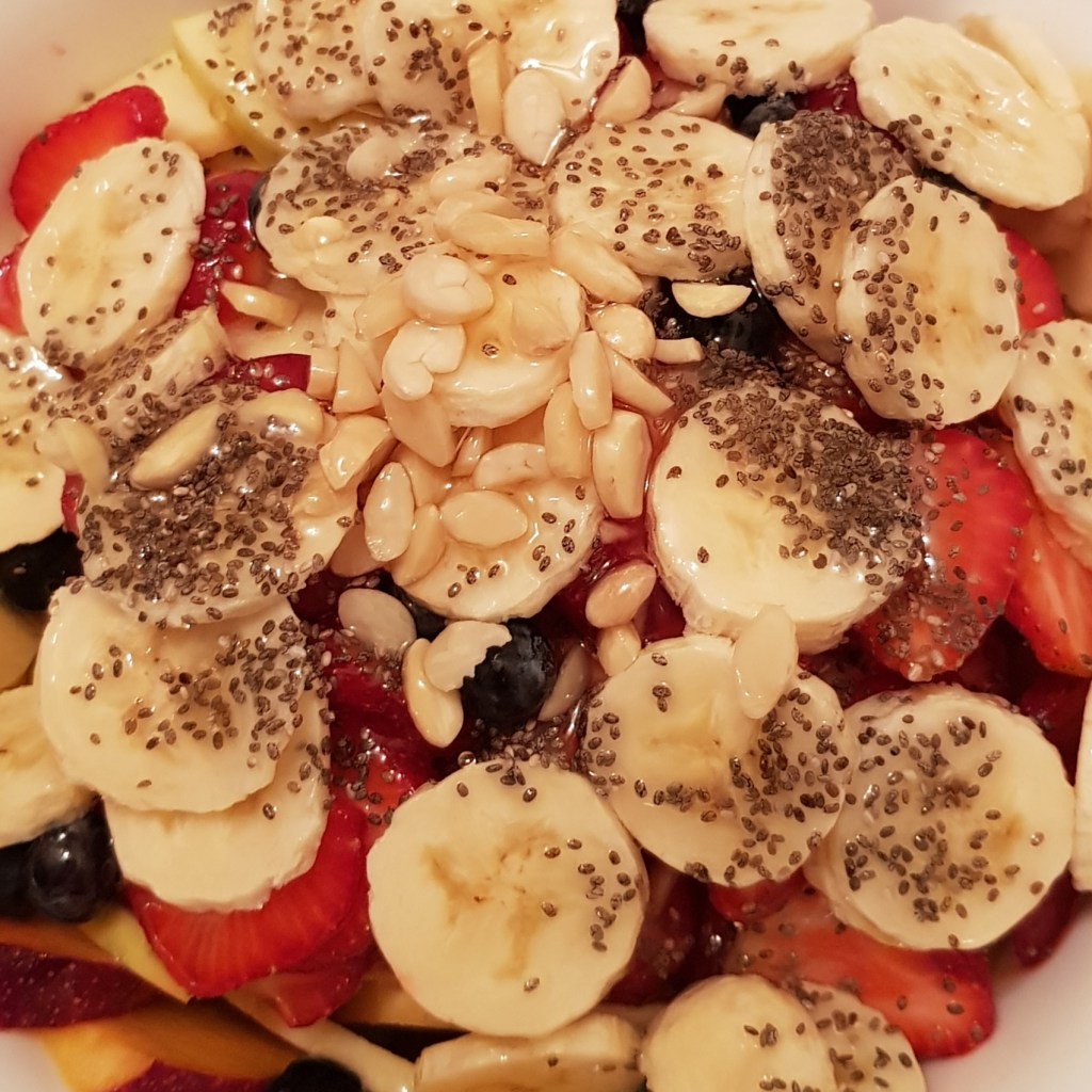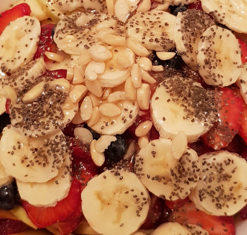 Se prepară dressingul din amestecul mierii cu sucul de lămâie și se toarnă peste fructe. Se amestecă ușor pentru omogenizare și îmbinarea aromelor. Opțional puteți adăuga frișcă în momentul servirii. Eu am ales puțin sos de ciocolată 😋