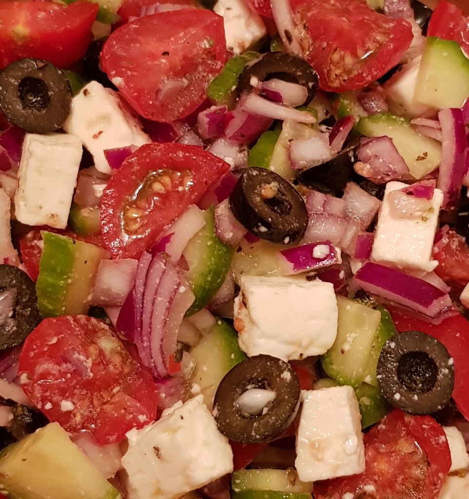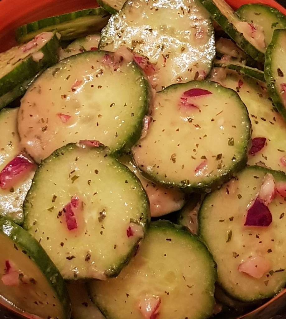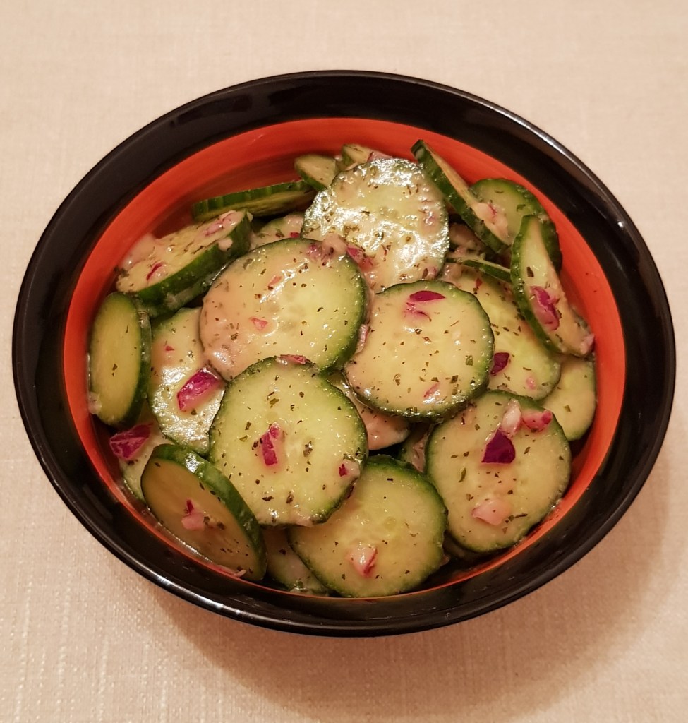 Castravetele se spală foarte bine și se taie rondele. Ceapa roșie se curăță, se spală și se taie mărunt. Într-un borcan se adaugă uleiul de măsline, oțetul, ierburile uscate, zahărul, usturoiul pisat, muștarul, sare și piper în funcție de preferințe. Se pune capacul și se agită foarte bine până se obține un dressing. Într-un bol se pun feliile de castravete și ceapa tocată. Se adaugă dressingul și se amestecă pentru omogenizare. Salata de castraveți și ceapă roșie e delicioasă alături de diferite preparate din carne sau garnituri 😋