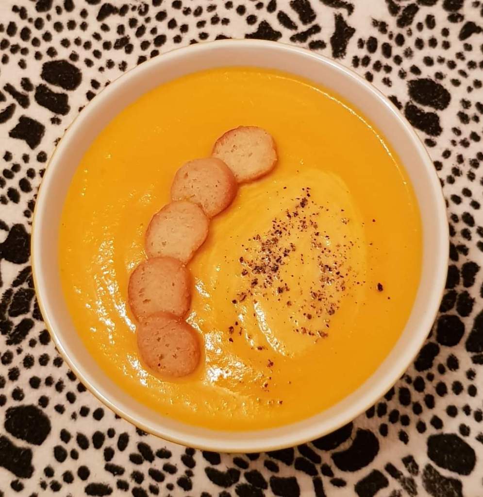 Ingrediente: 4 morcovi mari O ceapă roșie Un cartof dulce 2-3 linguri ghimbir proaspăt ras 2 linguri ulei de măsline extra virgin Sare Piper proaspăt măcinat 100ml smântână pentru gătit Mod de preparare Se curăță legumele. Se spală. Se taie rondele mai groase morcovii și cartoful dulce, ceapa se toacă, iar ghimbirul se rade. Într-o oală mai mică se pune uleiul de măsline, ceapa și ghimbirul și se prajeste 2-3 minute cât să își elibereze aromele. Apoi se adaugă morcovii și cartoful. Se mai lasă 2-3 minute la prăjit si se adaugă 1l de apă. Se condimenteaza cu sare și piper. Se lasă la fiert sub capac aproximativ 15-20 minute pana sunt moi legumele. Apoi se scot legumele și se mixeaza cu puțină supă. Se mai adaugă supă în funcție de consistența dorită. Se pune într-o oală mai mică înapoi pe foc și se adaugă smântâna pentru gătit. Se lasă un minut și se oprește focul. Se servește cu crutoane… ideale sunt cele cu aromă de usturoi 😋