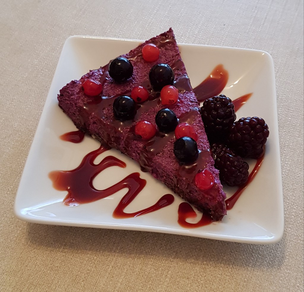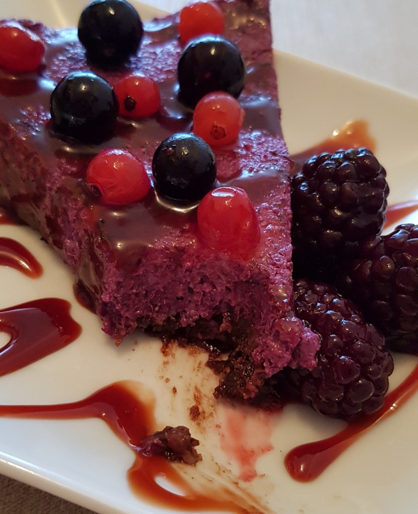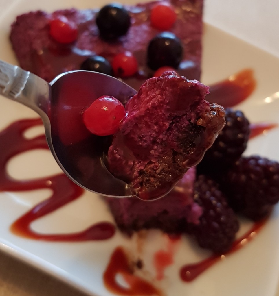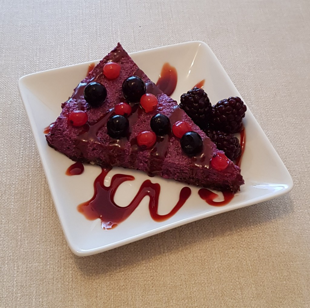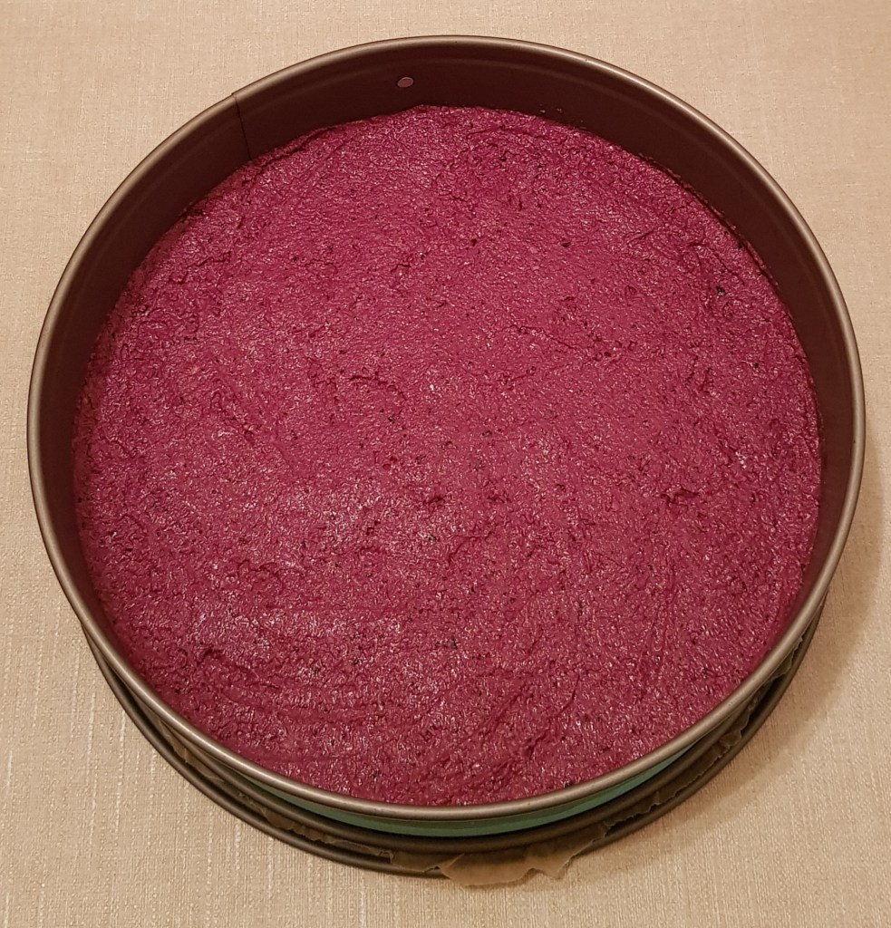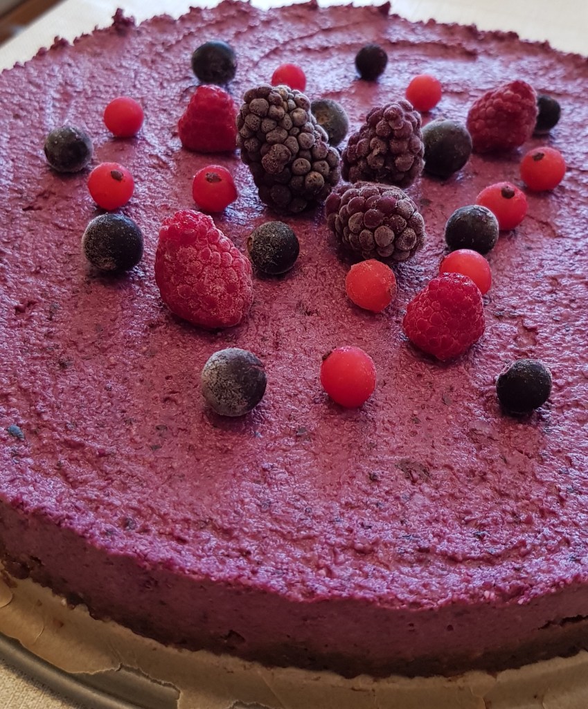 Pentru cremă se hidratează caju-ul minim 4 ore sau cel mai bine peste noapte. Apoi se scurge de apă și se pune în vasul unui blender. Se adaugă mierea, sucul de lămâie, uleiul de cocos topit, vanilia. Se procesează până se obține o cremă. Apoi se pune jumătate din crema obținută într-un bol. Se adaugă fructele de pădure congelate peste restul de cremă și se procesează din nou. Apoi se toarnă cele 2 creme alternativ peste blat.