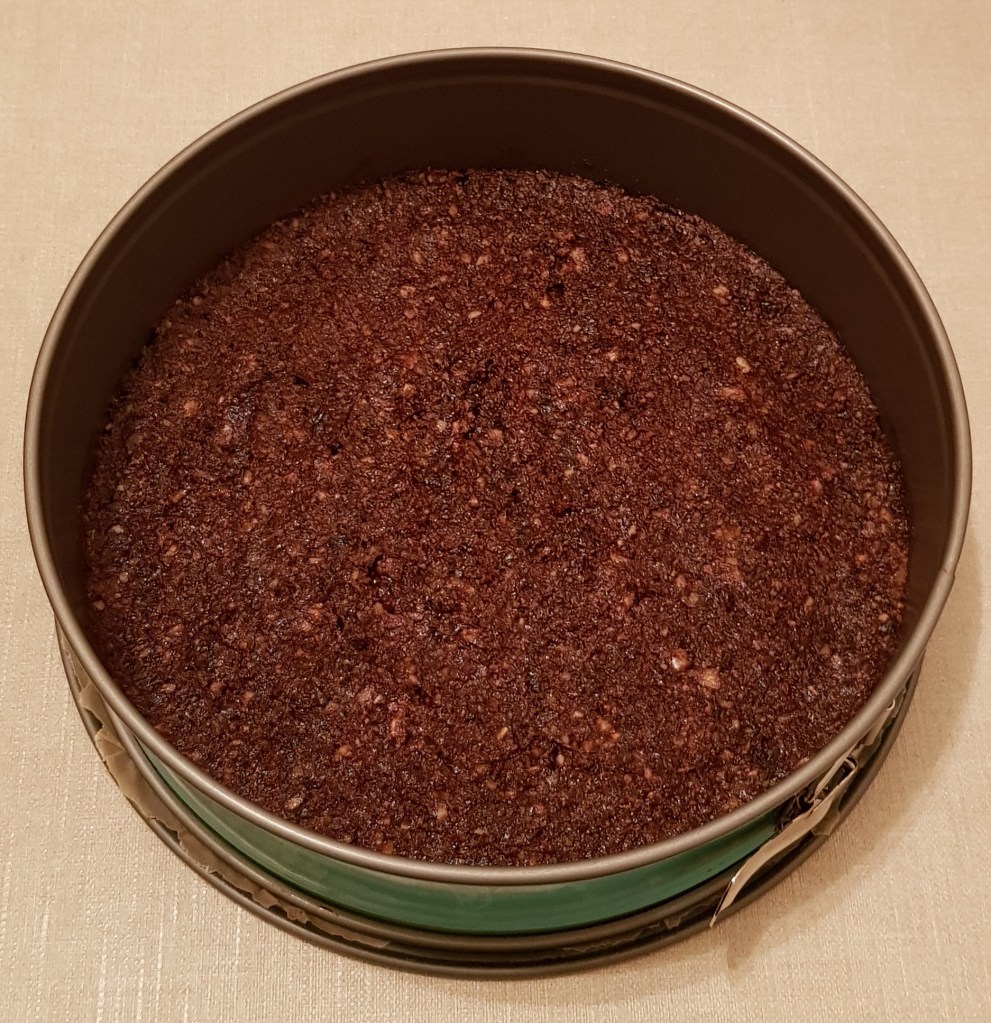 Pentru blat se adaugă în vasul unui robot de bucătărie migdalele, curmalele, fulgii de cocos, cacao, praful de sare. Se mixează până se obține fărâmituri. Apoi se adaugă 2-3 linguri de apă și se mai mixează până se obține un amestec lipicios. Se adaugă aluatul într-o formă cu pereți detașabili. Se presează ușor cu o lingură, apoi se pune tava deoparte până la prepararea cremei.